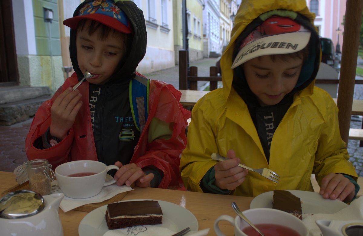 Když jsme dorazili na historické náměstí pod hradem, tak lilo jako z konve. Hodný pan vrchní nám dovolil pod velkým deštníkem spořádat řízky s chlebem. Za odměnu jsme to u nich trošku rozjeli. Dvojčata Mareček a Míša si poručili výborný ovocný čaj s kousky ovoce a "Míša řezy", Andrej a děda si dali nepřekonatelnou pravou valašskou kyselicu a já jsem z chutí vypila vychlazenou desítku.
