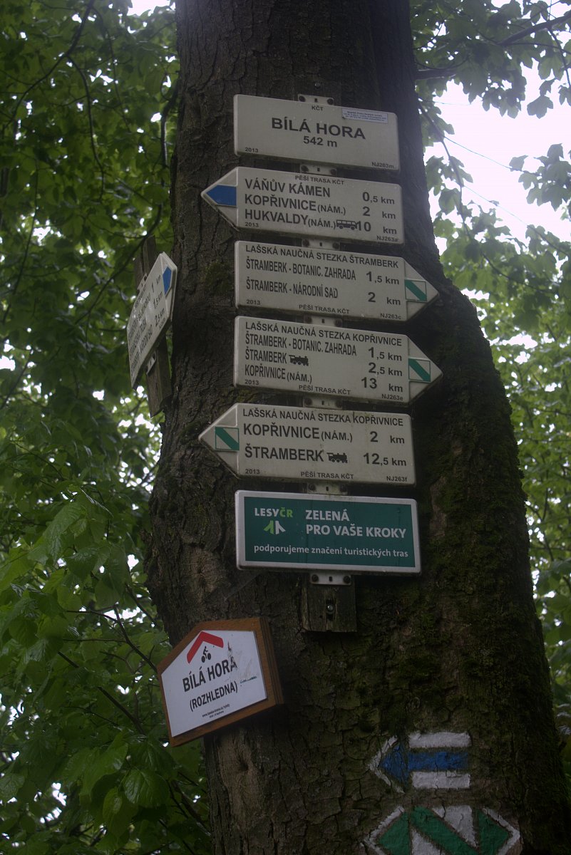 Na mapě jsme si prostudovali naši další trasu do Kopřivnice přes Bílou horu - ano máme u nás na Moravě taky Bílou horu i s rozhlednou. V botách nám čvachtala voda, ale na naší náladě nám to nic neubralo. Na Bílé hoře jsme si přečetli, že máme před sebou na náměstí do Kopřivnice už jen 2 km. Jenže pro déšť jsme asi přehlédli odbočku, tak jsme skončili v zahrádkářské kolonii za městem. To už přestávalo pršet, a tak jsme to nebrali tragicky. Ty 4 km navíc, co to pro nás je?.