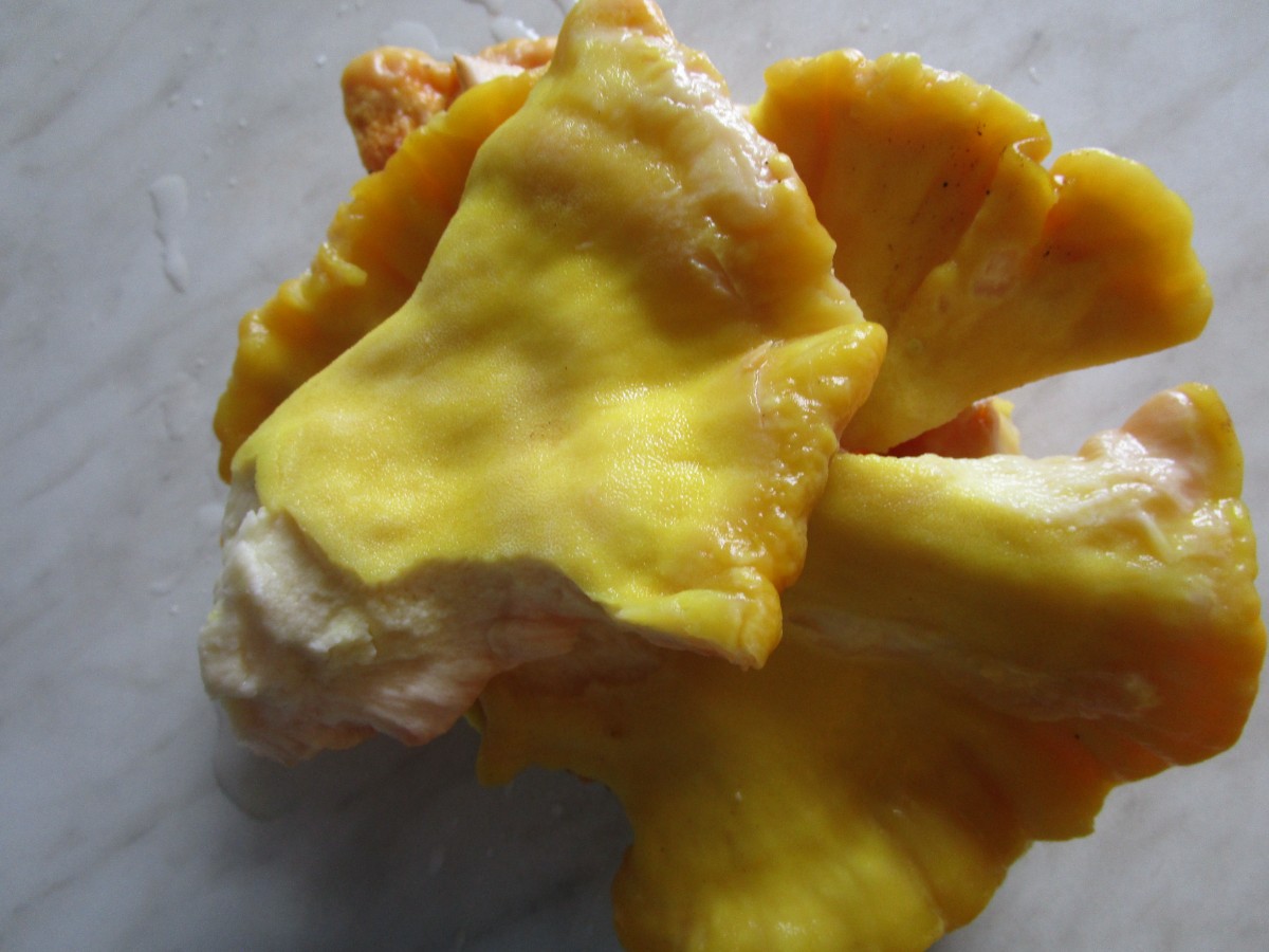 Vyzkoušela jsem houbu sírovec. Sírovec žlutooranžový  (choroš nebo chorošovec sírový) je vlastně parazit. Je to dřevokazná houba rostoucí na stromech, kterým škodí. Najdeme ji i v zahradě na ovocných stromech. Mladý sírovec je měkký a údajně má chutnat jako kuře. Vyrostl i u Pinkásků na třešni a ti mi ho kus věnovali, abych si ho mohla vyzkoušet.