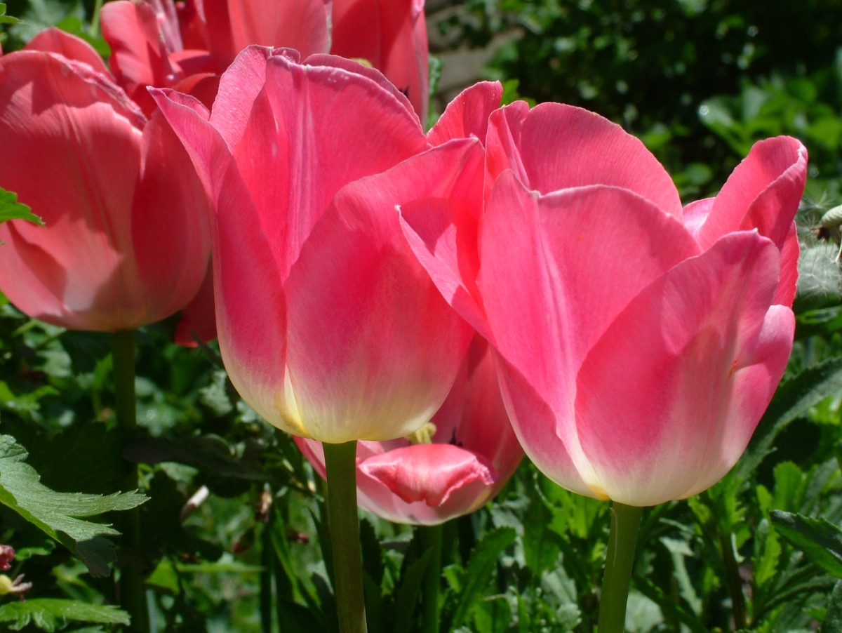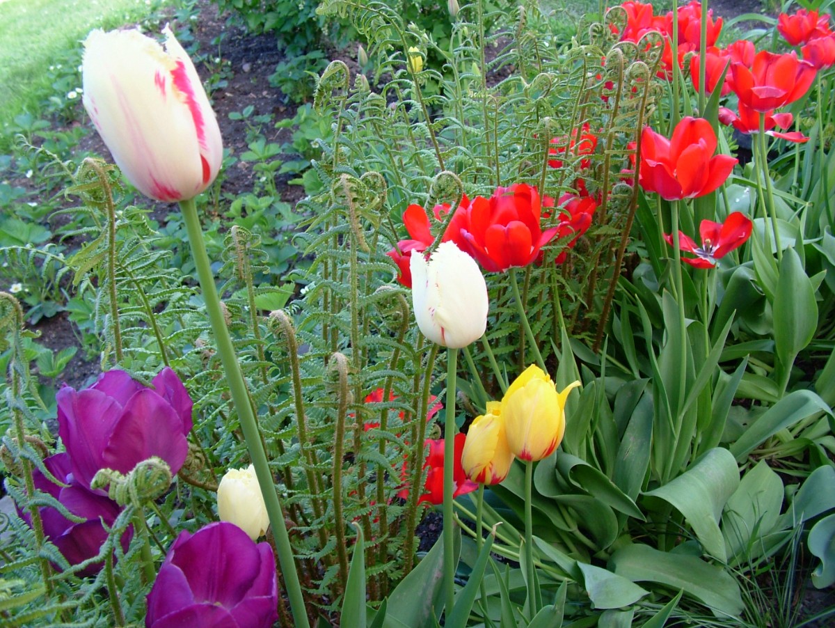 U nás začínají malé skalkové červené, při nich už kvetou tmavě fialové. Po nich následují červené, červené s bílými proužky a žluté žíhané. Z těch byly často poháry plné vody. Dále bílé třepenité s proužkem červeným, pak růžové. Pozdní jsou žluté, ty kvetou spolu s vytrvalými bílými docela pěkně ještě začátkem června. S nástupem letního tepla tulipánová štafeta končí. Už teď pomalu předává svou zdobící úlohu pivoňkám, kosatcům, kopretinám a dalším červnovým kráskám.