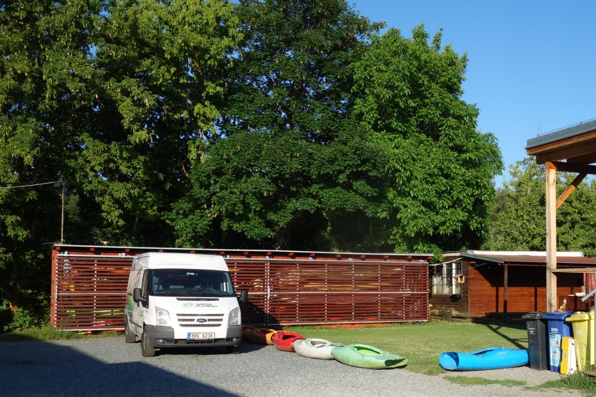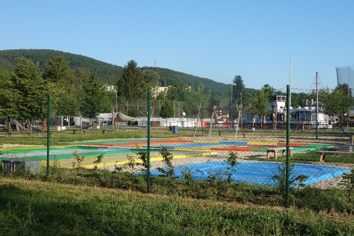 A tak vyrážíme k řece kolem dětského dopravního hřiště, kolem počítačové firmy, trolejbusového depa. Vtom nás míjí tramvaje. A jedna je růžovo-modrá. Hurá. Přecházíme Svratku - most má modrou barvu- ale foto se mi nelíbí. Dále jdeme kolem sportovního areálu HROCH. Je brzy ráno, skákací bubliny jsou ještě sfouknuté a na parkovišti, které vždy praská ve švech, je jen pár aut. Občerstvit se taky nemůžeme, parník ještě neotevřel. Pokračujeme podél řeky, kde je půjčovna kanoí, kajaků a paddleboardů.