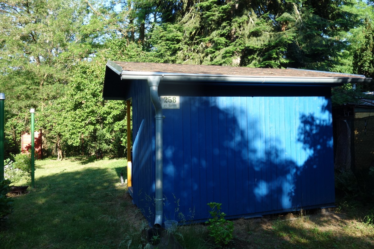 Jdeme dál,....Cesta není moc široká, ale slouží jako cyklostezka. Občas někdo běží, jede na kole. Bruslaři a maminky s kočárky asi ještě spí, je teprve 7 hodin. Nakukuji do zahrádek. Tu je modrá chatička, tu modrá vrátka, sud na vodu, hrábě.