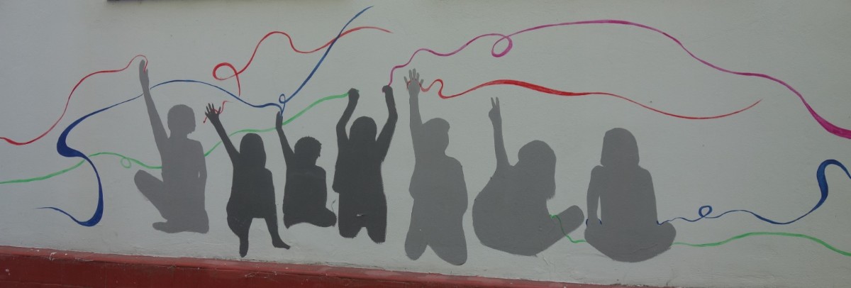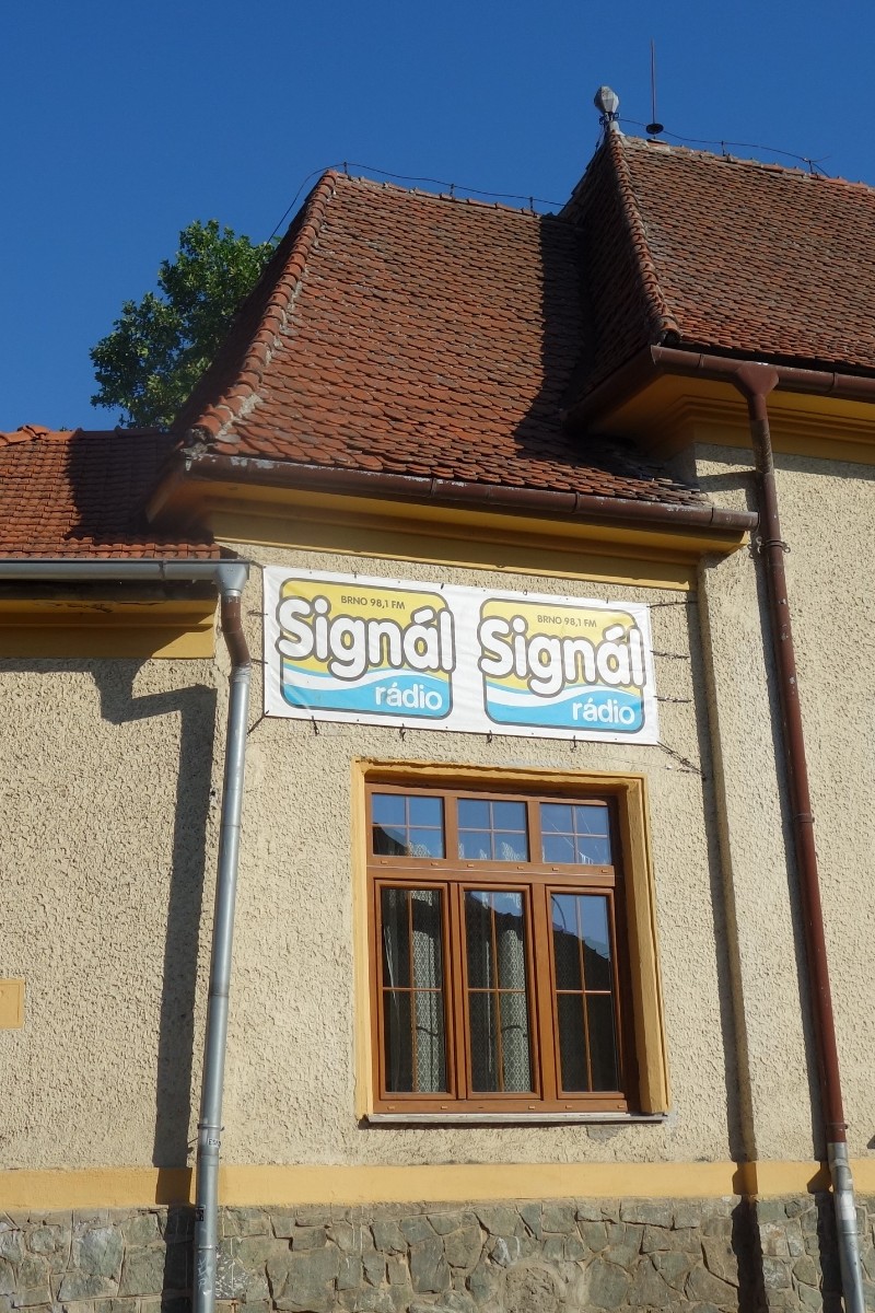 Blížíme se k Sokolovně, kde je na zdi pěkná malůvka a míříme od řeky zpět do sídliště kolem několika hospůdek. Jednu hyzdí na fasádě reklama na RADIO SIGNÁL To úplně nesnáším, teda tu reklamu. Začíná být vedro, jdeme kolem otevřených oken rodinných domků. V jednom vidím pěknou puntíkatou záclonu.