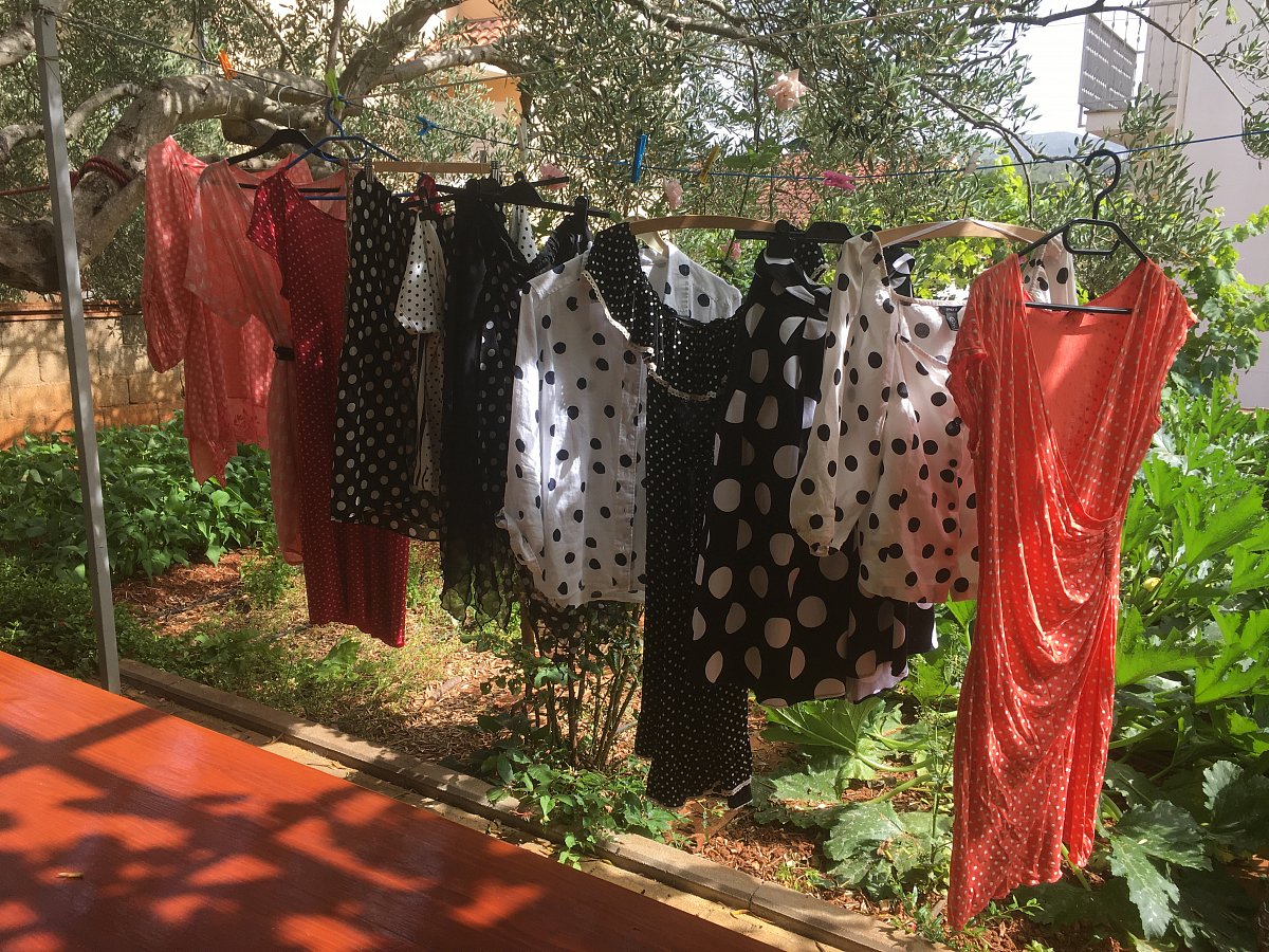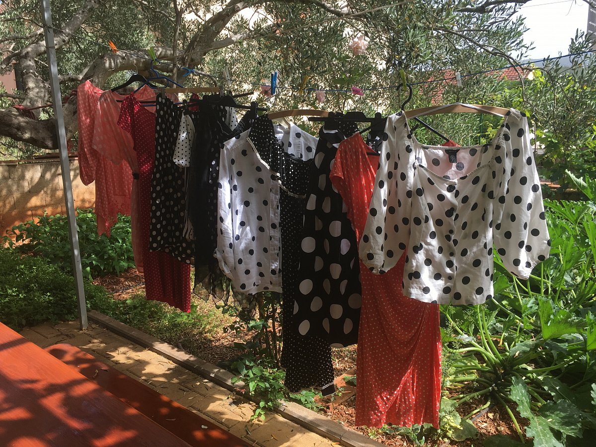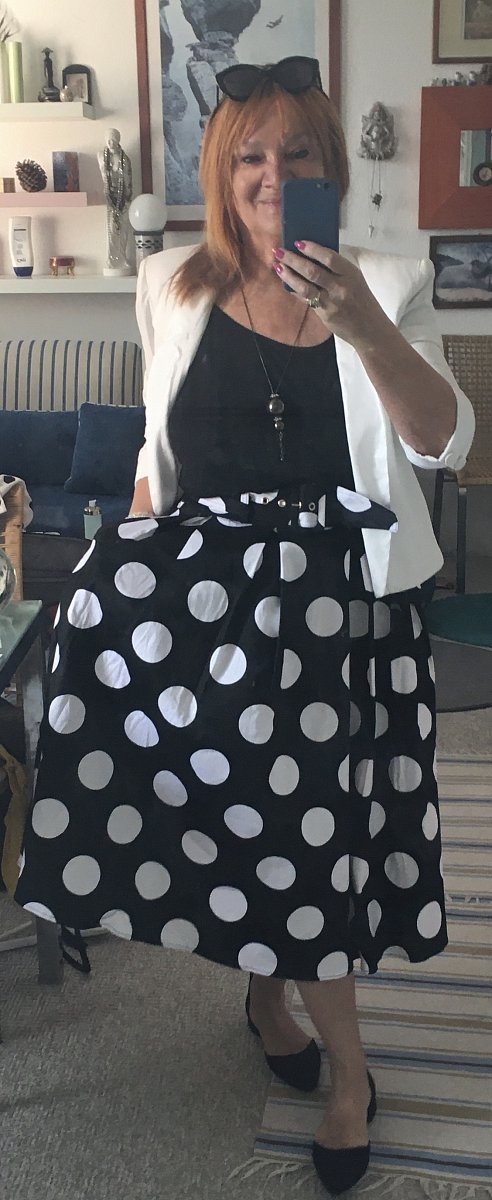 Milá paní Hofmanová mne inspirovala svým článkem k tomu, abych trochu probrala skříně. Mám totiž puntíky ráda, ale nikdy by mne nenapadlo, abych udělala jakousi inventuru. Je fakt, že zde u moře mám jen část garderoby, o to více mne překvapilo, že na šňůře se objevilo 11 kousků. Klasika je černo bílá, ale mám ráda i růžovou, lososovou, červenou a Zuzaninu oblíbenou oranžovou. Milá děvčata, jelikož vím, že jsme zde parádnice a „modelky“, třeba vás moje „šňůra“ zaujme. Sukni jako z let Starců na chmelu, s velkými bílými puntíky, jsem si koupila na Zličíně před odletem. Radost byla veliká. A to je účelem nákupu, který zase až tak moc nepotřebujeme, že, děvčata...:).  Tak sláva létu a puntíkům!