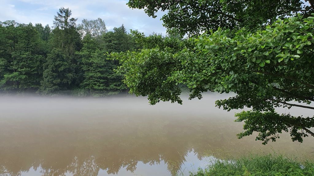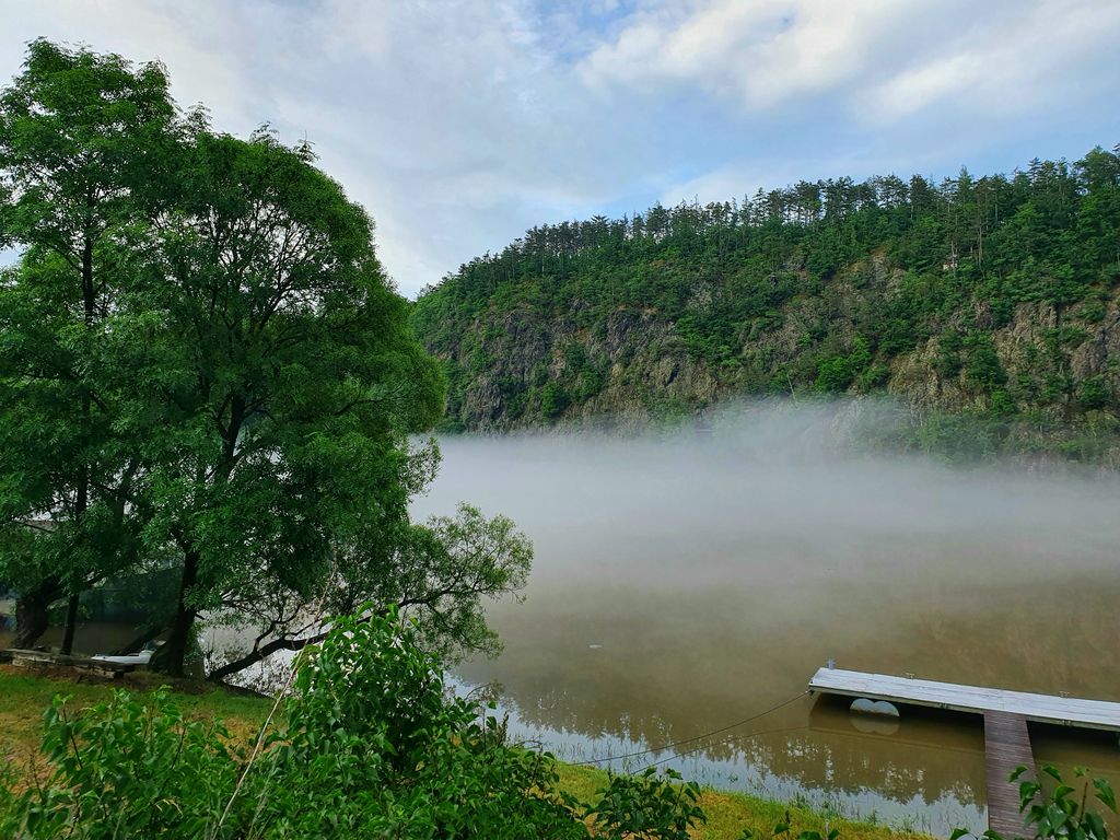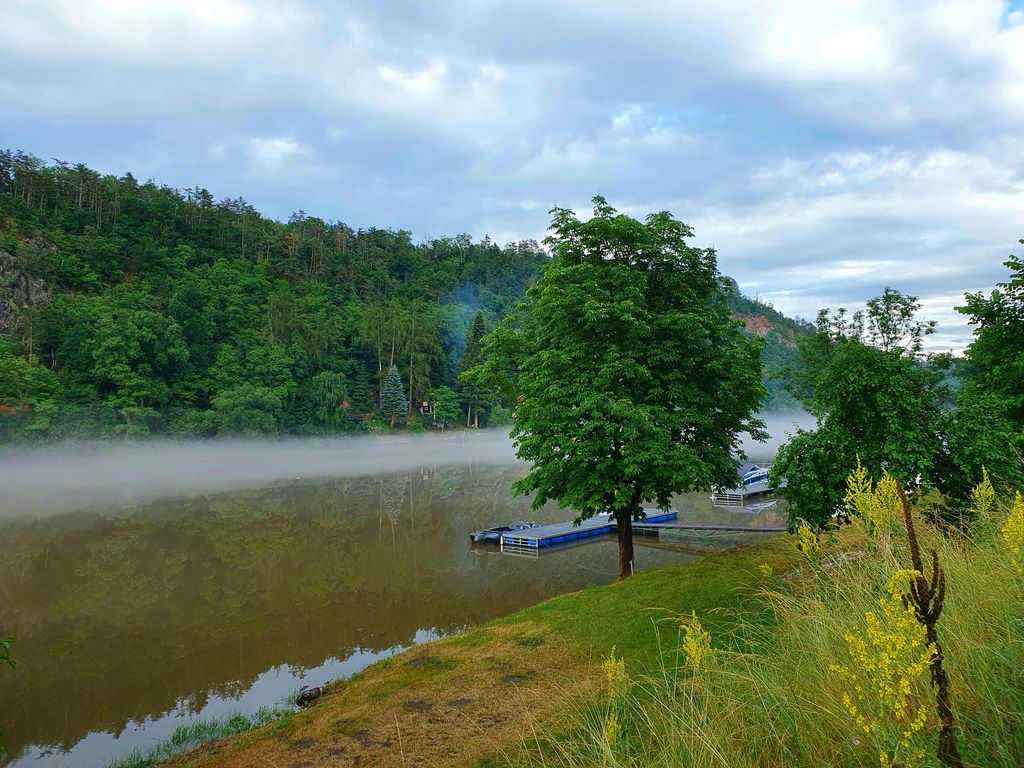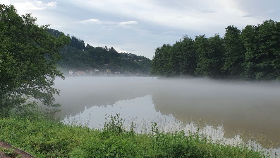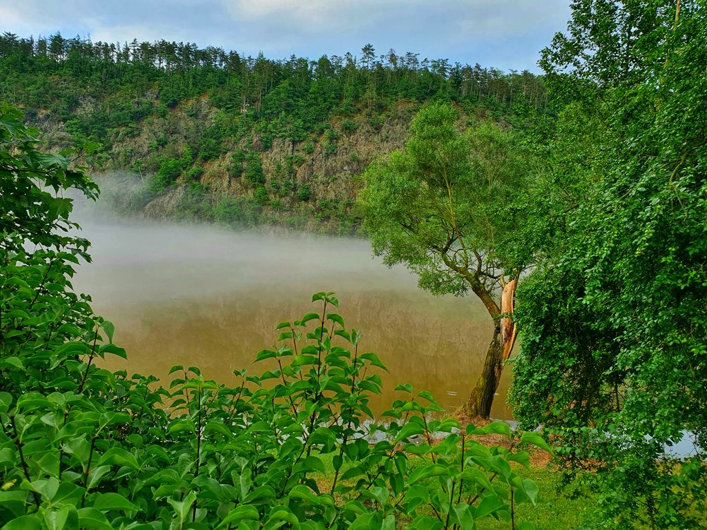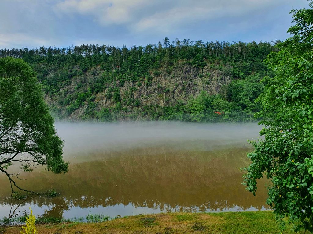 Po posledních horkých dnech, bouřkách a dešti se nyní Vltava k večeru zahalila do mlžného oparu. Vznášel se nad její hladinou a řeka vypadala rázem jinak než obvykle. Byla tak tajemná, tichá a klidná. Nikde nikdo. Nedalo mi to a seběhla jsem ze silnice k ní. Zasnila se a ocitla se málem v pravěku, ovšem kdyby mne každou chvíli nerušily konvoje aut projíždějících nade mnou.