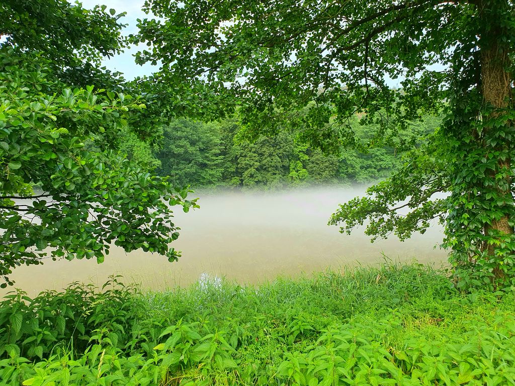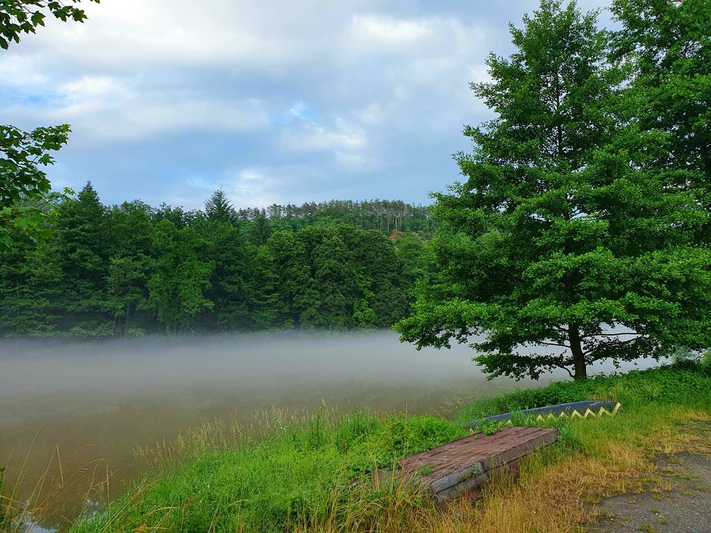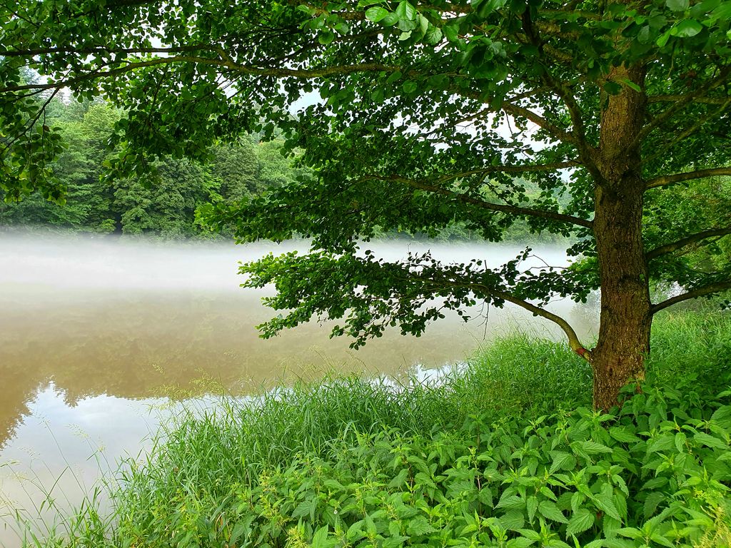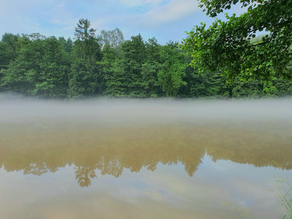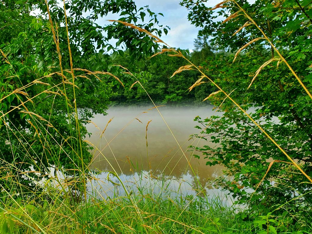 Po posledních horkých dnech, bouřkách a dešti se nyní Vltava k večeru zahalila do mlžného oparu. Vznášel se nad její hladinou a řeka vypadala rázem jinak než obvykle. Byla tak tajemná, tichá a klidná. Nikde nikdo. Nedalo mi to a seběhla jsem ze silnice k ní. Zasnila se a ocitla se málem v pravěku, ovšem kdyby mne každou chvíli nerušily konvoje aut projíždějících nade mnou.
