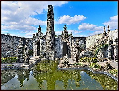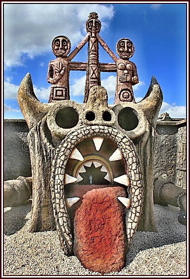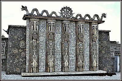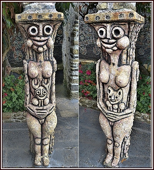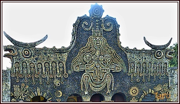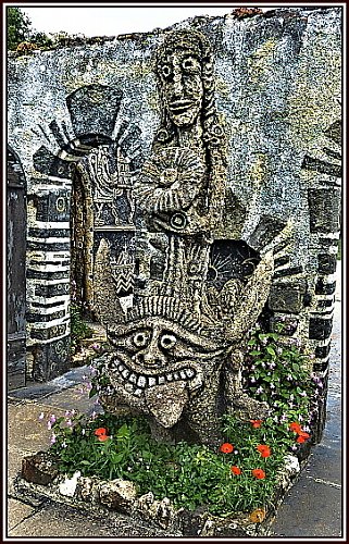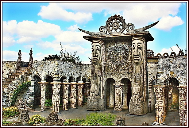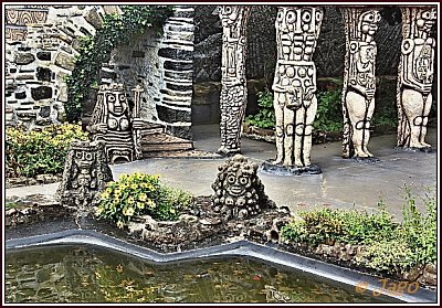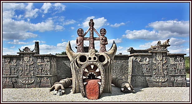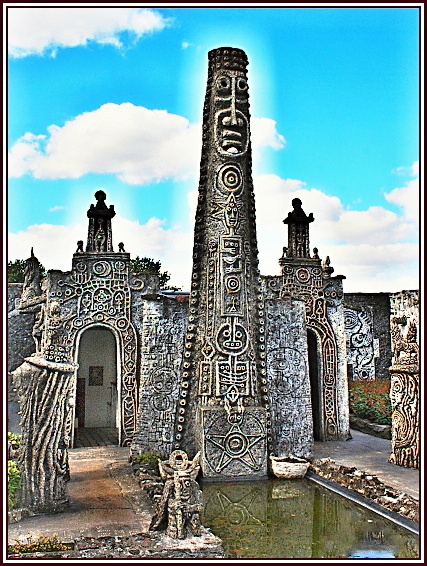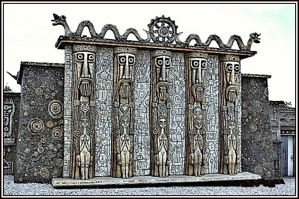 Brána gigantů. Zvnějšku na zdi Zahrady meditací (viz dále) je veliký reliéf představující pět velkých malířů, které Tatin nejvíce uznával. Zleva: Rembrandt, van Gogh, Leonardo da Vinci, Goya a Delacroix.