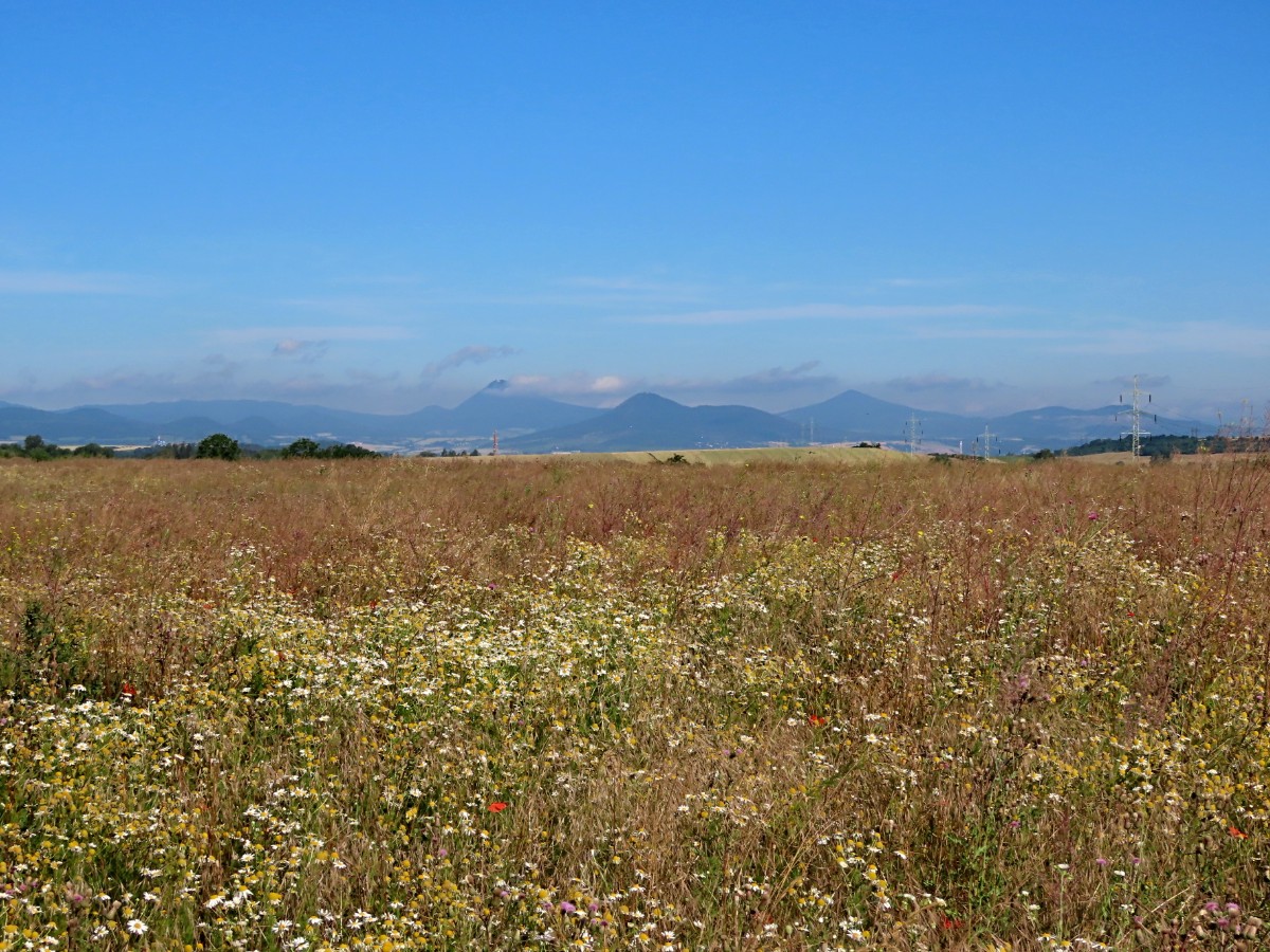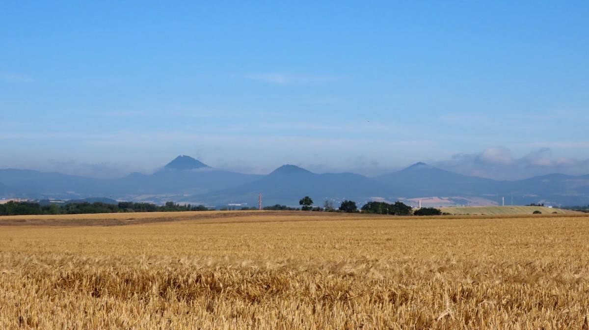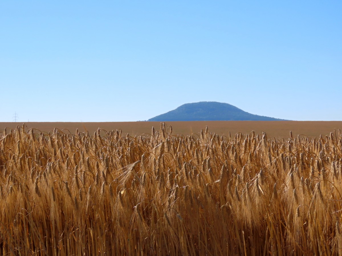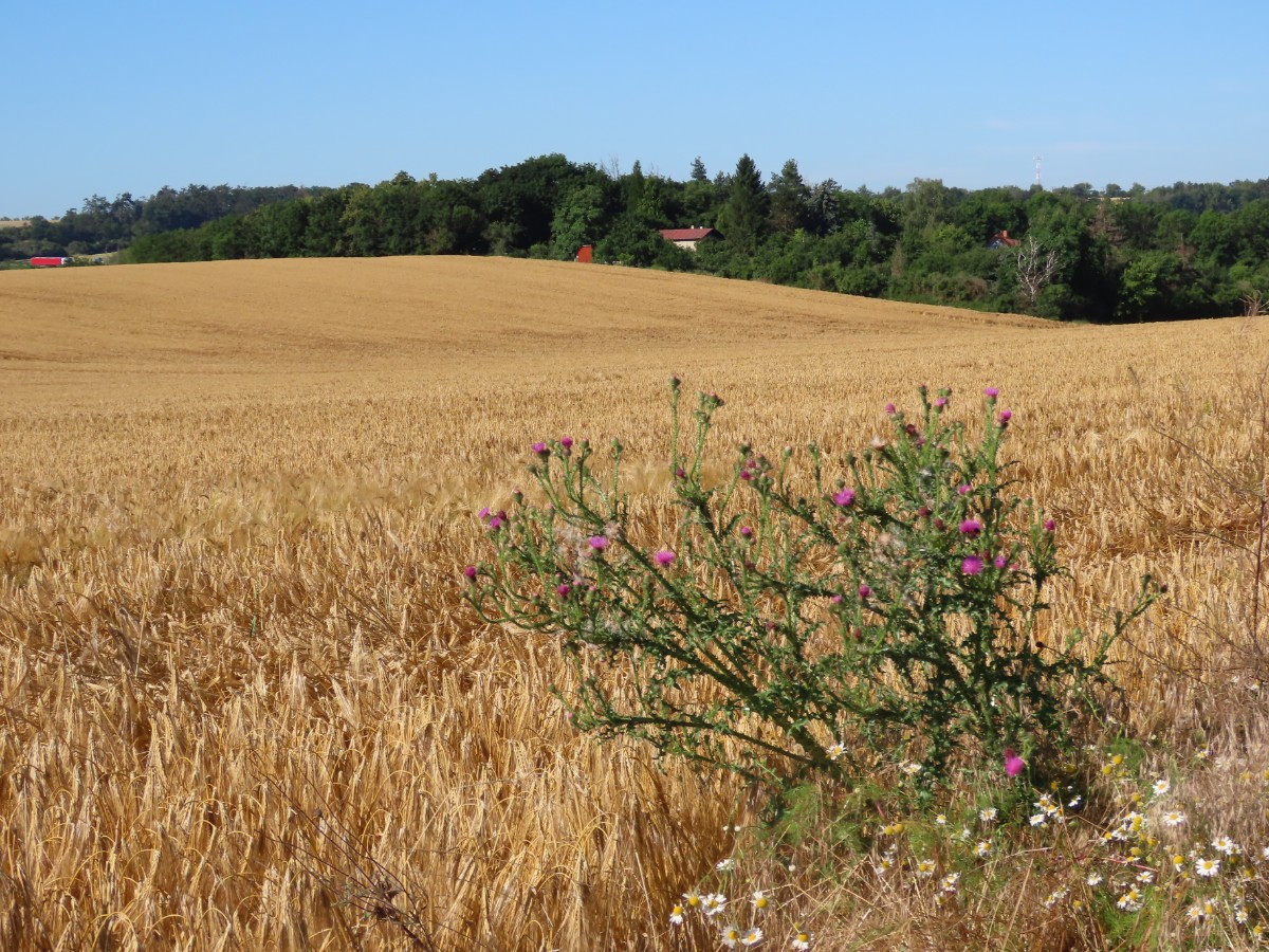 Co nejrychlejším krokem jsem se snažila dostat na kraj města. Hned za posledním domem se táhnou zlátnoucí lány a mezi nimi se vine polní cesta. Na obzoru někdy je a někdy zase není vidět hradba vrcholů Českého středohoří. V tuto časnou hodinku stály kopečky hezky vedle sebe jako vymalované, ozářené ranním slunkem. Královnu středohoří Milešovku se snažil políbit mráček. Ráda tudy chodím v každém ročním období, každé má něco do sebe. Ale přece jenom teď, kdy se zelené lány před očima mění ve zlato, sem tam protkané červenými máky, modrými chrpami či bílým rmenem, je nejkrásnější. Za chvíli přijedou zatím vyčkávající kombajny a pole změní v pichlavá strniště. Kdo by na to ale myslel právě teď, když je tak krásně?