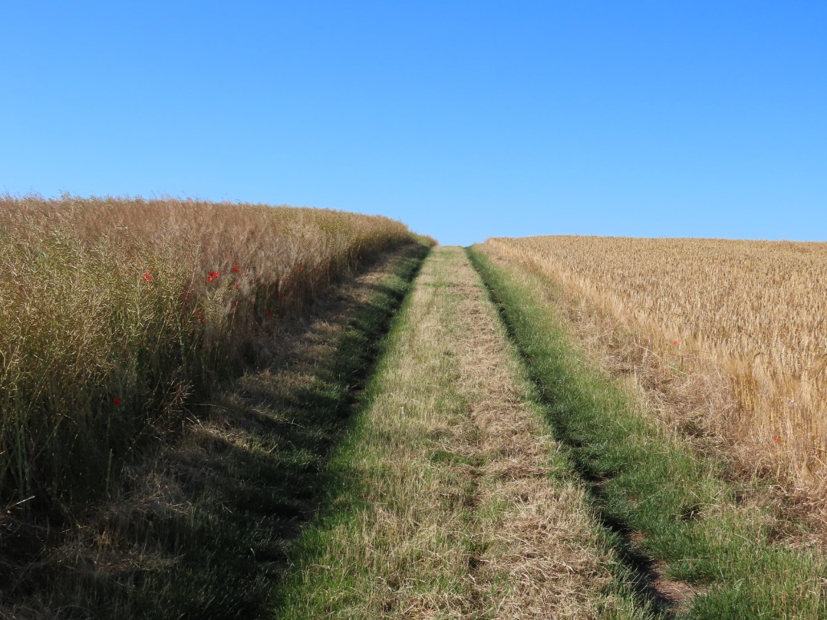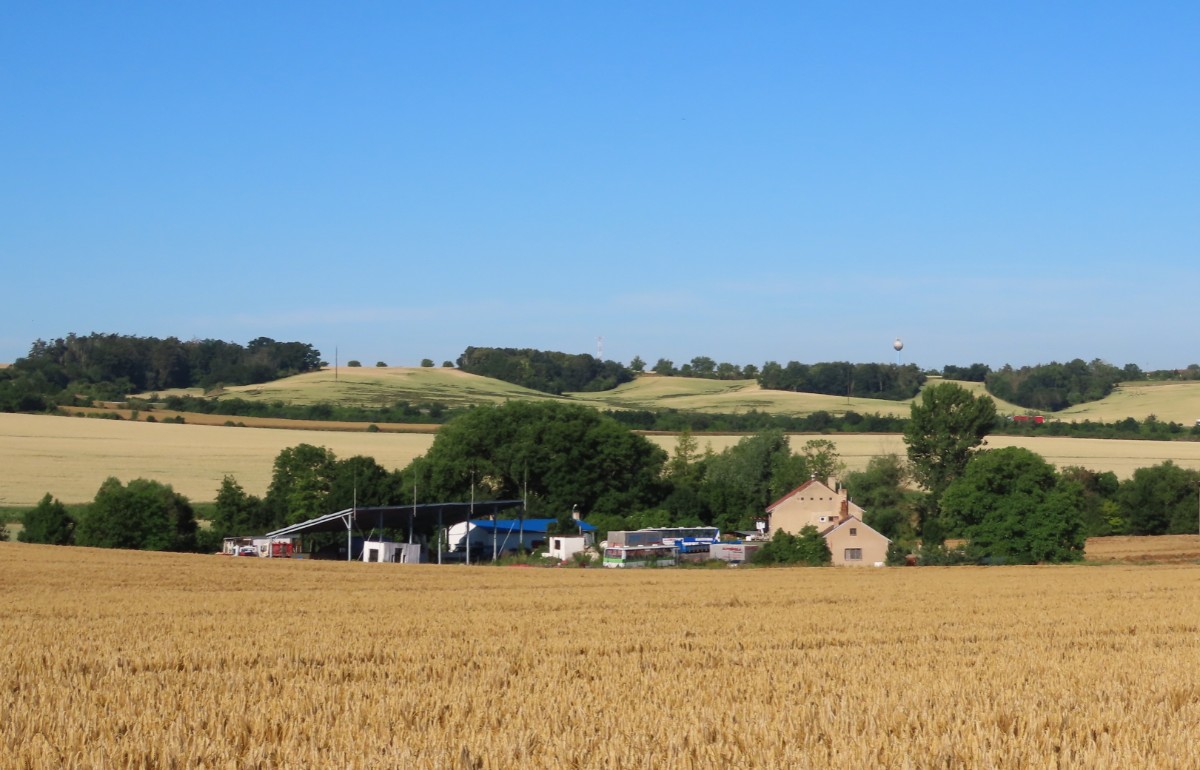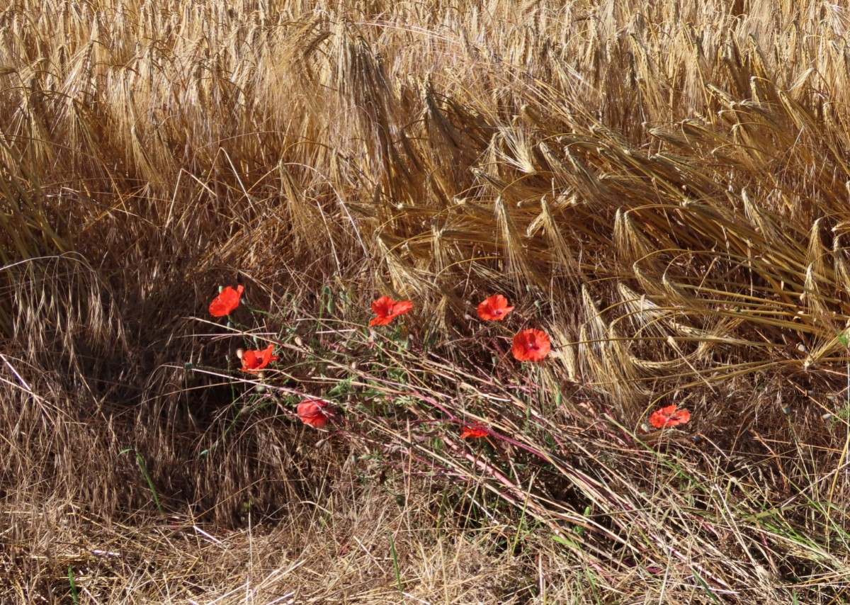 Co nejrychlejším krokem jsem se snažila dostat na kraj města. Hned za posledním domem se táhnou zlátnoucí lány a mezi nimi se vine polní cesta. Na obzoru někdy je a někdy zase není vidět hradba vrcholů Českého středohoří. V tuto časnou hodinku stály kopečky hezky vedle sebe jako vymalované, ozářené ranním slunkem. Královnu středohoří Milešovku se snažil políbit mráček. Ráda tudy chodím v každém ročním období, každé má něco do sebe. Ale přece jenom teď, kdy se zelené lány před očima mění ve zlato, sem tam protkané červenými máky, modrými chrpami či bílým rmenem, je nejkrásnější. Za chvíli přijedou zatím vyčkávající kombajny a pole změní v pichlavá strniště. Kdo by na to ale myslel právě teď, když je tak krásně?