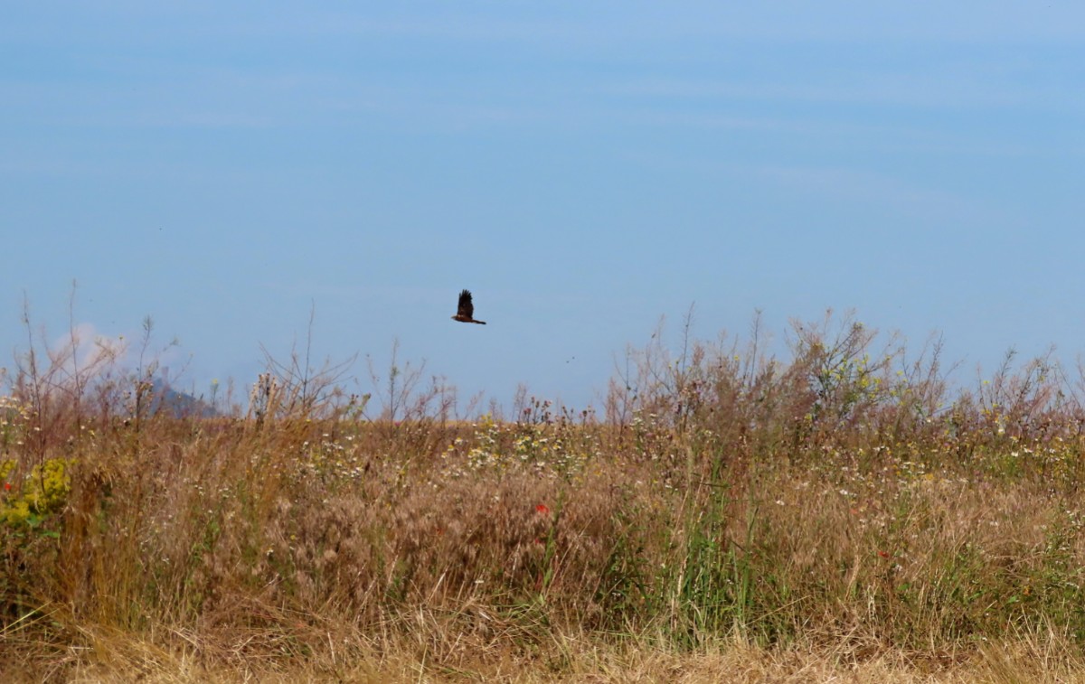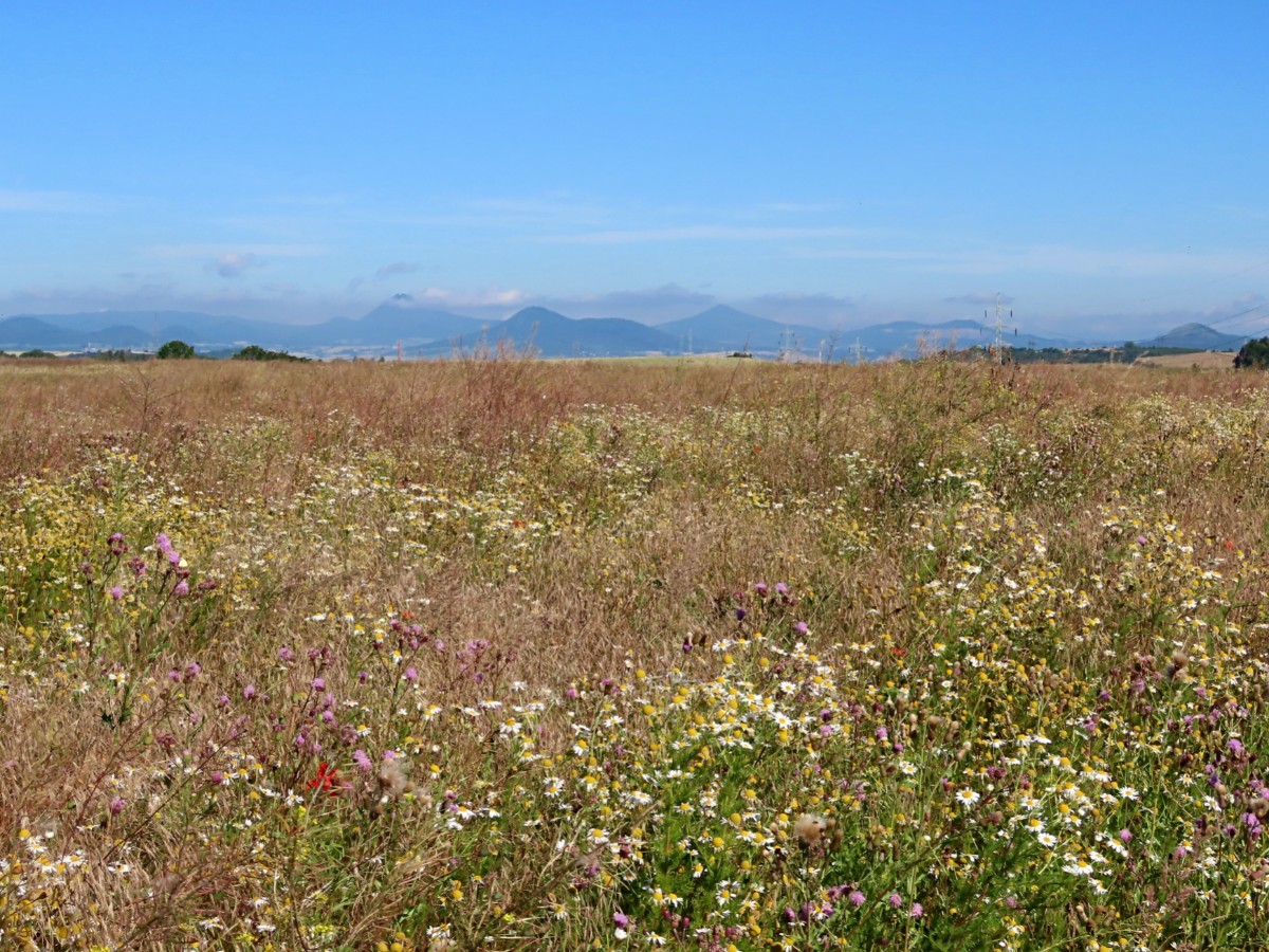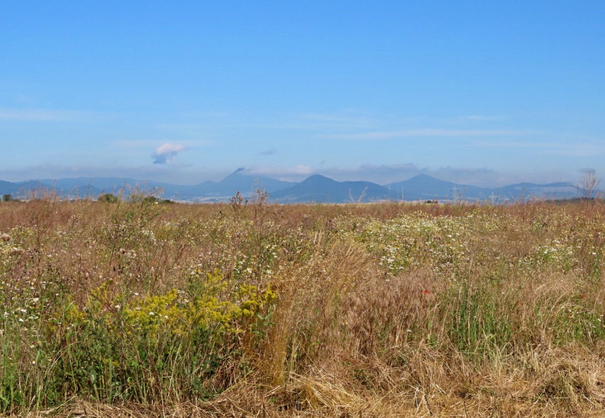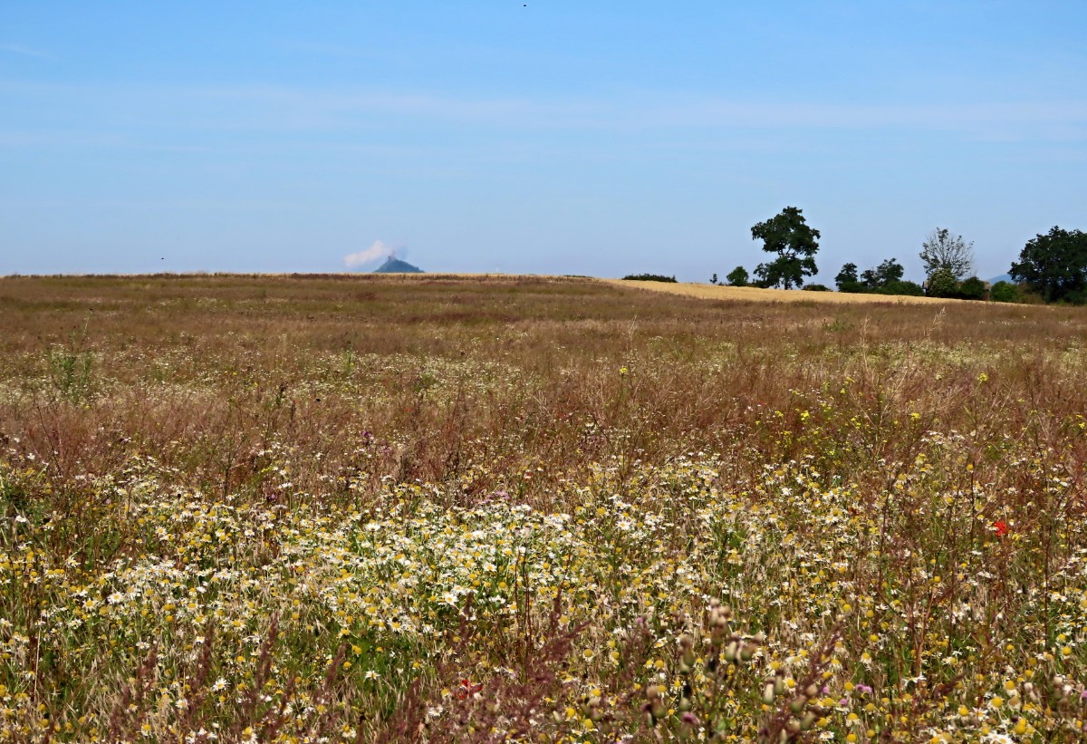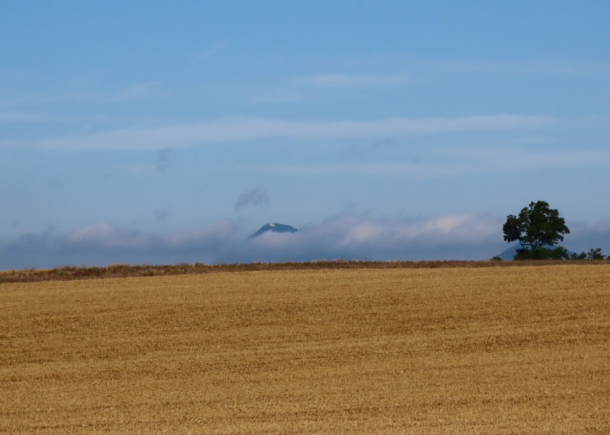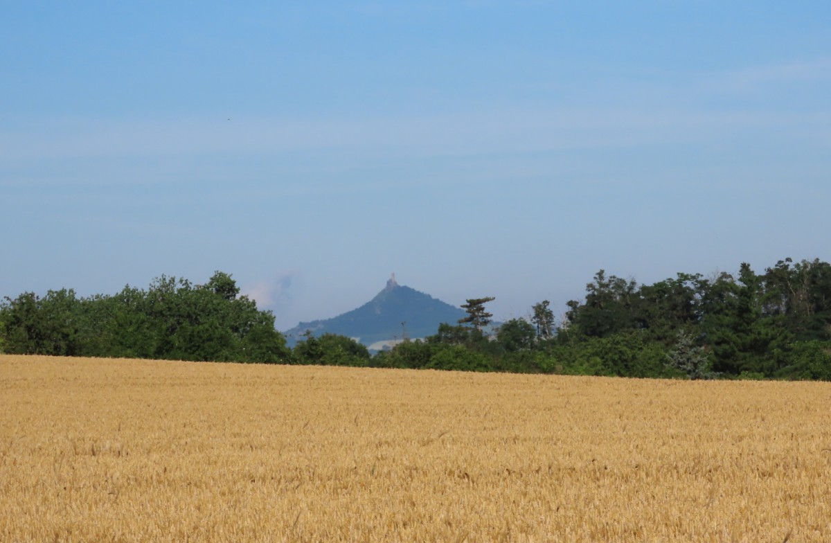Vyšlapovala jsem si, proti mně na obzoru Házmburk v nezvyklém pohledu. Po chvíli cesta uhýbá ostře doprava, zvolna stoupá a zdá se, že je téměř nekonečná. Znám ji velmi dobře, a přesto zas a znovu žasnu a divím se, jako bych tu byla poprvé. V krajině jsem po ránu byla úplně sama, v tuto dobu mě neprovázeli ani skřivánci. Slunce se do mě začínalo opírat a v duchu jsem se na sebe zlobila, že jsem nevyrazila dřív. Vystoupala jsem k nejvyššímu bodu s nejlepším výhledem a vyplašila káni, která rychle vyletěla do výše. Zřejmě jsme se trochu lekly obě. Chvíli jsem se rozhlížela a kochala barvičkami a po pořádném doušku vody se vydala na zpáteční cestu.