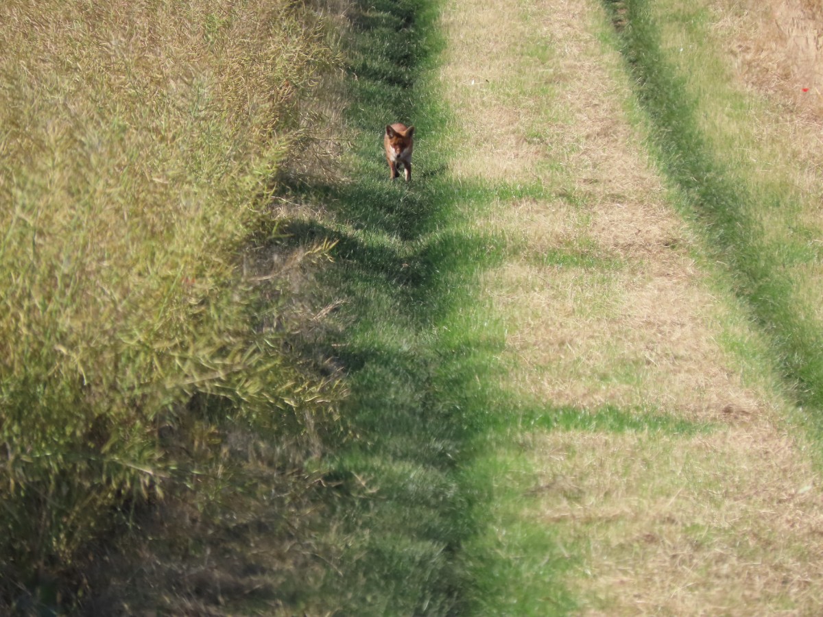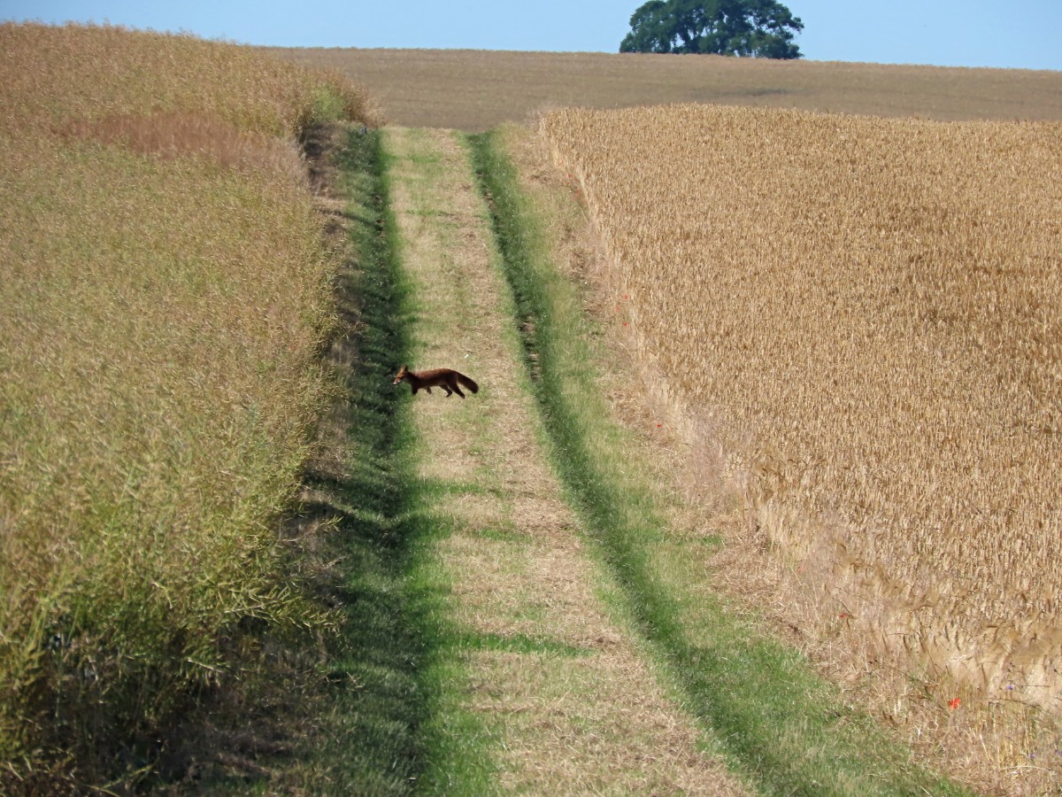 Dívala jsem se bůh ví kam, když mou pozornost přitáhl pohyb na cestě daleko přede mnou. Takovou siluetu znám jen z obrázků, že by? Chtělo se mi protřít oči, ale to bych ztratila drahocenné vteřinky, které nesmím promarnit! Instinktivně jsem navyklým pohybem hledáček fotoaparátu přiložila k oku a nevěřícně zírala. Nezdálo se mi to, spatřila jsem opravdovou živou lišku! V těchto místech bych ji opravdu nečekala. Byla tak daleko, že o mně asi nevěděla. Vydala se po cestě směrem ke mně a já jsem dychtivě mačkala spoušť. Prodleva mezi jednotlivými záběry se mi zdála nekonečná. Když už jsem doufala, že přijde tak blízko, aby fotky byly koukatelné, skokem zmizela ve vysoké řepce. Ozval se z ní ryk a liška si pravděpodobně ulovila snídani. Pózování se nekonalo. Také můj žaludek se začínal ozývat, slunce už nemilosrdně pálilo a bylo na čase zrychlit krok.
