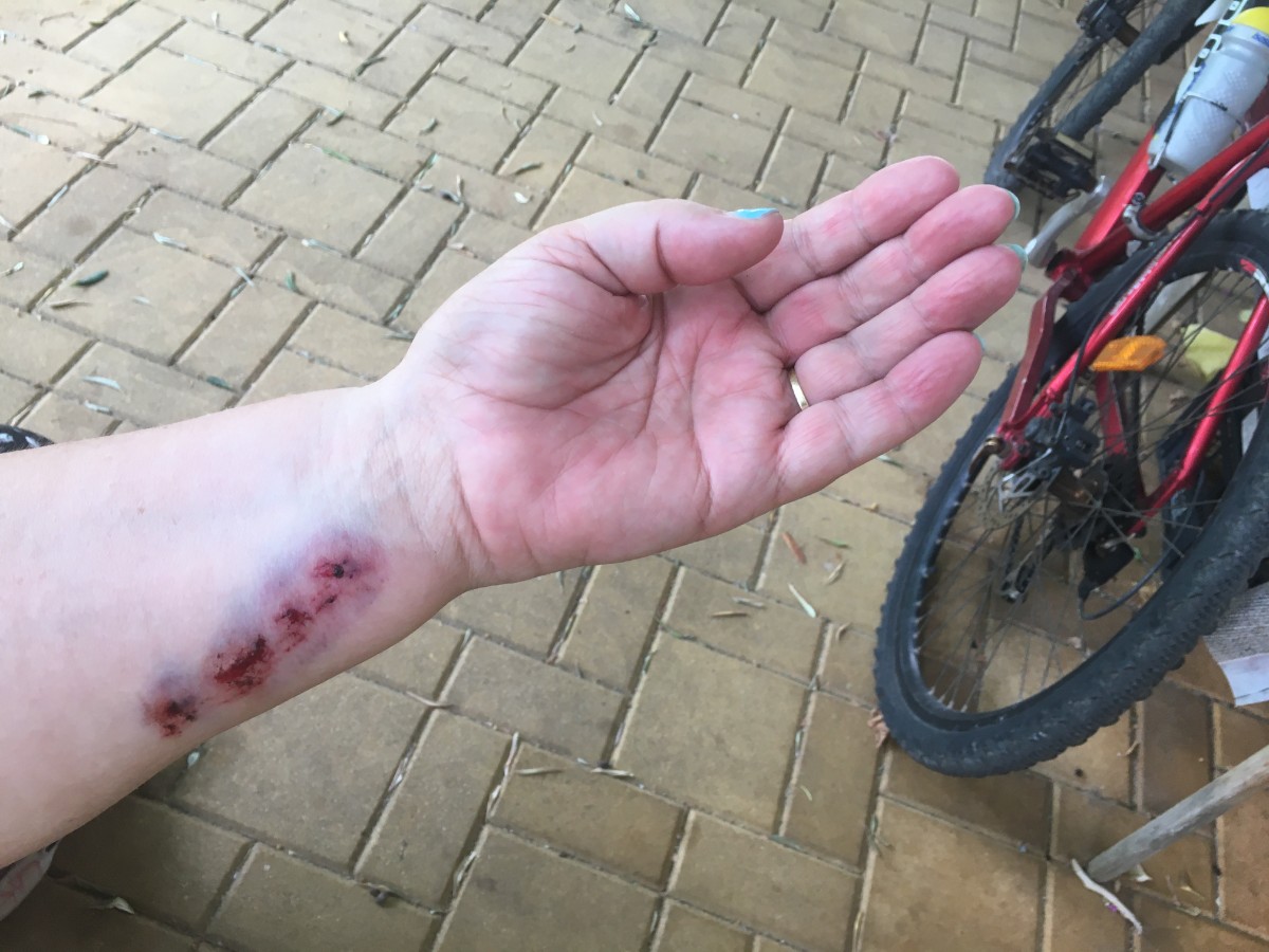 Ale je to jen odřenina, ruka nebolí a je funkční, řídítka udržím, jedeme dál.