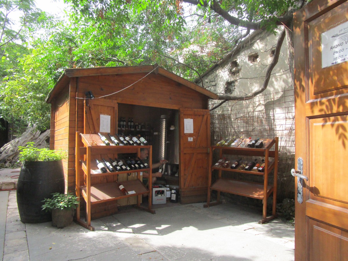 Obloha už se trhá a začíná horko. Pohled do vinotéky ve dvorku domu.