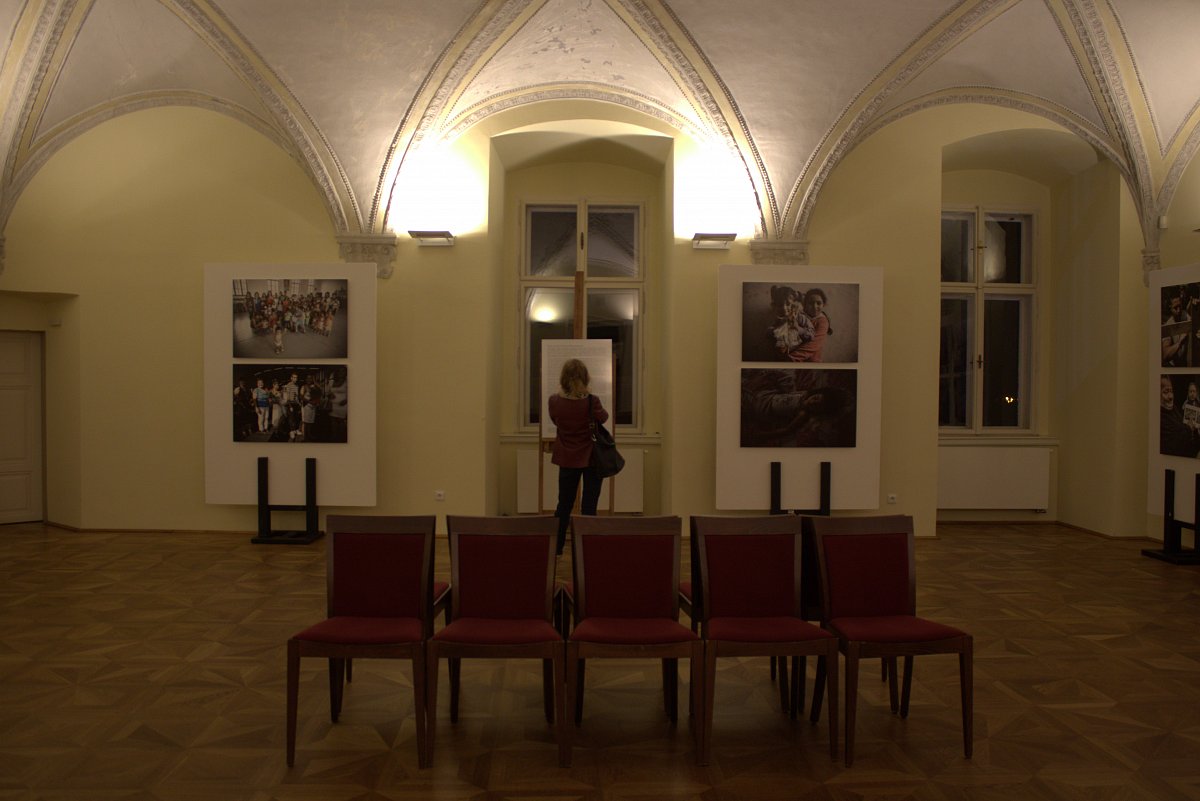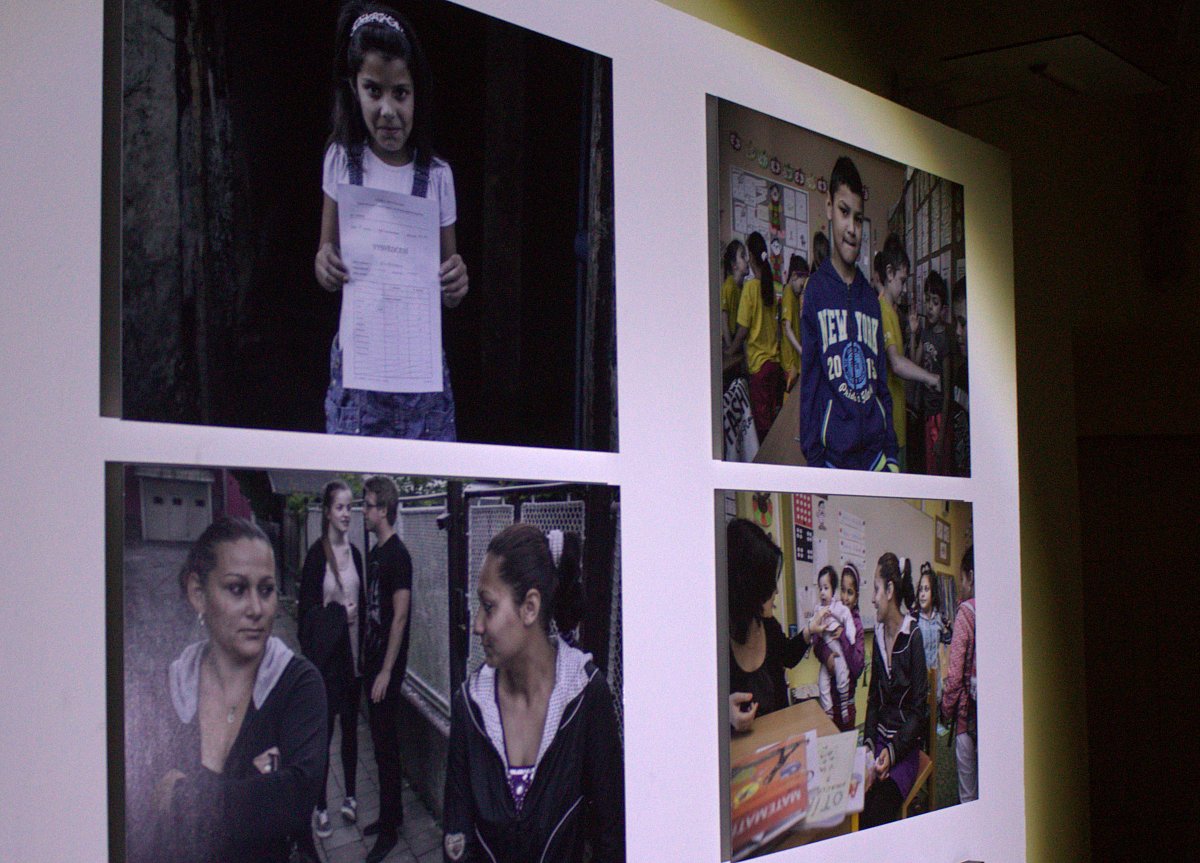 V prvním sále jsou fotografie ze života Romů, hlavně z města Krnova. Vedení města přistupuje k této komunitě velmi specificky a tento přístup přináší dobré výsledky. Z dvaceti začleněných dětí do normálních škol mělo deset na vysvědčení vyznamenání. Rodiče těchto dětí podporují vzdělávání svých dětí a obci se úspěšně daří začleňovat Romy do společnosti.