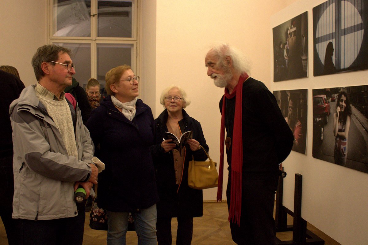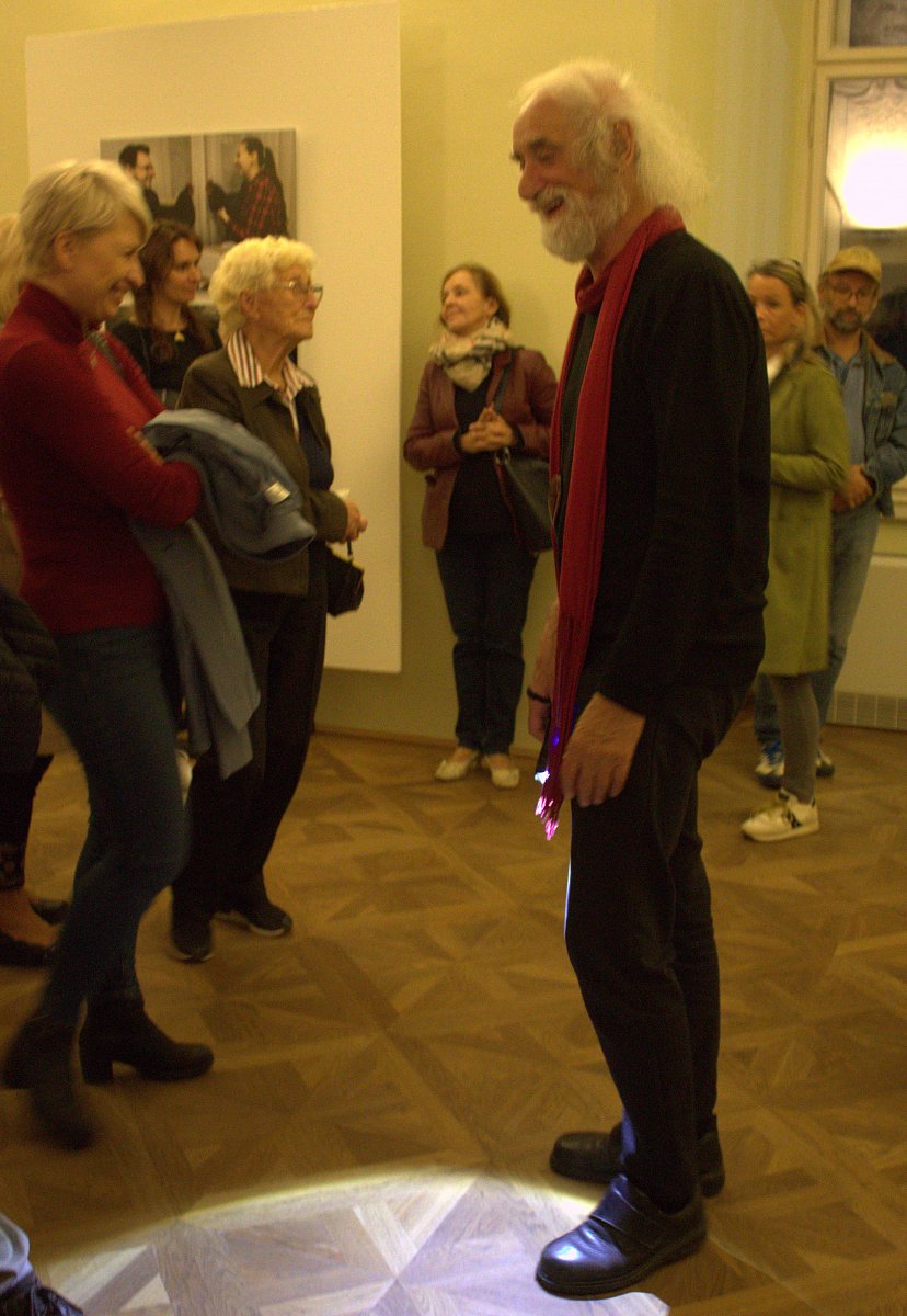Pořizování fotografí z tohoto vydařeného večera bylo velmi těžké. Příchod do výstavních sálů byl jen za světel ze zapálených svíček na schodech. Prohlídka fotografií byla ve světle baterky, a kužel světla se odrážel od výstavních panelů. Po prohlídce každého sálu bylo rozsvíceno, ale osvětlení bylo velmi slabé. Použití blesku při fotografování nebylo vhodné. Přesto věřím, že pořízené fotografie se budou líbit a možná někoho i inspirují k návštěvě zajímavé výstavy. Povolení k fotografování jsem dostala přímo od mistra. Ještě dodám, že celý večer snímala kamera ČT.