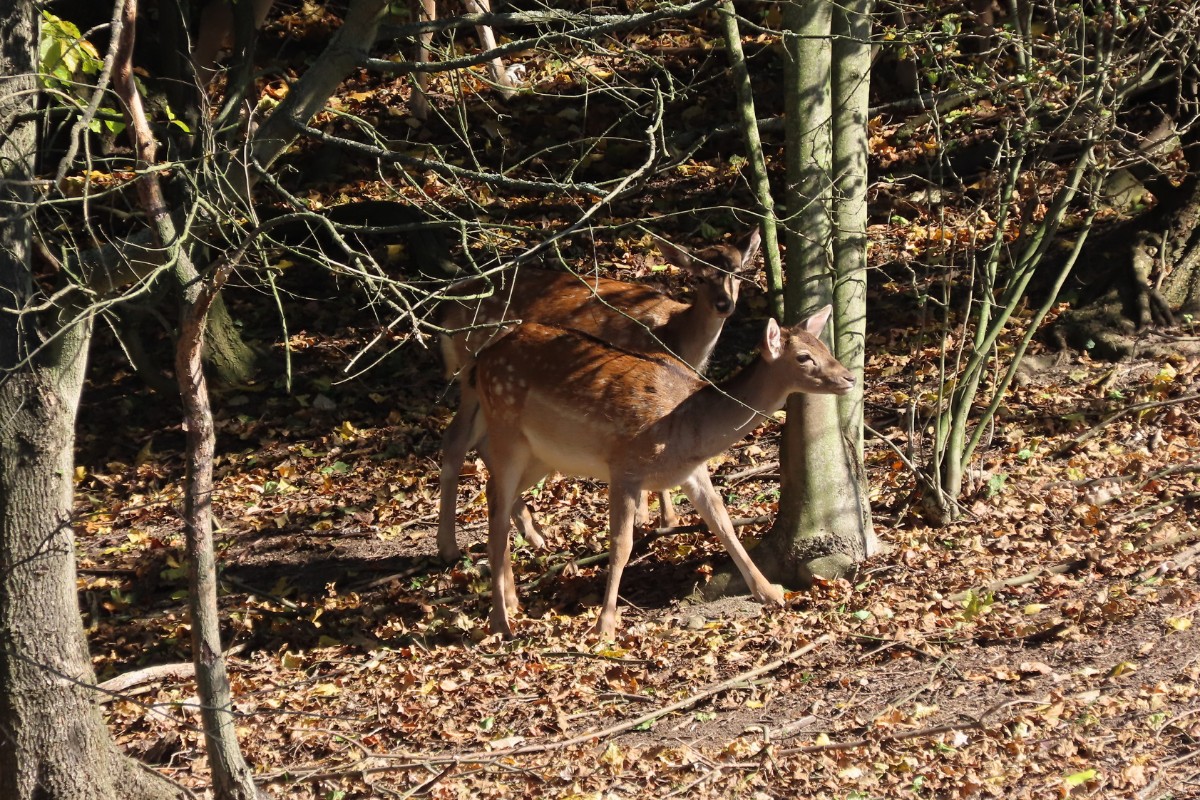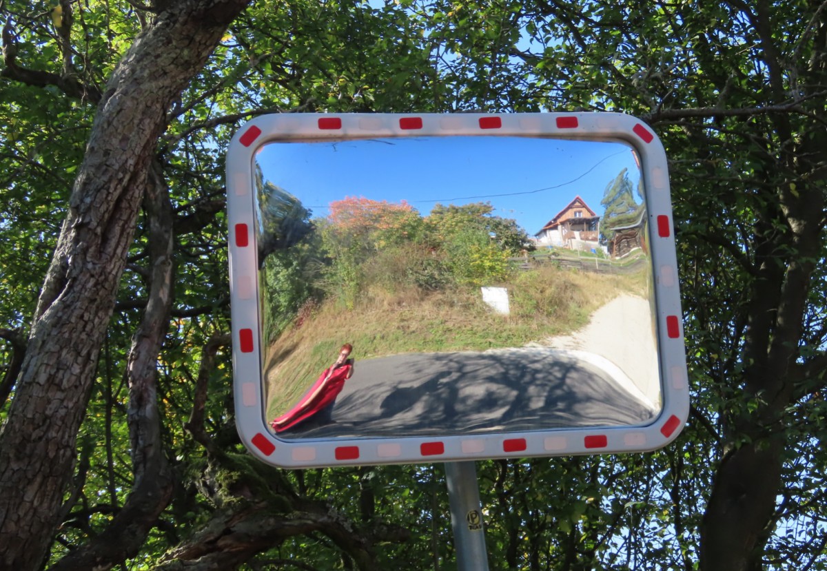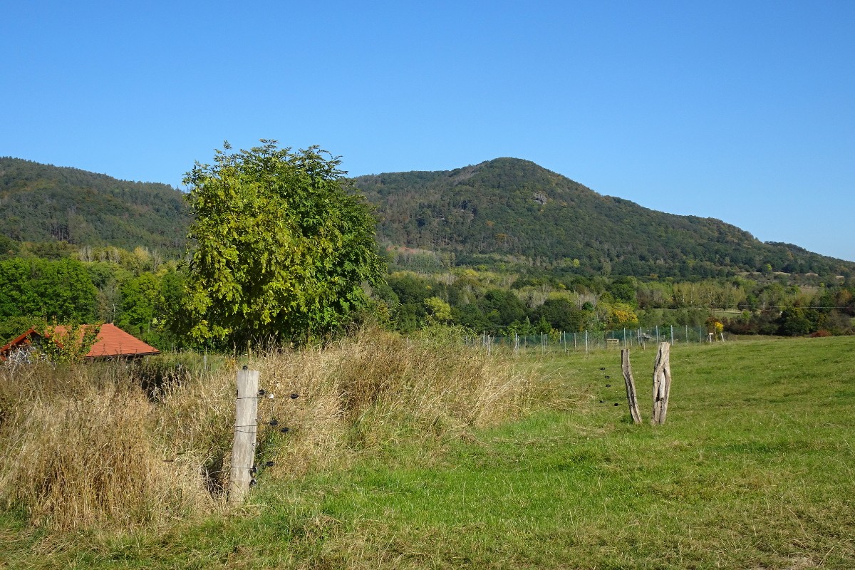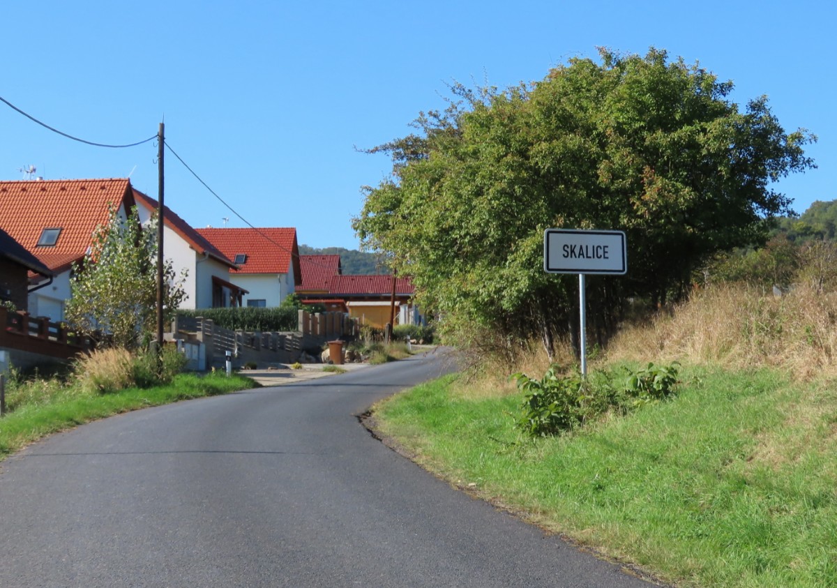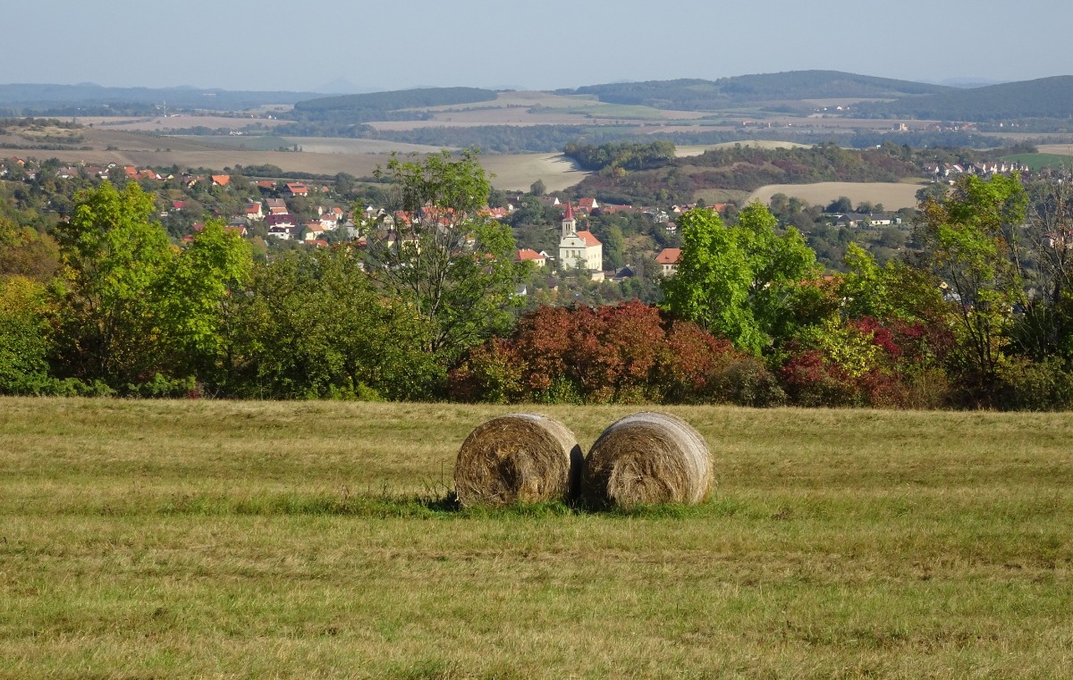 Ale teď už jsem na startu u krásné trojboké výklenkové kapličky v Žitenicích. Hned za ní smutně stojí zámek, který má za sebou dost pohnutou minulost. Patříval světským i církevním majitelům. Začátkem 19. století vyhořel a už nikdy se nevrátil ke své původní podobě. Nakonec v něm po roce 1948 sídlilo JZD a později ho využíval státní oblastní archiv. Dnes patří Královské kolegiátní kapitule sv. Petra a Pavla na Vyšehradě. Turistická značka vede kolem navazujícího kostela sv. Petra a Pavla. Za Žitenicemi je na stráni barokní loreta, viditelná sice z dalekého okolí, ovšem když stojíte vedle ní, nedá se vůbec vyfotit. Bohužel není přístupná a ani okny není dovnitř vidět. Cesta pokračuje mezi zahrádkami, kde vesele pořád kvetou růžičky a podzimní květiny. Motýli se ještě činí, leč výzdoba za ploty nasvědčuje blížícímu se halowenu. Hned za Žitenicemi se pokouším úzkou cestičkou v houští vylézt ke křížku Na Křížku, ale nechci riskovat roztržení oblečení a nakonec se vracím. Za vsí jsem zastihla na louce stádo srnek, odmítajících spolupráci. Jen mě zmerčily, zmizely v houští a pózovat nechtěly. Ze Žitenic do Skalice je to co by kamenem dohodil a brzy procházím okrajem vesnice k Bílé stráni. To už jsem opustila Žitenickou stezku zemí hradů a přestoupila na červenou značku. I tu však brzy opouštím, protože vede dolů pod Bílou stráň a já chci jít horem, užívat si pohledy do kraje a dojít na Mostnou horu. Ovečky, které se obvykle pasou na náhorních loukách, tu tentokrát nejsou. Až dole se pasou kravičky, které vypadají jako maličké hračky z dřevěného hospodářství, které jsme kdysi měli ve školce. Jsou vzorně sešikované a všechny hledí jedním směrem.