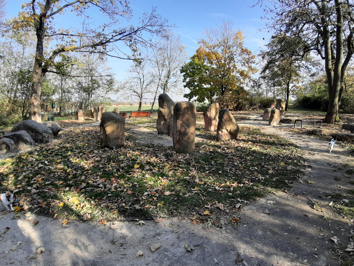 Přímo u podchodu pod trať je zelená turistická značka, která nás dovedla až ke kamenům. V roce 2015 je zde nechali vystavět úvalští radní. Kameny jsou sestaveny do skupin a vypadají jako narůžovělý pískovec. Jsou ale umělé. Mají zde i kamenná lehátka a v okolí několik laviček k příjemnému posezení a rozjímání. Menhiry jsou bezpečně ukotveny v betonovém podlaží, takže si děti mohou vyzkoušet svou šikovnost a na menhiry i lézt. Příjemné místo a úvaláky jsou velice oblíbený cíl procházek. Potkali jsme i spoustu pejsků, jednoho jsem považovala za neostříhaného pudla a on to byl australský labradoodle. Fešák a mazel, jen nějak nechtěl jít s námi domů.
