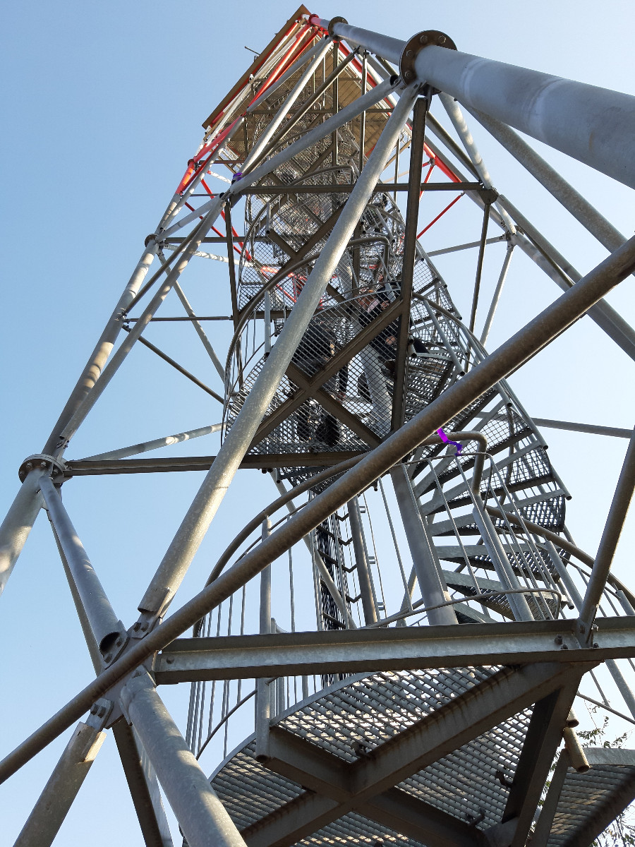 Pokračovali jsme dál polní cestou až k rozhledně Vinice. Rozhledna je asi 20m vysoká a při její návštěvě vyšlapeme 112 schodů. Stojí to ale za to. Je vidět Říp, Bezděz, Středohoří, a když jsou opravdu příznivé koukací podmínky, i Krkonoše. Samozřejmě je i hezký pohled do údolí na Úvaly.
