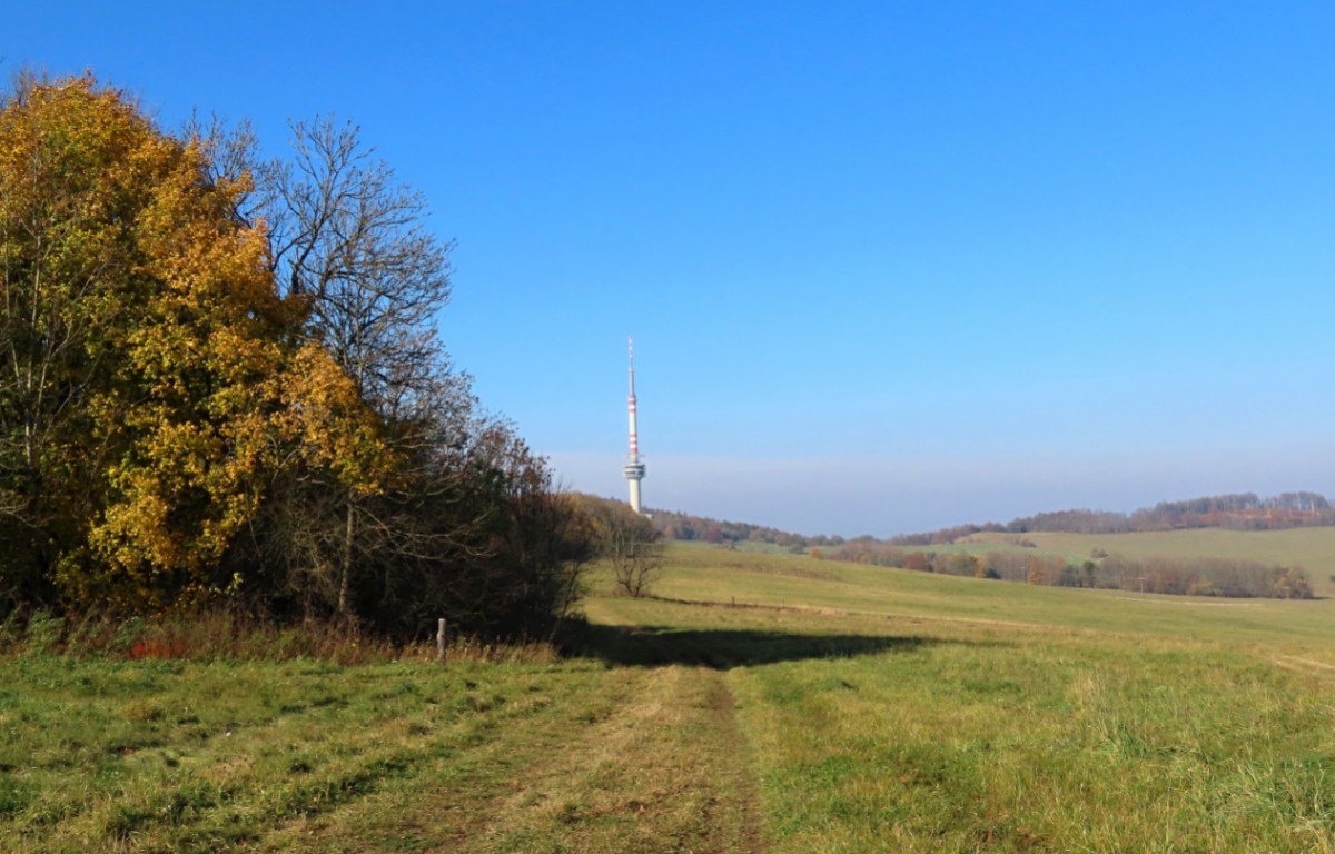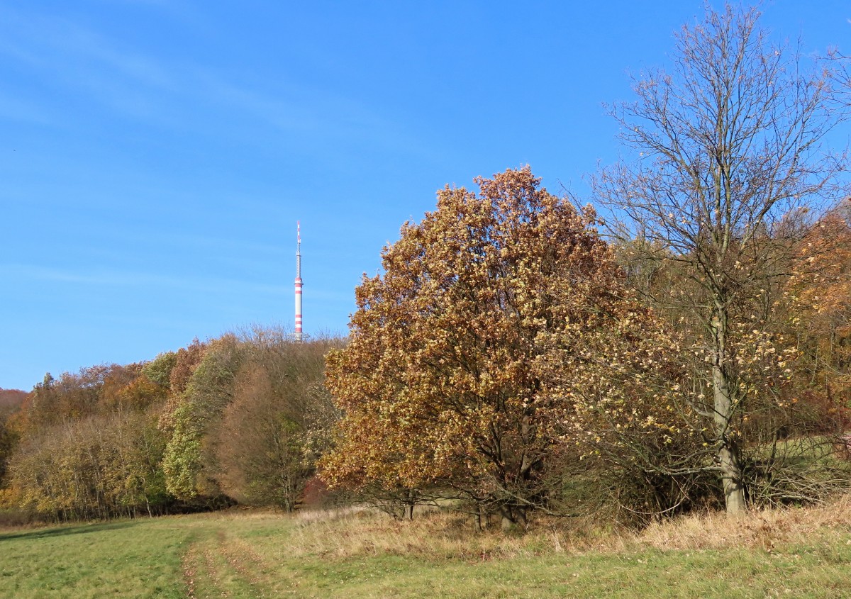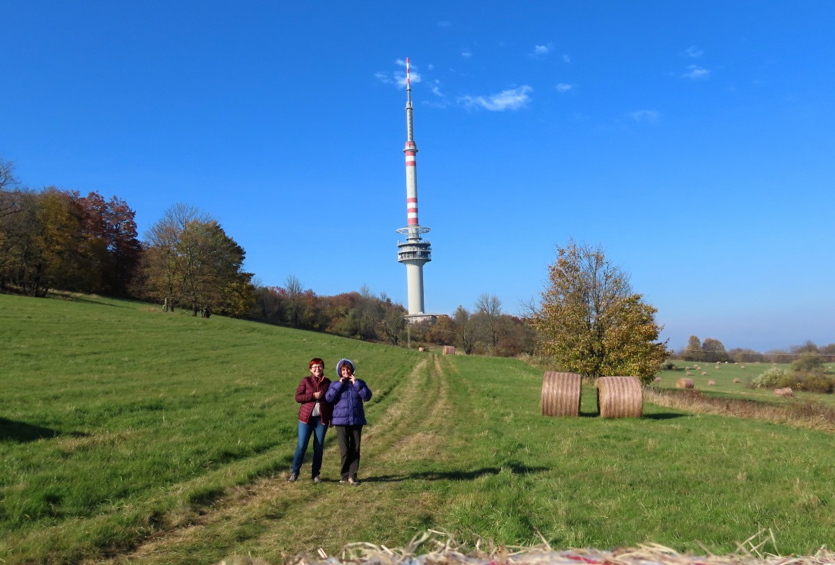 Za nezvykle na toto roční období krásného dne jsme se s kamarádkou na Bukovou horu vydaly. Na start výletu nás dovezl autobus. Ačkoliv slunko svítilo i příjemně hřálo, ve vzduchu se tetelil opar a výhledy na České středohoří se moc nekonaly. Nám to ale vůbec nevadilo a vykračovaly jsme si spokojeně podzimně zbarvenou přírodou. Zdálo se, že vysílač máme na dosah. Pokud byste se rozhodli pro tuto vycházku, vězte, že od rozhledny k vysílači to je 6 km. Cestu snadno zvládnou i děti, vede po hřebeni bez velkého převýšení.