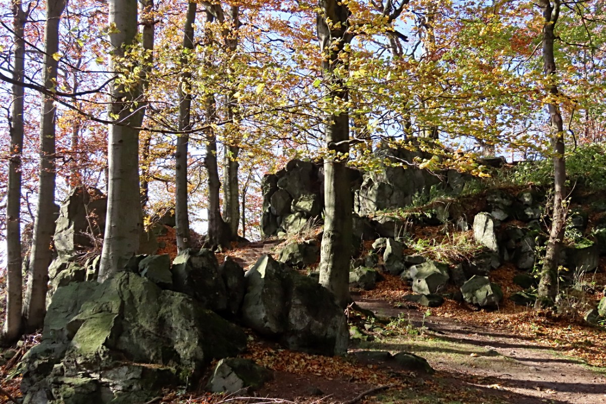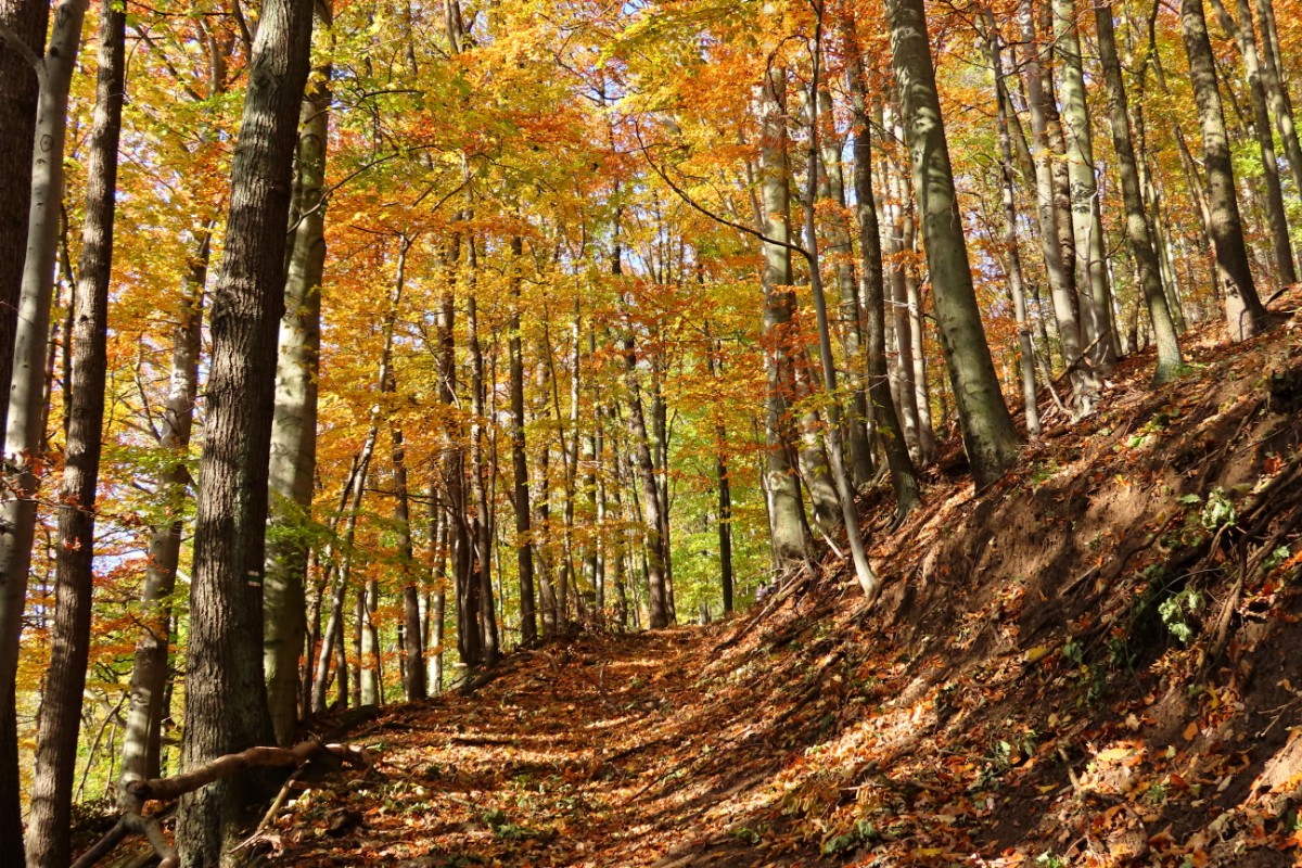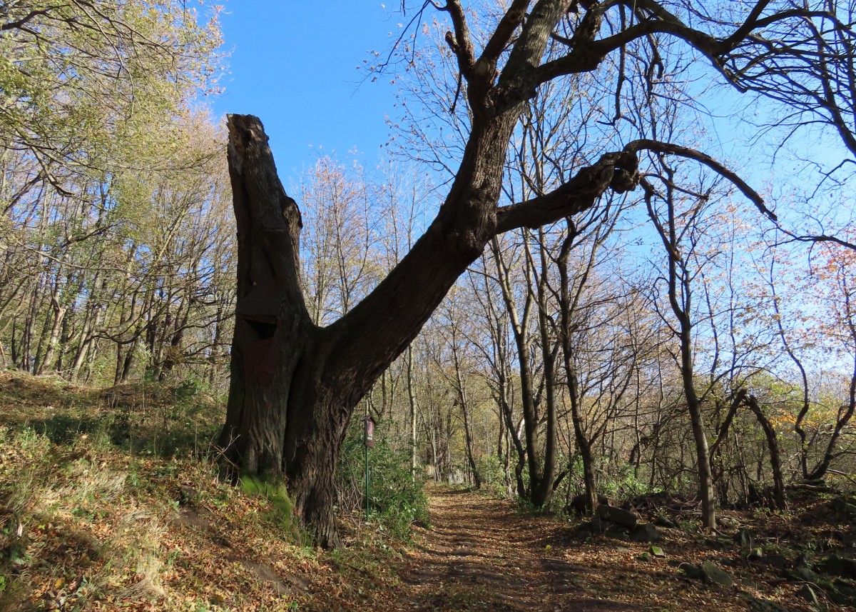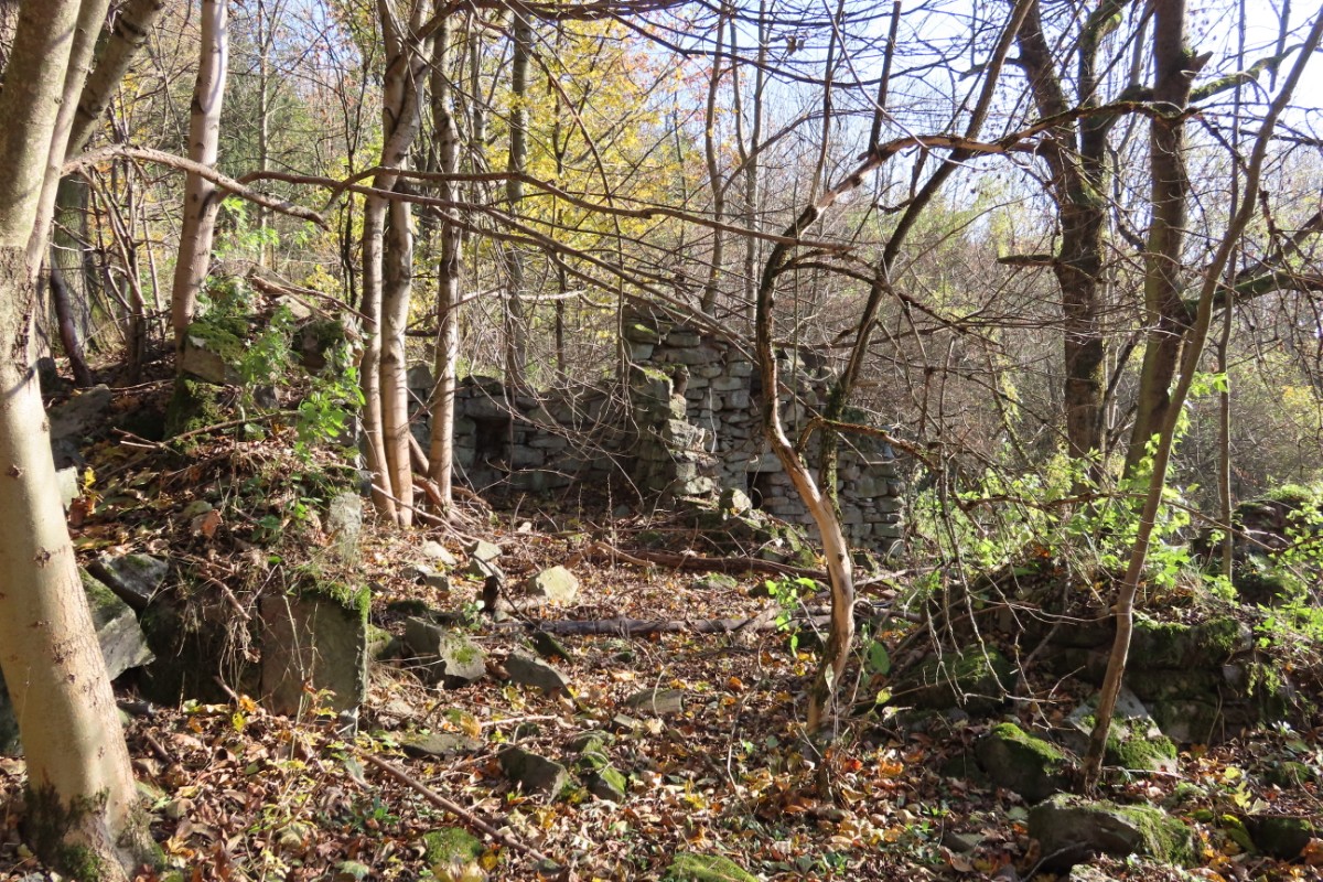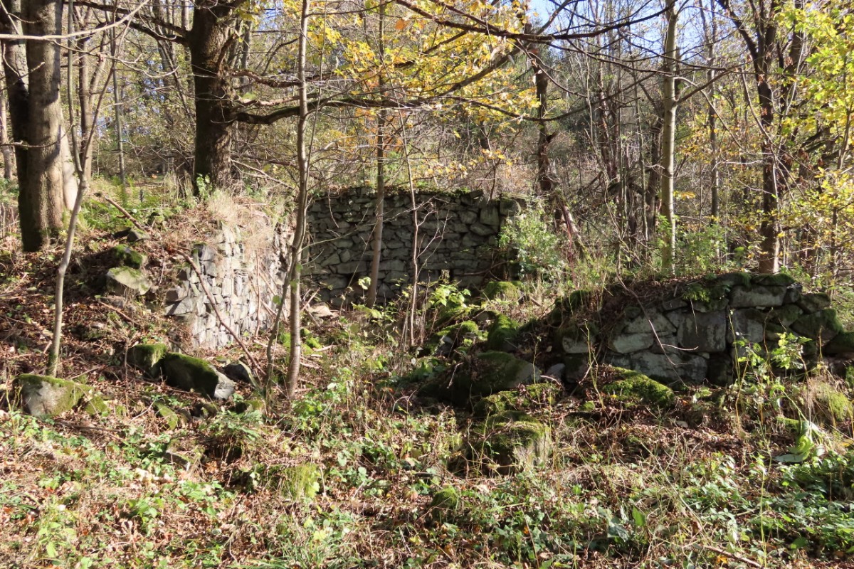 Ze skalnaté vyhlídky jsme se pokochaly výhledem po proudu Labe směrem k Ústí nad Labem. Čekala nás cesta po úbočí hory dolů do Zubrnic. Vybraly jsme si zelenou turistickou značku a vydaly se dolů po svahu. Buková hora, vysoká 683 m, má přiléhavý název, cesta vedla podzimně barevným bukovým lesem. Spadané listí nám šustilo pod nohama a slunko prosvítalo skrz zbylé listy, úporně se zatím držící na větvích. Prošly jsme zaniklou obcí Velké Stínky, ze které mezi stromy zůstalo pár kamenných náznaků, že tu stály domy a v nich žili lidé. Do dnešních dnů je u ní stará lípa, památný strom, značně poznamenaný stářím. Vysílač už jsme dávno měly nad sebou a pokračovaly stále dolů. Doslova nás přimrazil výjev mezi stromy. Zaniklá samota Mauerschin. Mezi nádhernými stromy se vynořila jako výjev z hororu. Zeď s dírami po oknech a dveřích a za ní ve stínu jen pár rozvalin … Nemohly jsme se odtrhnout a jen neochotně jsme se pustily dál.