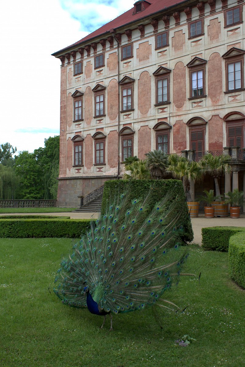 Druhý den byl pátek a my jsme brzy ráno nasedli v Děčíně do rychlíku směr Lovosice. Následně nás lokální vláček dopravil do městečka Libochovice, kde jsme začali prohlídkou hezké zámecké zahrady u libochovického zámku. Zákaz prohlídky zámku nebyl ještě odvolán. Společnost v zahradě nám dělal páv, který se pyšnil větvičkou šeříku v zobáku a potom nám okolo ní zatančil nádherný tanec.
