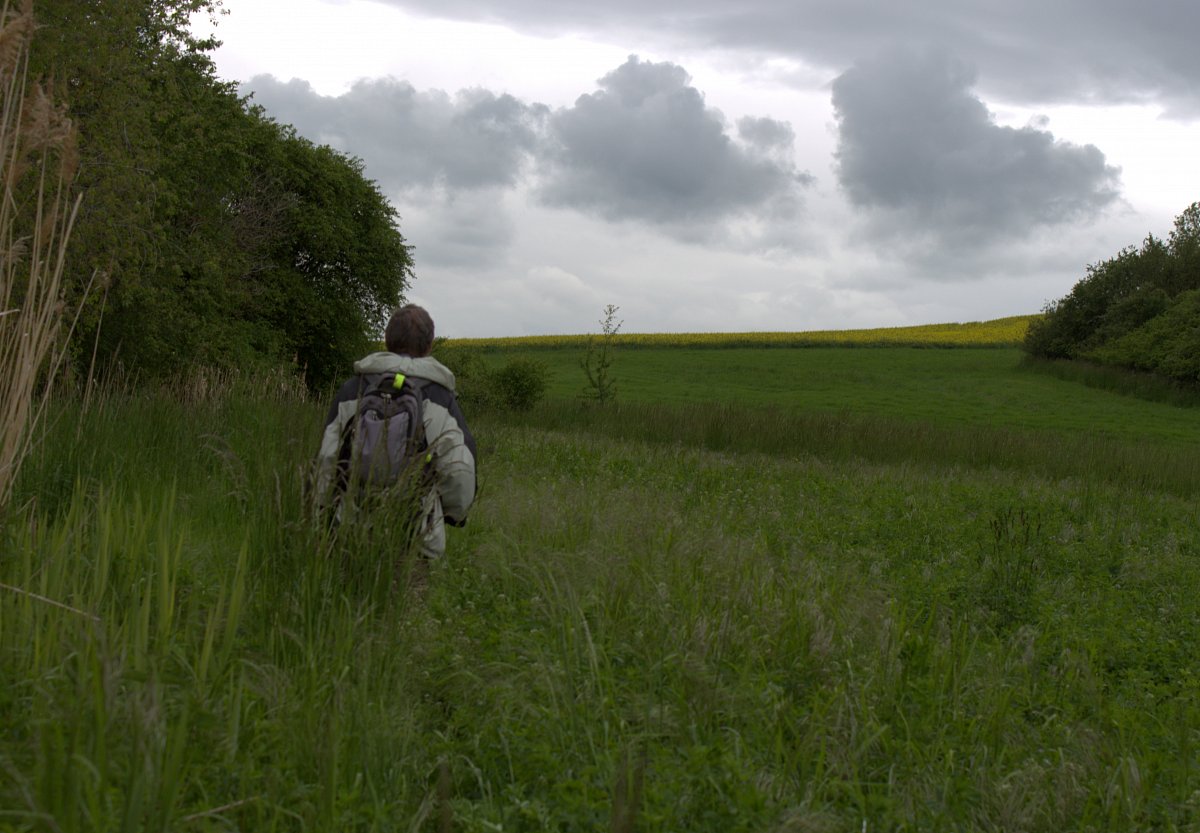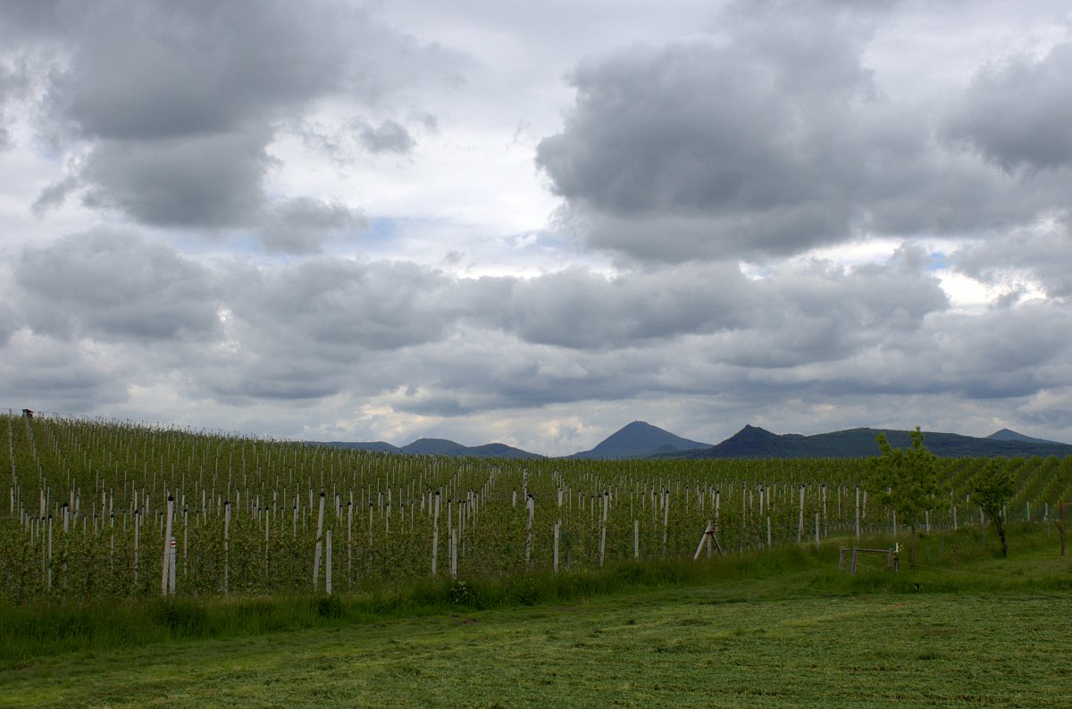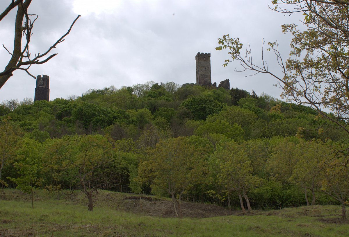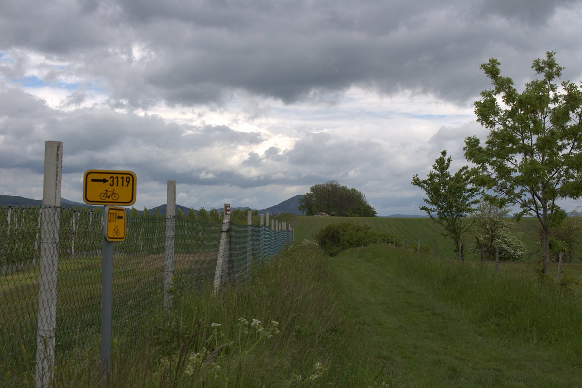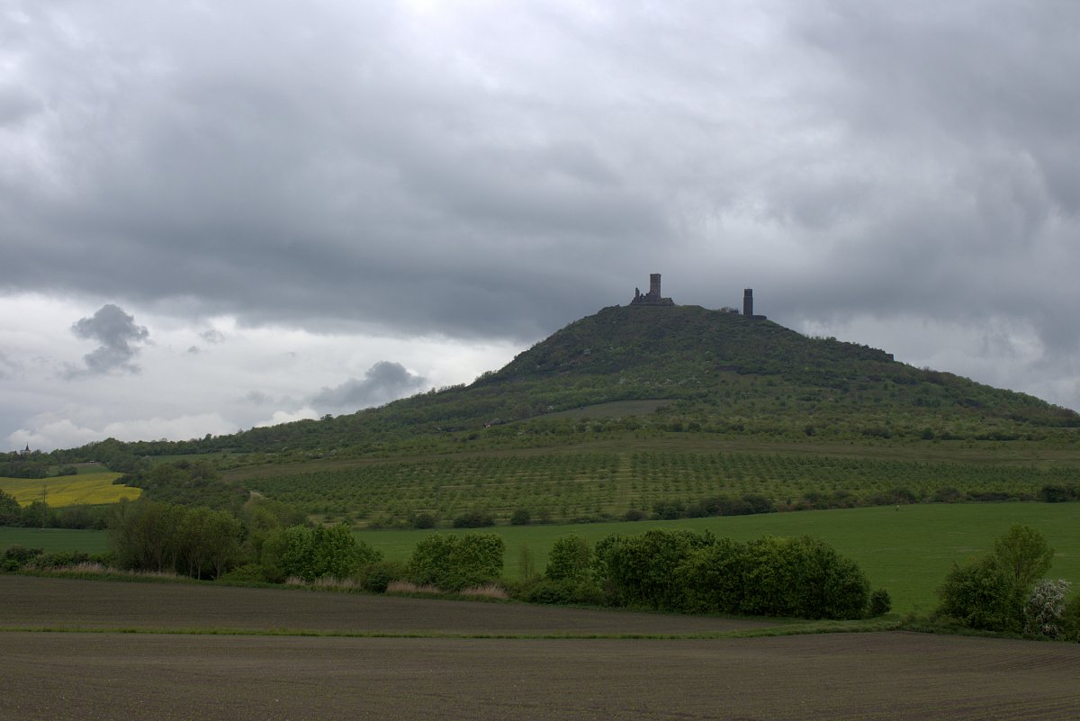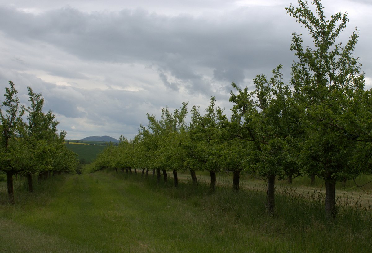 Potom už bylo načase nastoupit na naši plánovanou celodenní cestu na tajúplný hrad a následně do stanice Třebenice na zpáteční vlak. Když jsme vyšli z Libochovic, vedla červená značka souběžně se silnicí. Asi po dvou kilometrech nás tvrdá cesta přestala bavit a my jsme to střihli zkratkou přes pole. Nebyl to zrovna dobrý nápad, tráva a ostatní zeleň byla hodně vysoká. Nakonec jsme se proklestili a uprostřed ovocného sadu na úpatí kopce jsme opět narazili na červenou značku, která nás dovedla nahoru ke věžím starého hradu. Naši cestu z povzdálí jistila majestátná hora Říp.