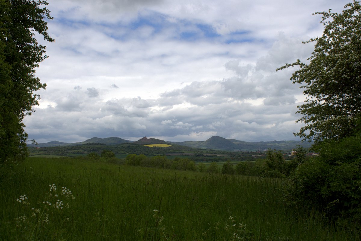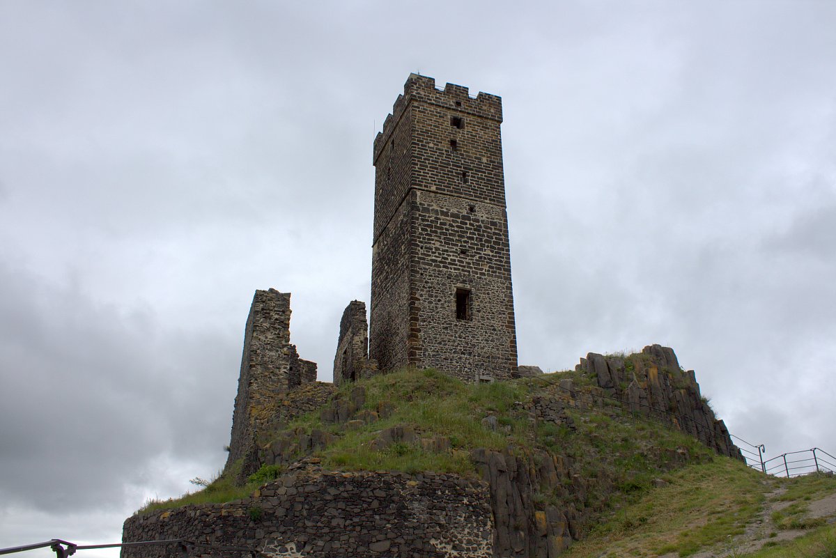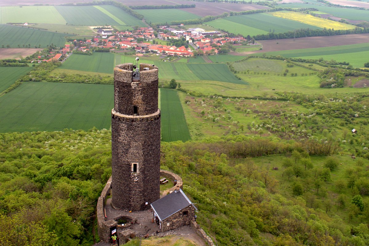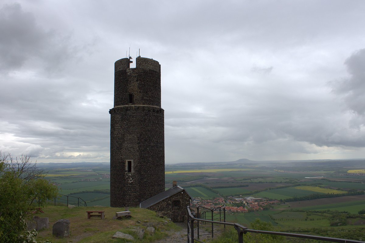První živá bytost, kterou jsme na naší pouti uviděli, byla slečna v kamenném kiosku, která nám prodala lístky na prohlídku horní věže. Výhled z hradu a z věže na krásnou okolní krajinu, na Říp a ostatní kopečky Českého středohoří byl fascinující. Počasí nebylo zrovna příznivé, něco se hnalo od jihu, dodávalo to ale tomuto místu ještě větší tajemno. Připadali jsme si, že jsme na světě úplně sami. Výhledy do kraje a krásná barevná jarní okolní krajina nás přímo okouzlila.