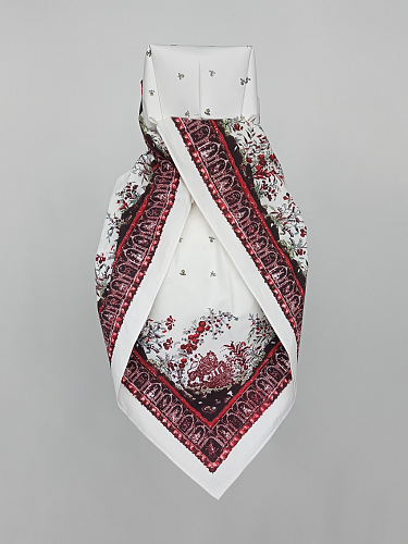 Obr.1 Lipský šátek, vzor "pánový". Zhotoveno podle dochovaného vzoru z Horňácka, 19. století. Materiál a rozměr: 100% bavlna, 150 x 150 cm. Ukázka vzoru na horňáckém úvazu " hore rožky". Pohled na zadní část. Foto Kristýna Petříčková