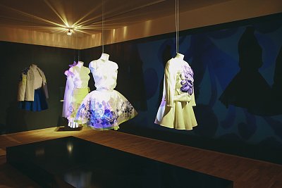 Obr.4 Pohled do expozice výstavy Budoucnost tradice v Moravském zemském muzeu, studentská oděvní kolekce inspirovaná habánskou keramikou, ateliér Design oděvu UTB Zlín. Fotoarchiv ADO