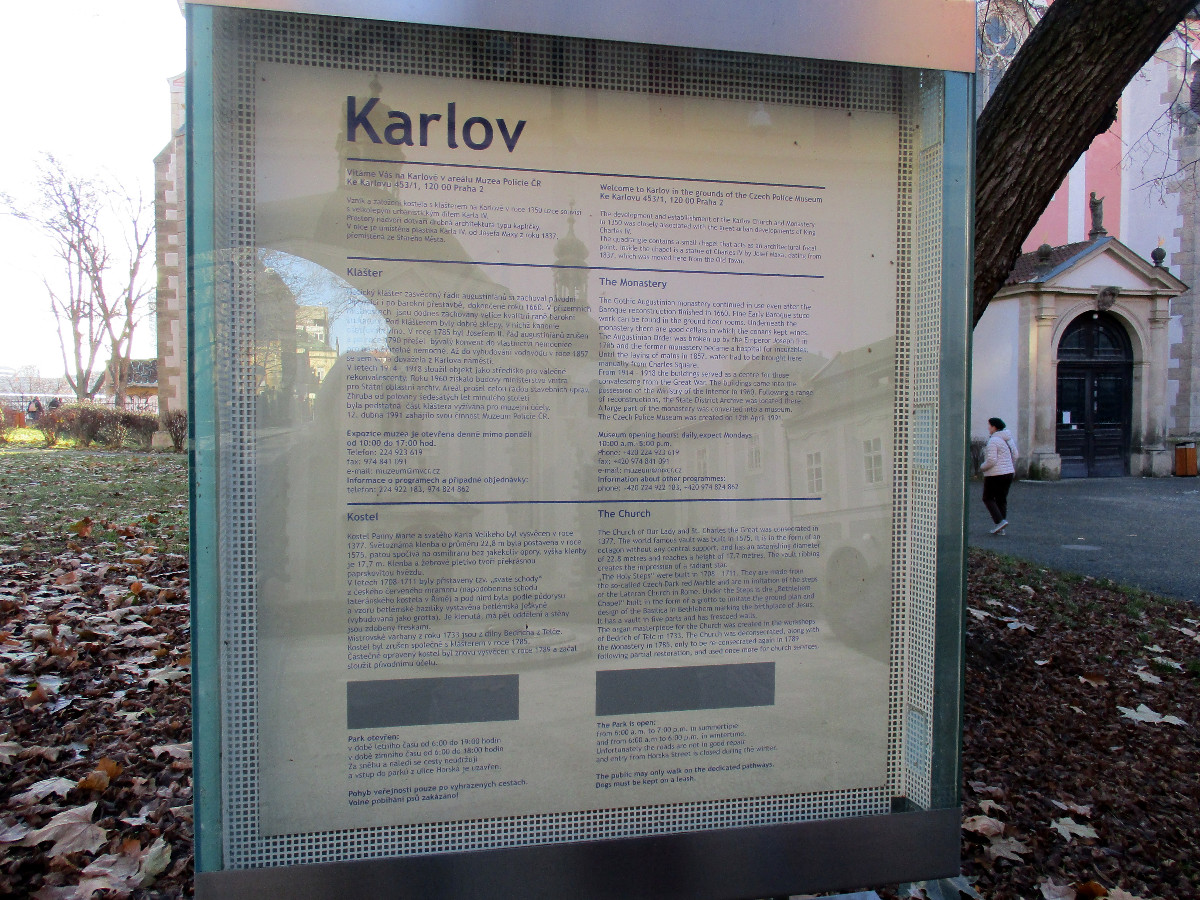 Z Karlova náměstí jsme se vydali kolem Muzea Antonína Dvořáka na Karlov. Bývalý klášter augustiniánů kanovníků v Praze na Karlově je původně gotický, barokně přestavěný. Jeho součástí je i Kostel Nanebevzetí Panny Marie a svatého Karla Velikého. Klášter založil Karel IV.