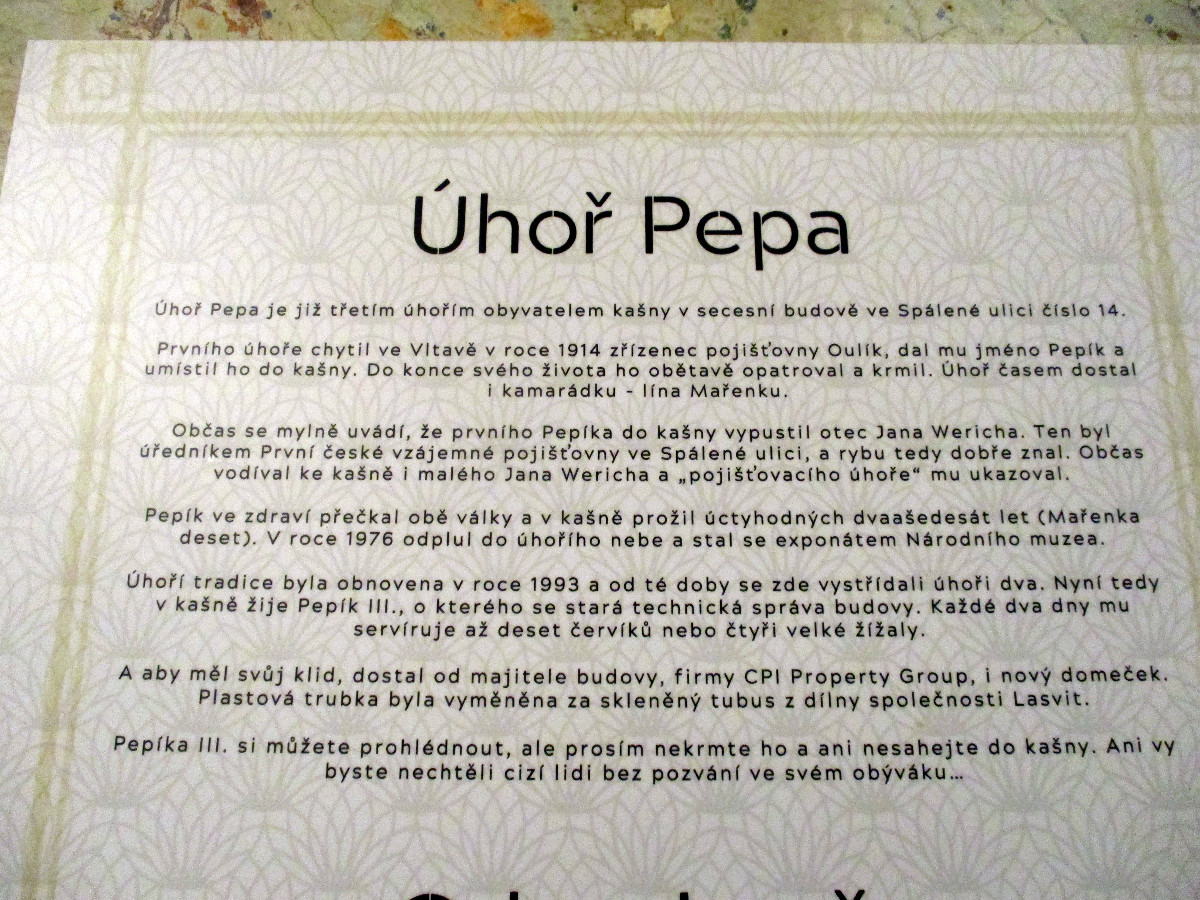 Velkou raritu ukrývá secesní budova České pojišťovny v pražské Spálené ulici. V kašně pod schody plave živý úhoř. Jmenuje se Pepa a je už třetí od roku 1914. Na prvního vzpomínal kdysi slavný herec Jan Werich.