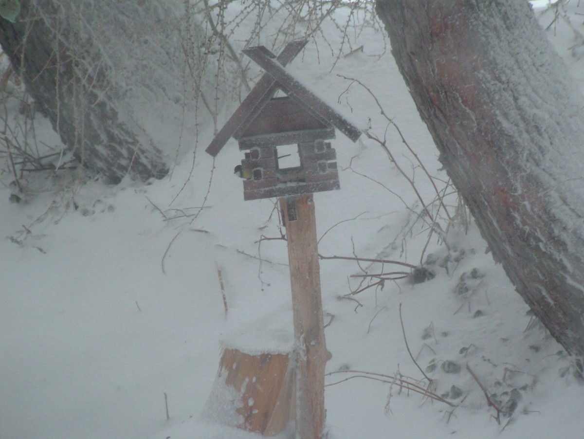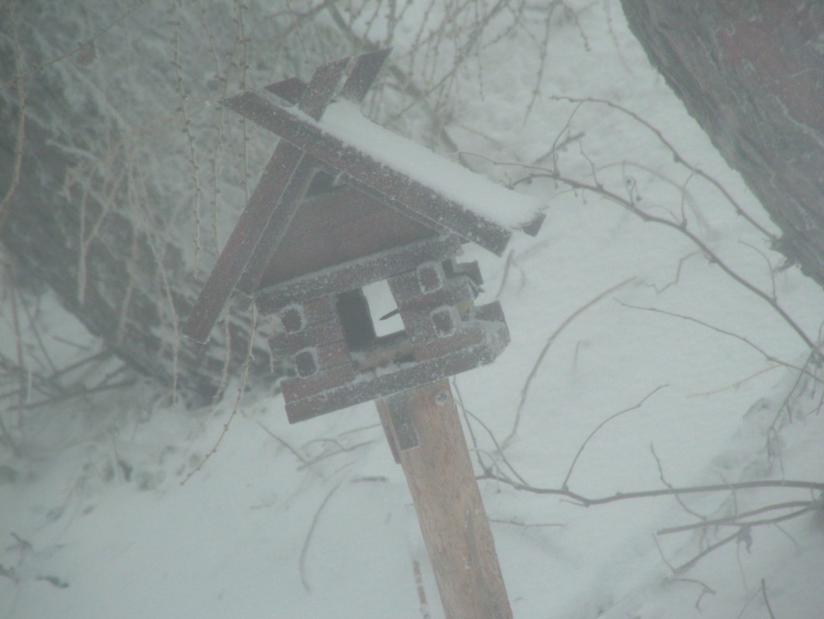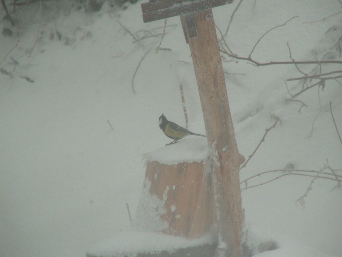Večer začala fujavice a sněžení, takže jsme ani nečekali, že se ráno sýkorky objeví. Jsou však statečné a uvyklé životu na horách, a i když jich bylo málo, přilétly si pro snídani.