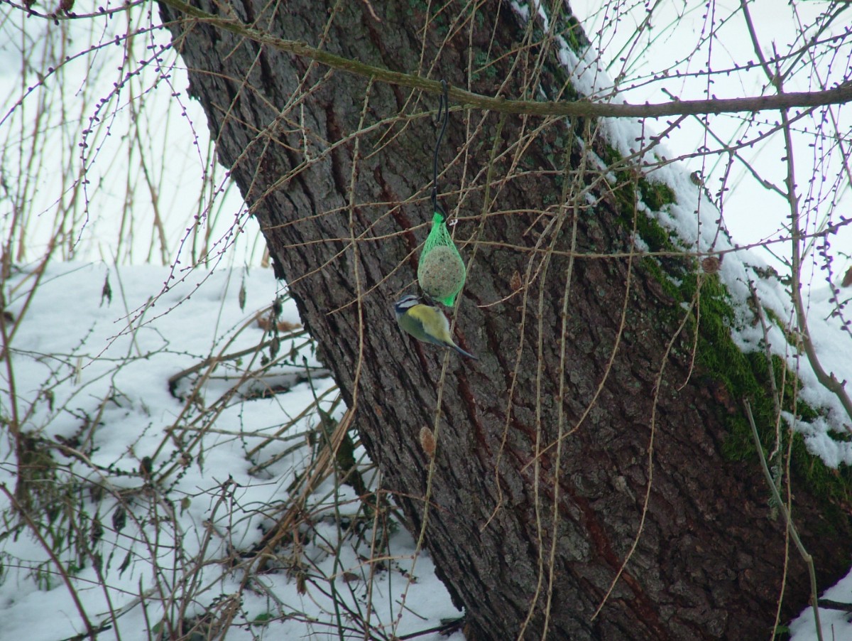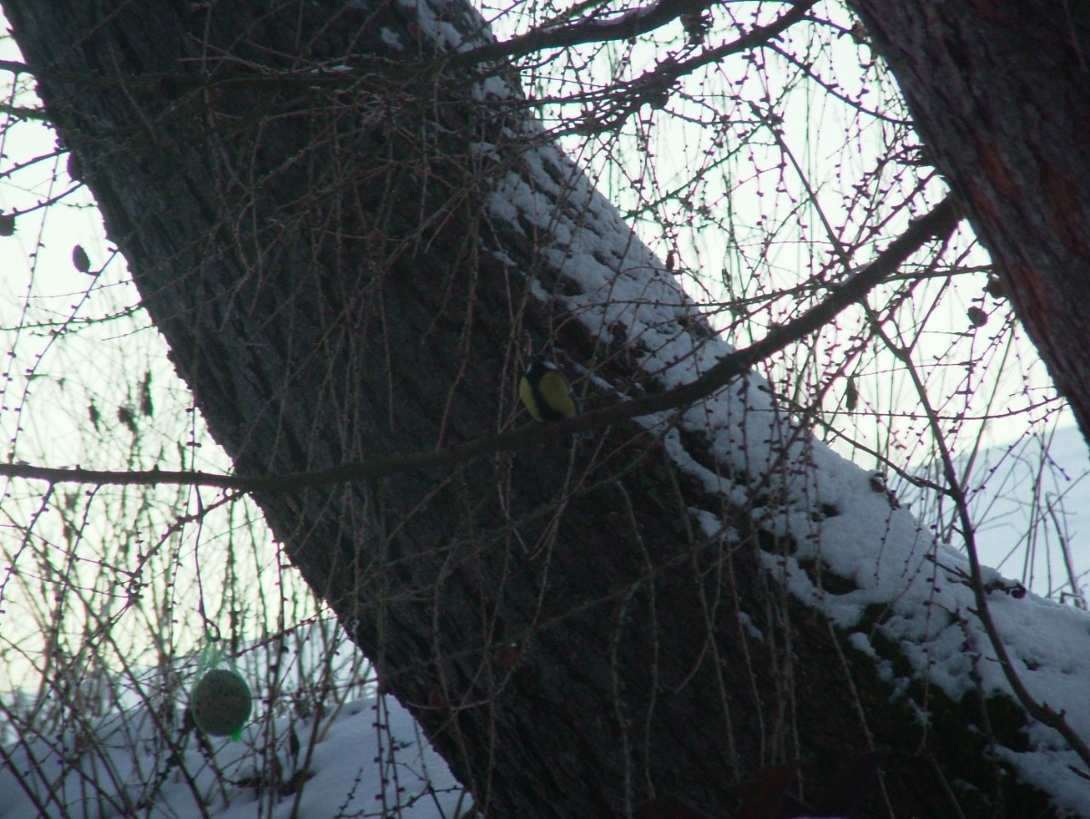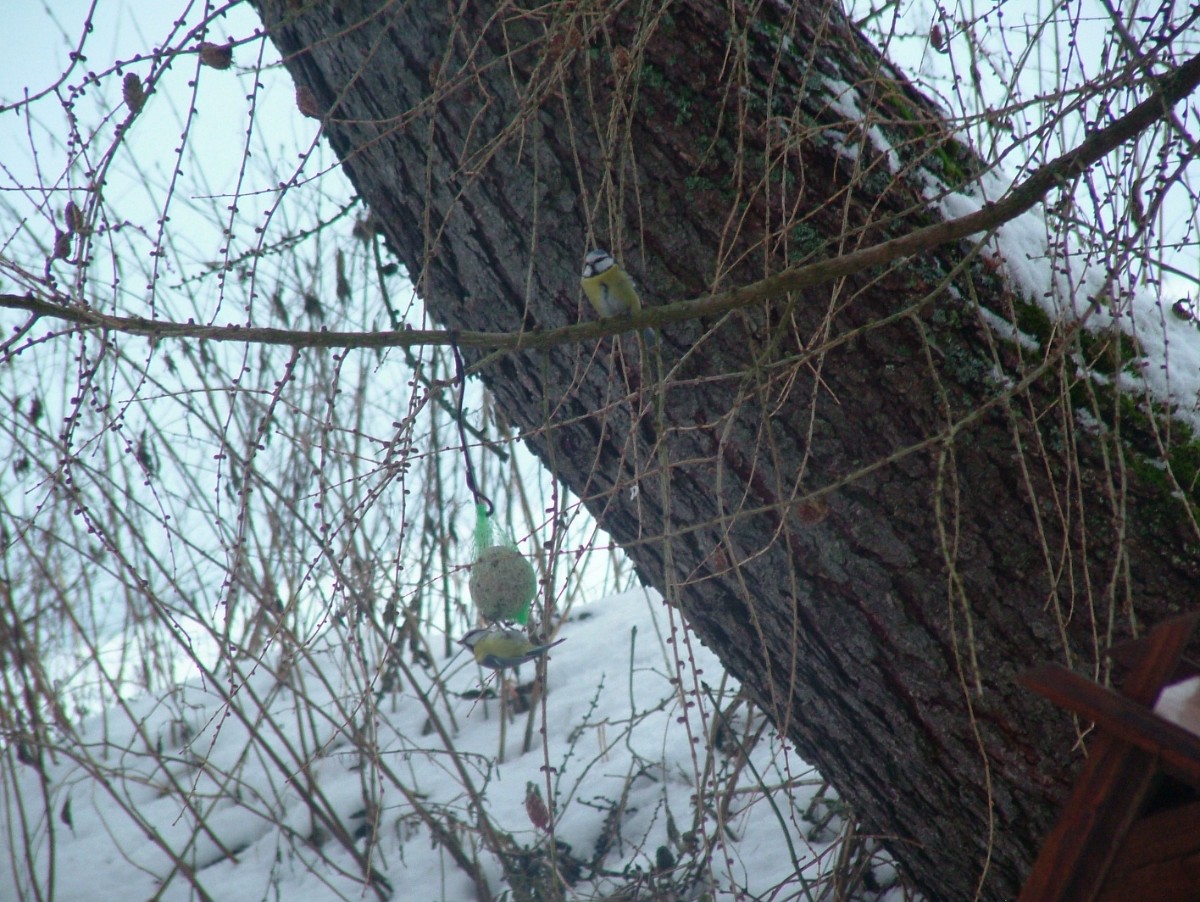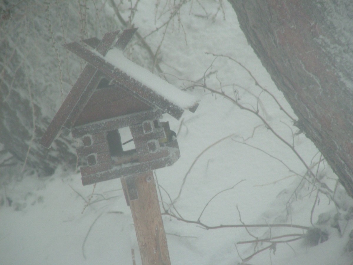 Večer začala fujavice a sněžení, takže jsme ani nečekali, že se ráno sýkorky objeví. Jsou však statečné a uvyklé životu na horách, a i když jich bylo málo, přilétly si pro snídani.