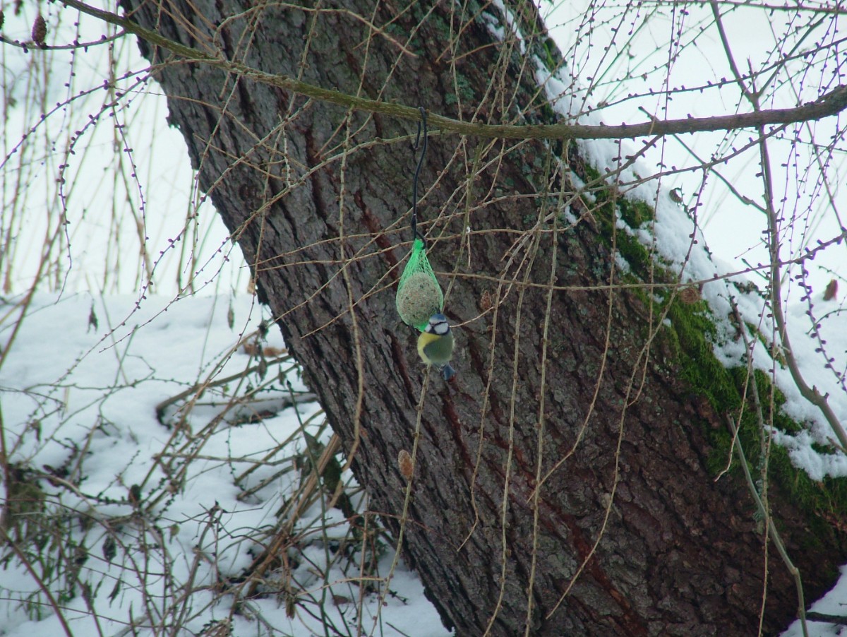 Ráno, chvilku po tom, když se slunce ukázalo uprostřed červánků, jsme je mohli očekávat. Na stříšce krmítka se ale nejprve objevila sojka. Poseděla, porozhlédla se a pak se spokojeně usadila na vedlejším stromě. Hned jak bylo krmítko volné, přilétla spousta drobných sýkor modřinek. Poznají se podle modré čepičky a hlavně podle černých proužků přes oči. Vesele prováděly na lojové kouli akrobatické kousky, natáčely se ze všech stran, zobaly i hlavou dolů a ukazovaly svou barevnou krásu.
