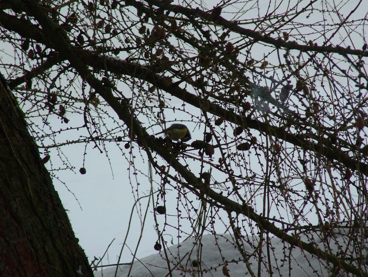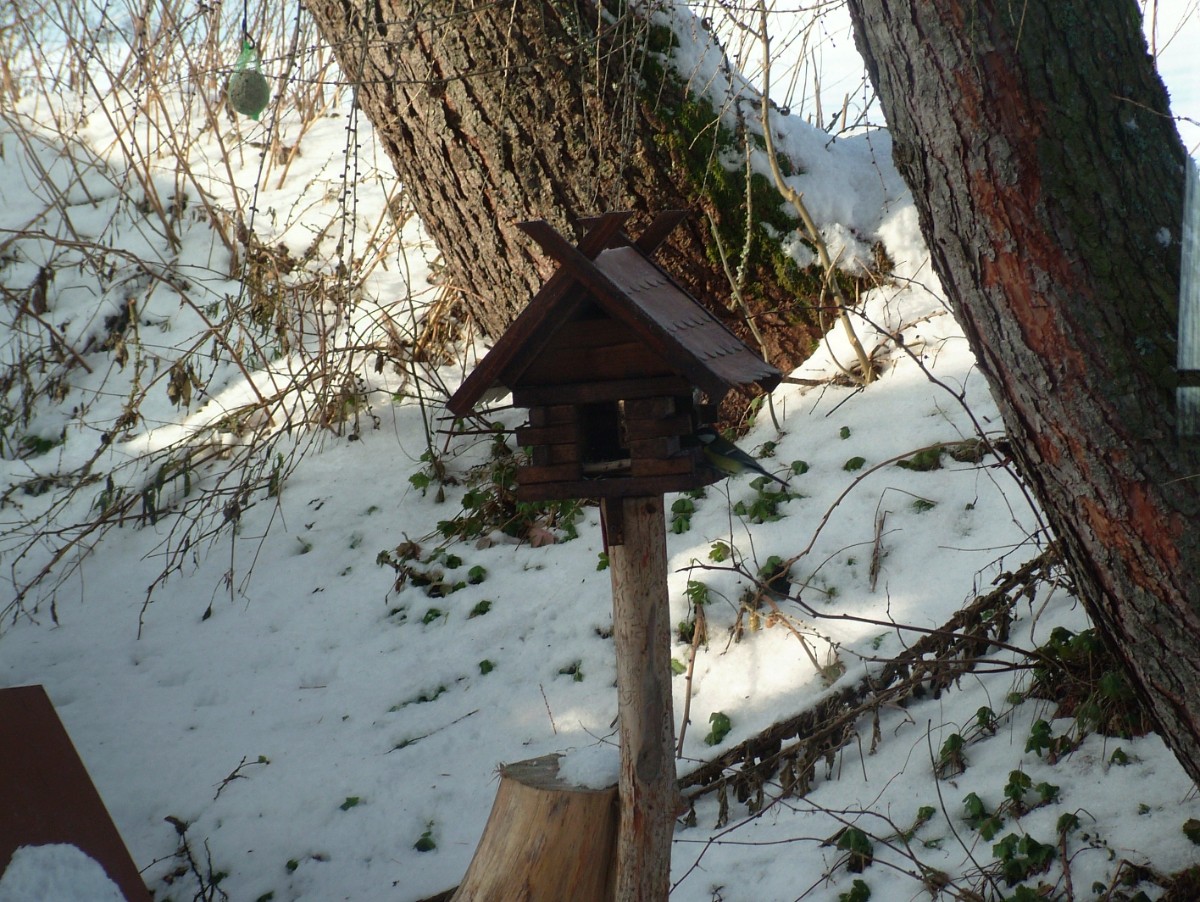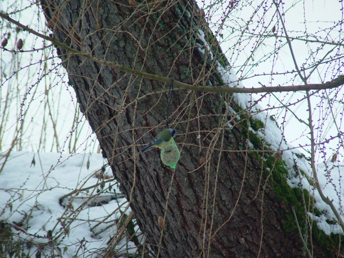 Občas zalétl ke krmítku kos, sýkorky ale jen trochu vyplašil a usadil se na modřínu. Všichni ptáci si pak dali asi na tři hodiny pauzu, aby pak celé odpoledne pokračovali. Dobře, že využili nádherného dne.
