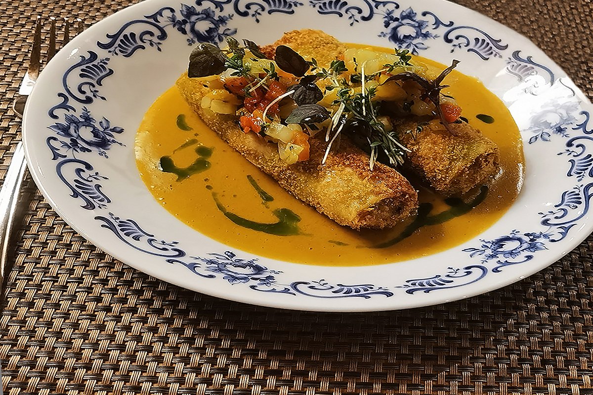 V hotelu Dvořák jde Martin Pudil stopou čistých autentických chutí, hodně ovšem netuctovými prezentacemi pokrmů. Rolky obalené plněné trhaným drůbežím masem tonoucí v rezavé hladině estragonové omáčky vychucené estragonem a fenyklem připomínají všechno možné než to, čím opravdu jsou. Totiž svéráznou kreací na téma kuře na paprice. V chuti je však poznáte při prvním soustu.