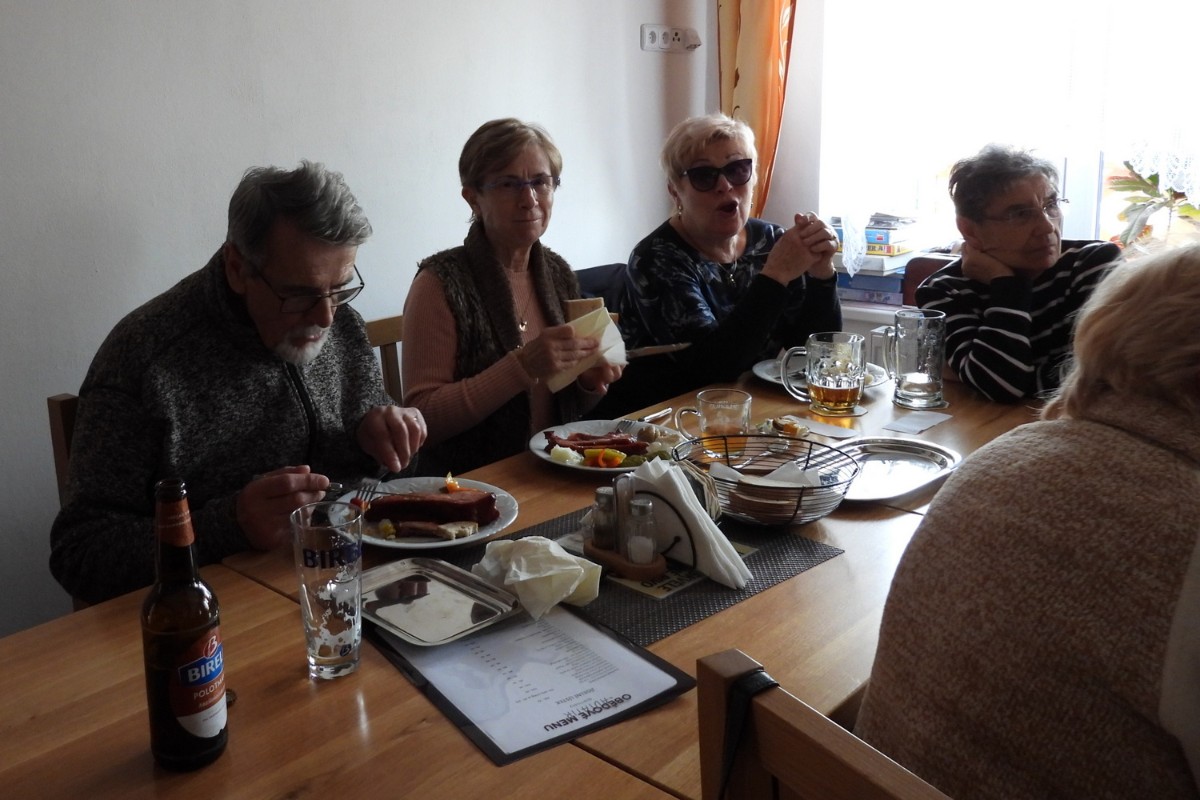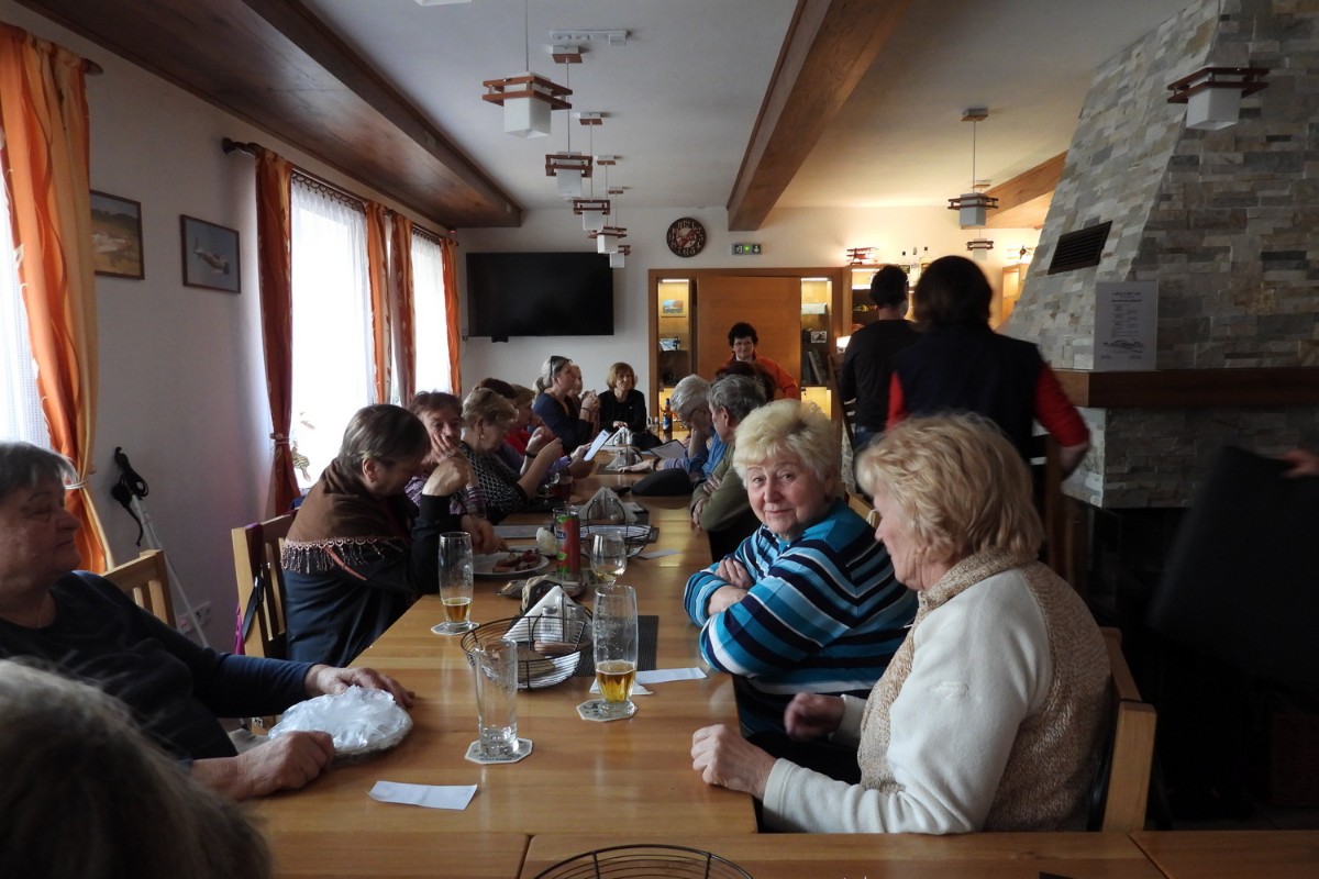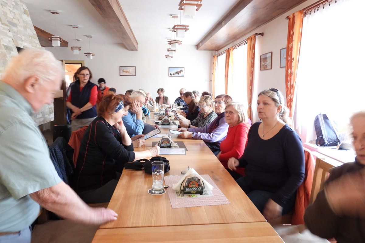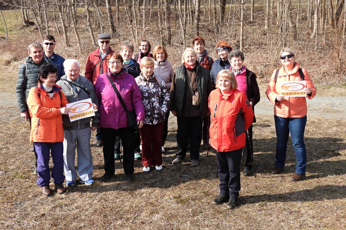 Od komunitního centra jsme se po cyklostezce vydali do Hradce a pak přes historický kamenný most nad železniční tratí do Nové Vsi. Tam byla plánovaná zastávka na občerstvení a doplnění tekutin. Penzion Aviatik, tady už na nás čeká skupina lidiček, kteří se sem nechali dopravit, protože už by celou trasu pěšky nezvládli. Nevadí, každý podle svých sil a hlavně s dobrou náladou. Po občerstvení jsme pokračovali v cestě zpět do Mikulovic ke komunitnímu centru. Osm kilometrů trasy, sem tam do kopečka a pak zase šupem dolů, jsme zvládli všichni bez ztráty kytičky.