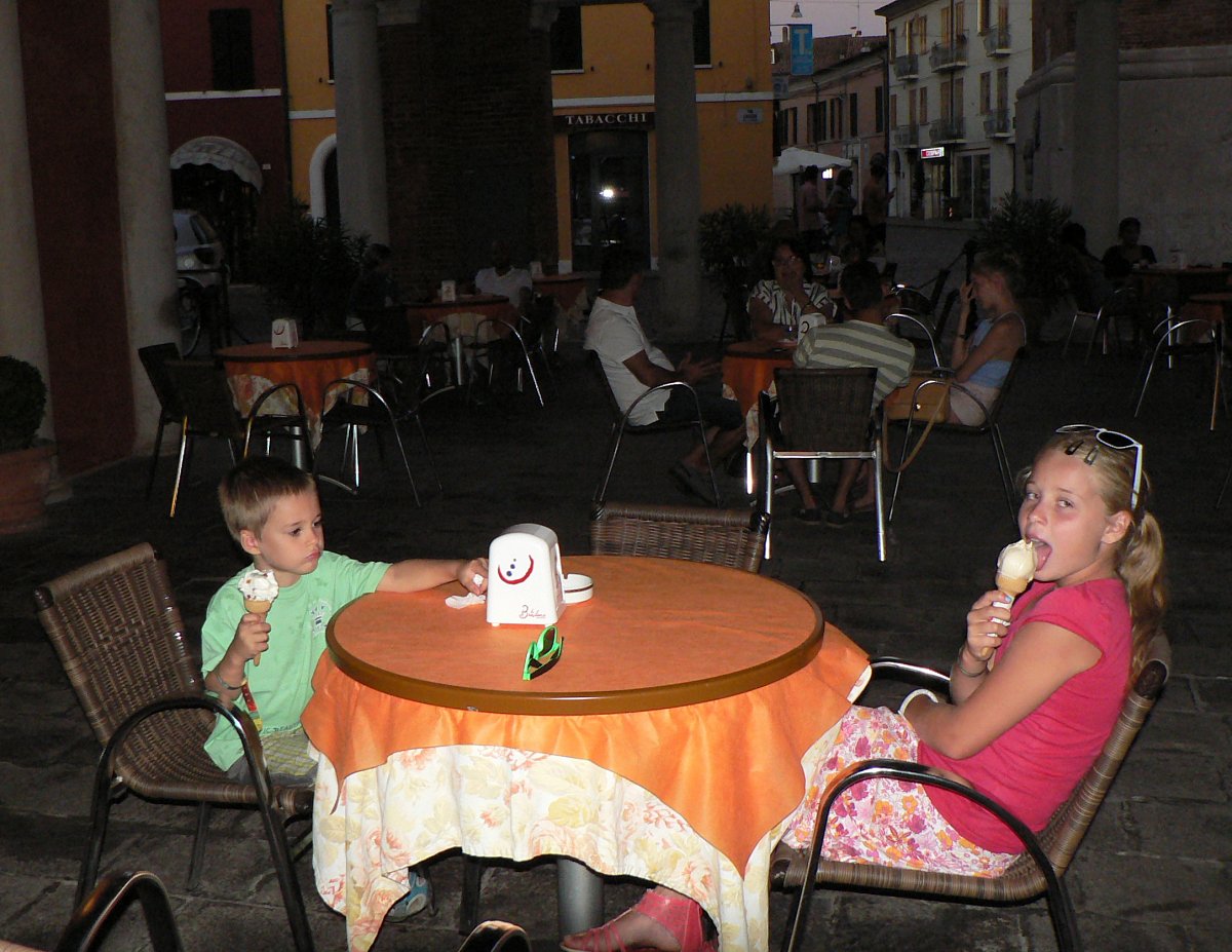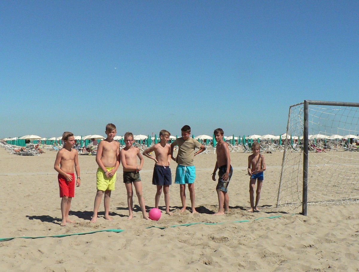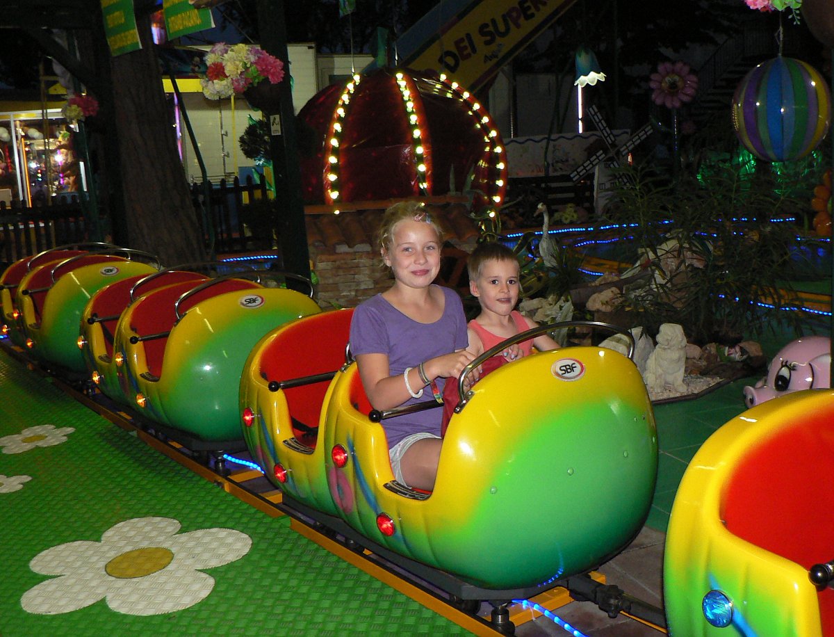 Na tuto naši dovolenou jsme nalákali i dvě spřízněné rodiny ze Zlína, takže nás bylo celkem 15, z toho 6 dospělých a 9 dětí. Od té doby mám u naší cestovky protekci. Kemp byl hodně rozlehlý, dokonce tam jezdil i malý vláček, který vozil turisty k moři na pláž. Uprostřed kempu byl bazén s hodně studenou vodou pro otužilce. Byly tam obchody i příjemné kavárny. Večer to tam hodně žilo. Zažili jsem i hroznou večerní bouřku a lámání stromů, ve Střední Itálii bylo ten den silné zemětřesení i s lidskými obětmi.