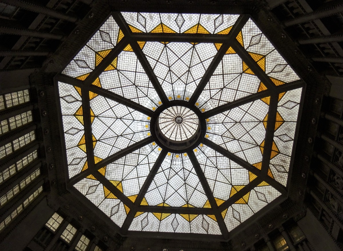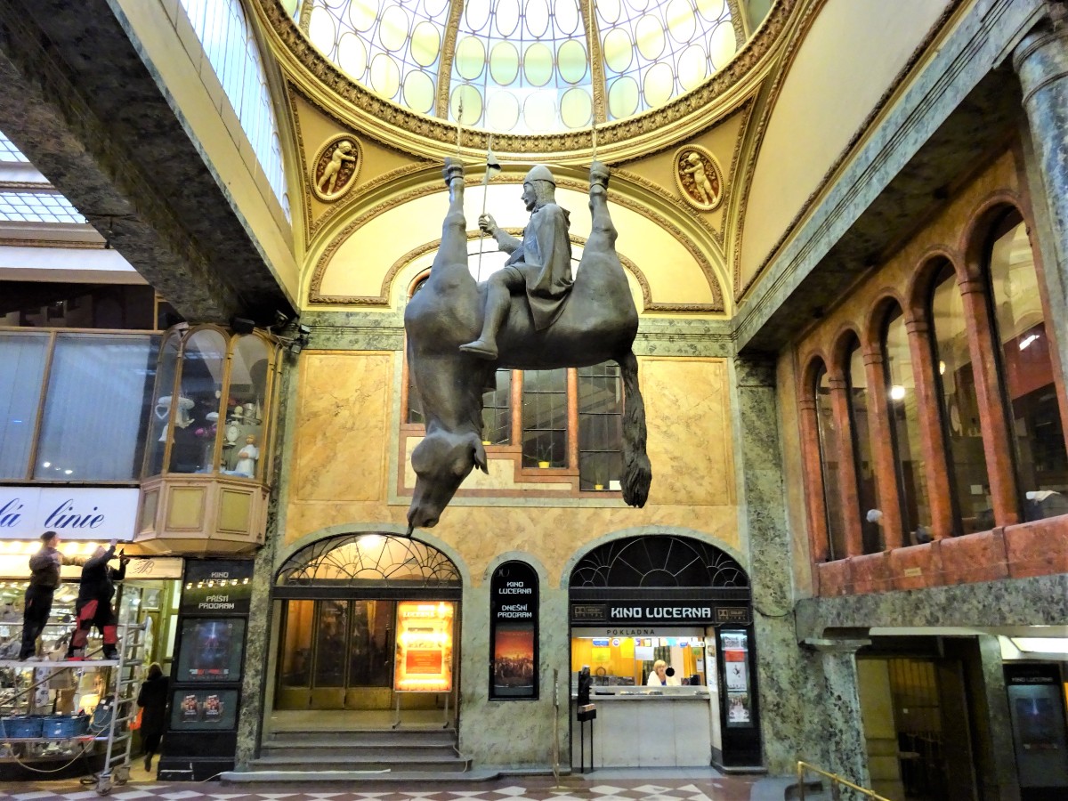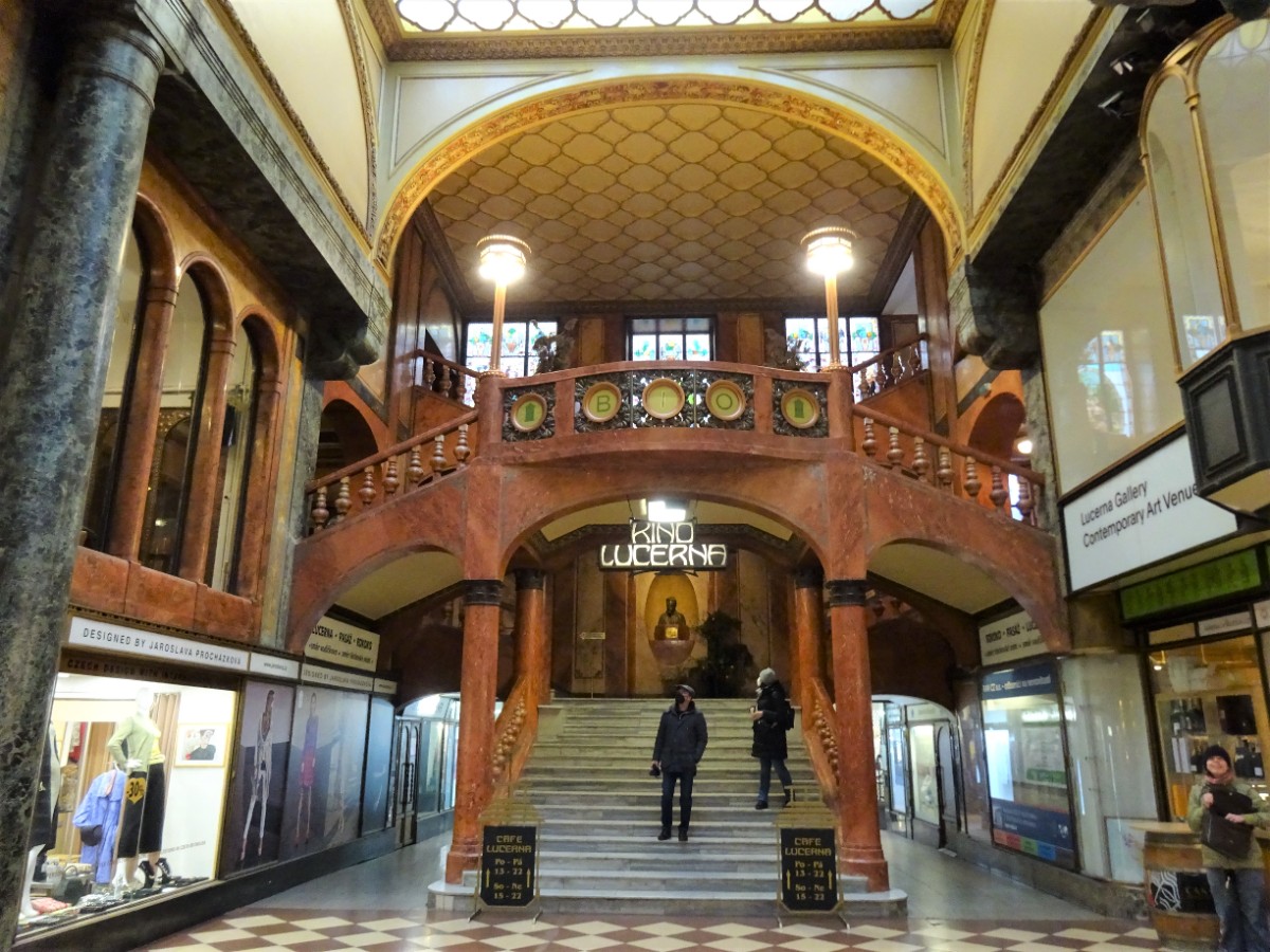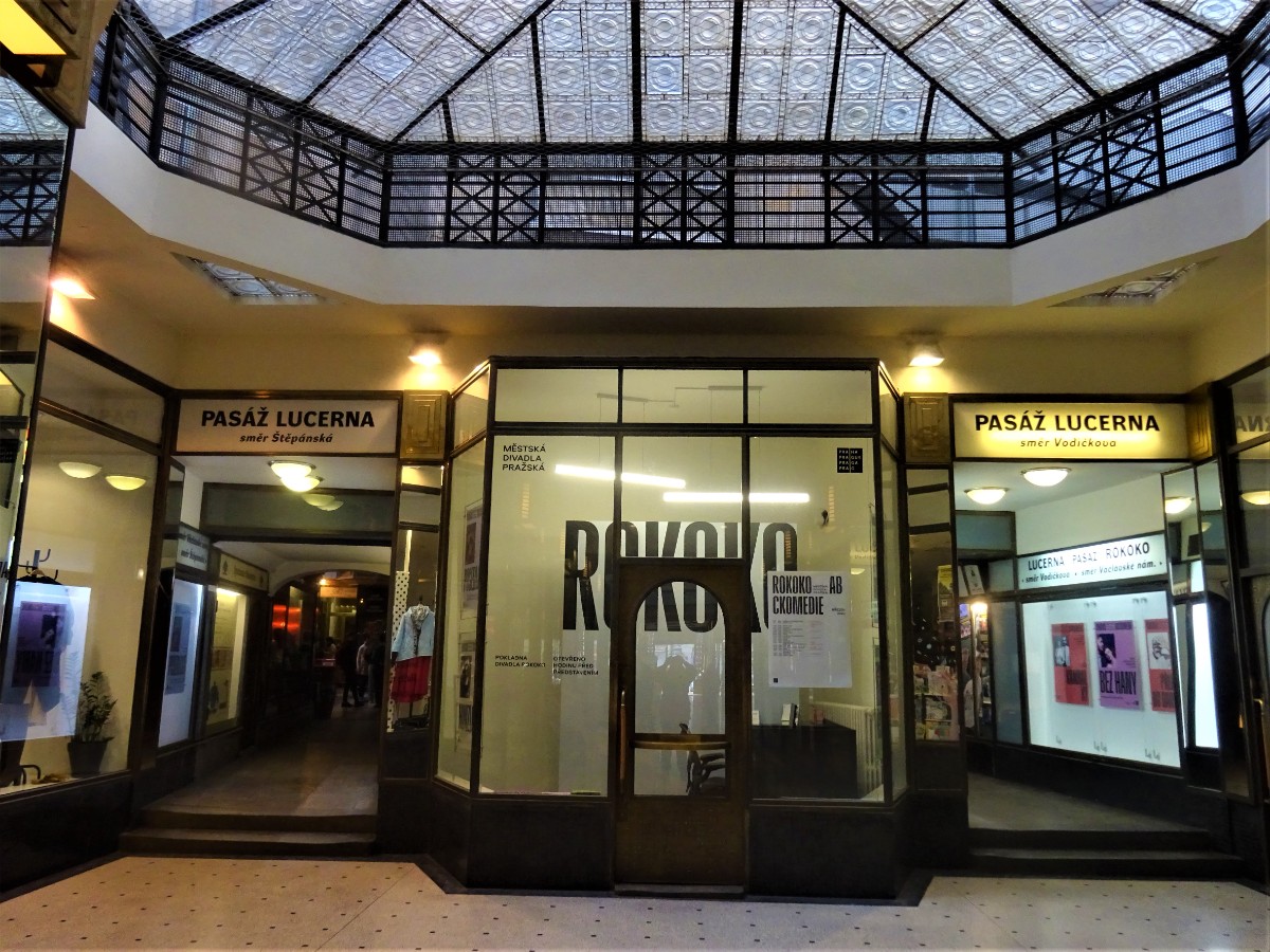 Pasáž secesního paláce Lucerna byla první pasáž v Praze. Stavba paláce začala již v roce 1907, pokračovala v několika etapách až do roku 1921. Budova je životním odkazem stavitele Vácslava Havla, dědečka bývalého prezidenta, Praze. Systém pasáží v Lucerně je pravděpodobně největší a nejzajímavější. Propojuje Vodičkovu a Štěpánskou ulici. V pasáži se nachází kino v secesním stylu, několik obchodů a barů. V atriu uprostřed pasáže visí socha výtvarníka Davida Černého – parodie na rytířský pomník sv. Václava. Lucerna je památkově chráněný komplex. V době, kdy jsem fotila, se palác zvenku opravoval, byl přikryt plachtou. Fotografie vchodu do pasáže je proto ze Štěpánské ulice.