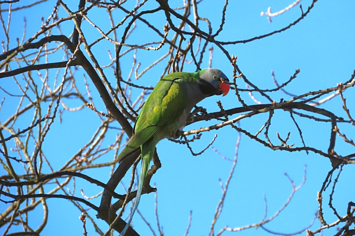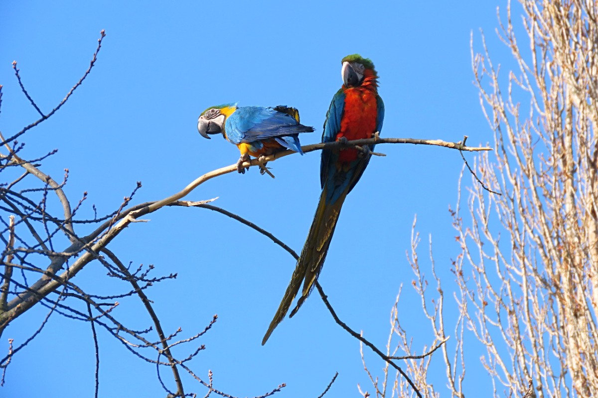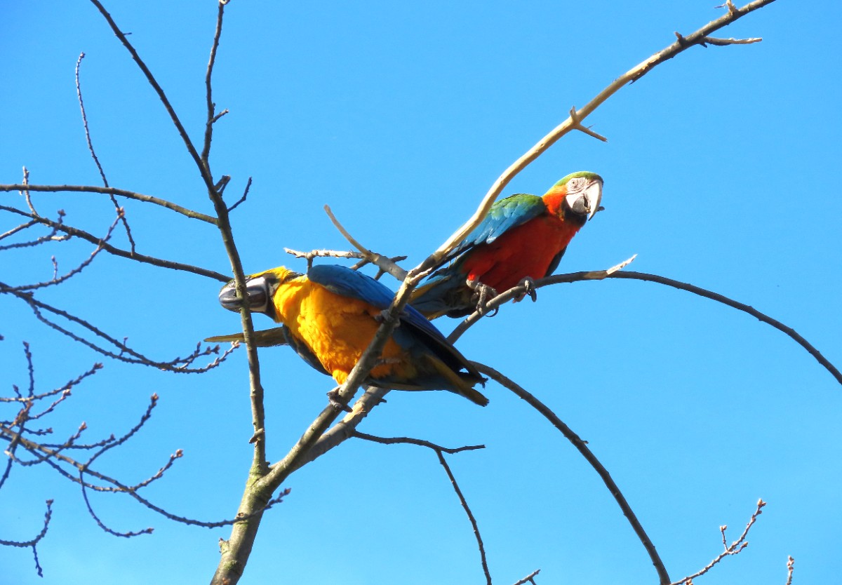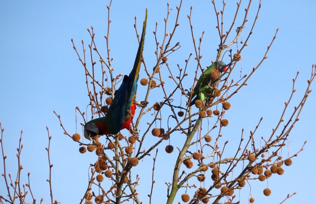 V Mělníce jsme měly každá asi půl hodiny čas na rozjezd do našich výchozích bodů A. Při procházení u nádraží jsme uslyšely křik nahoře ve větvích stromů. Myslela jsem, že to jsou vrány, ale při pohledu vzhůru jsem užasla. Seděli tam dva velcí barevní papoušci a jeden menší zelený. Pokřikovali a okusovali větve. Lekly jsme se, že někomu uletěli. Já jsem věrna své pověsti rychle vytáhla foťák a zběsile fotila, než uletí. Zato Alča se zajímala o jejich osud u kolemjdoucích. Nikdo se ale nevzrušoval. Až jeden pán nám řekl, komu papoušci patří, že jsou ochočení a běžně se tam takto proletují a vrátí se za zavolání.
