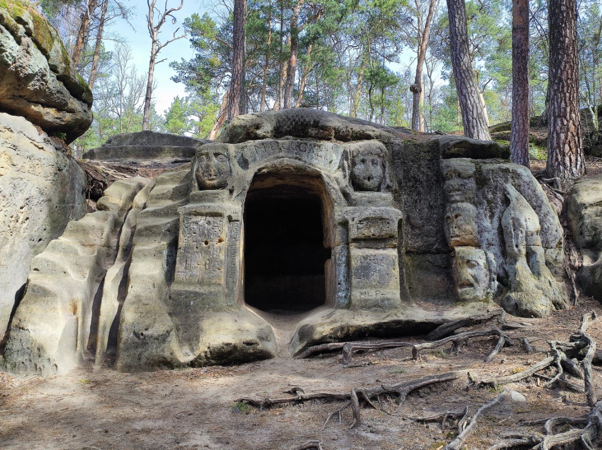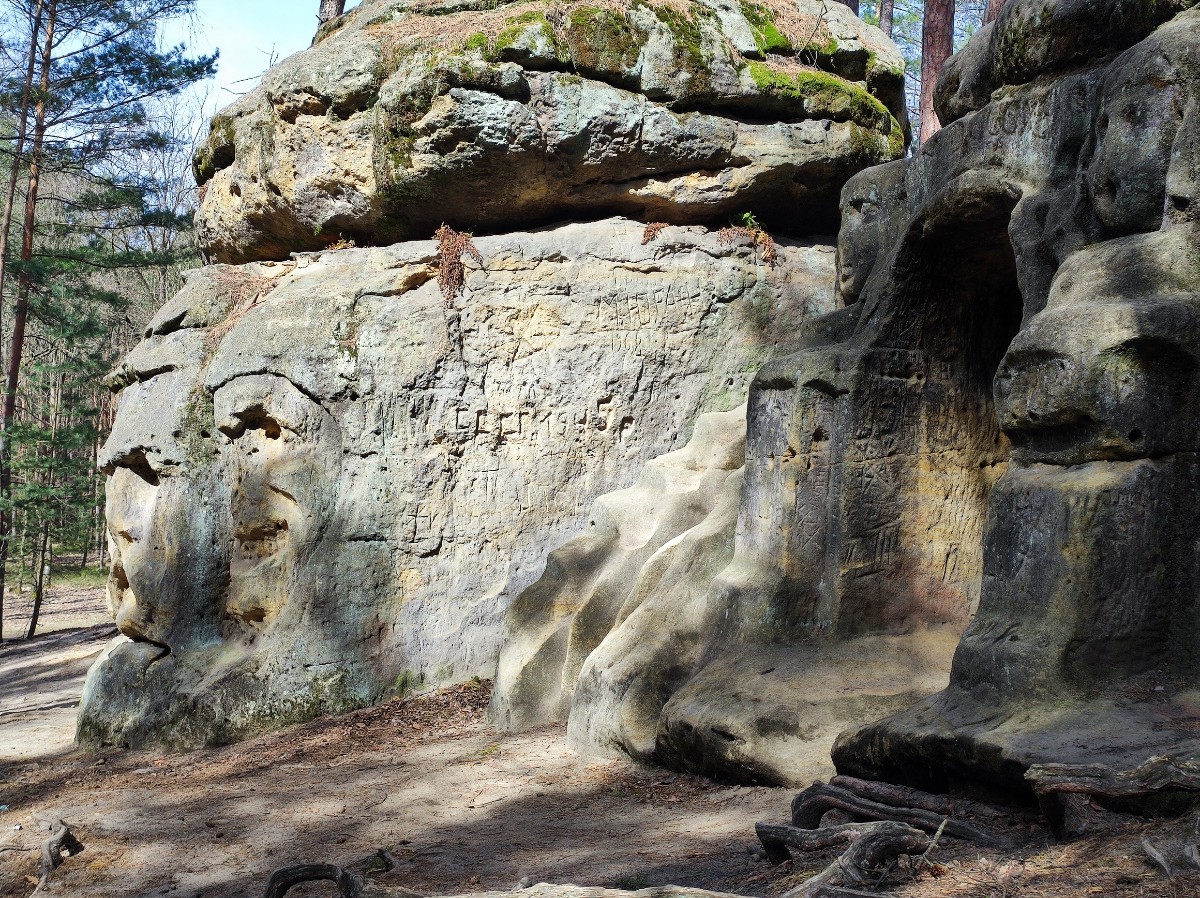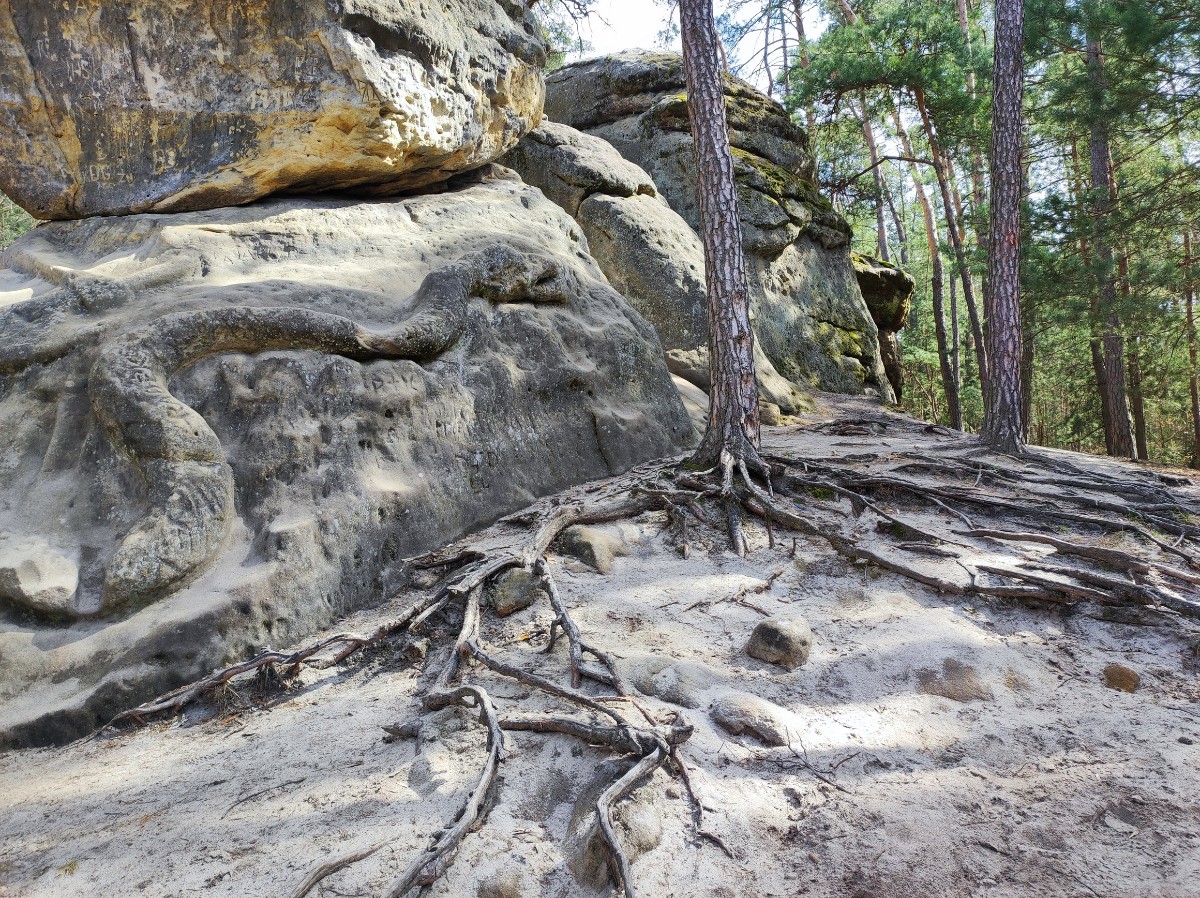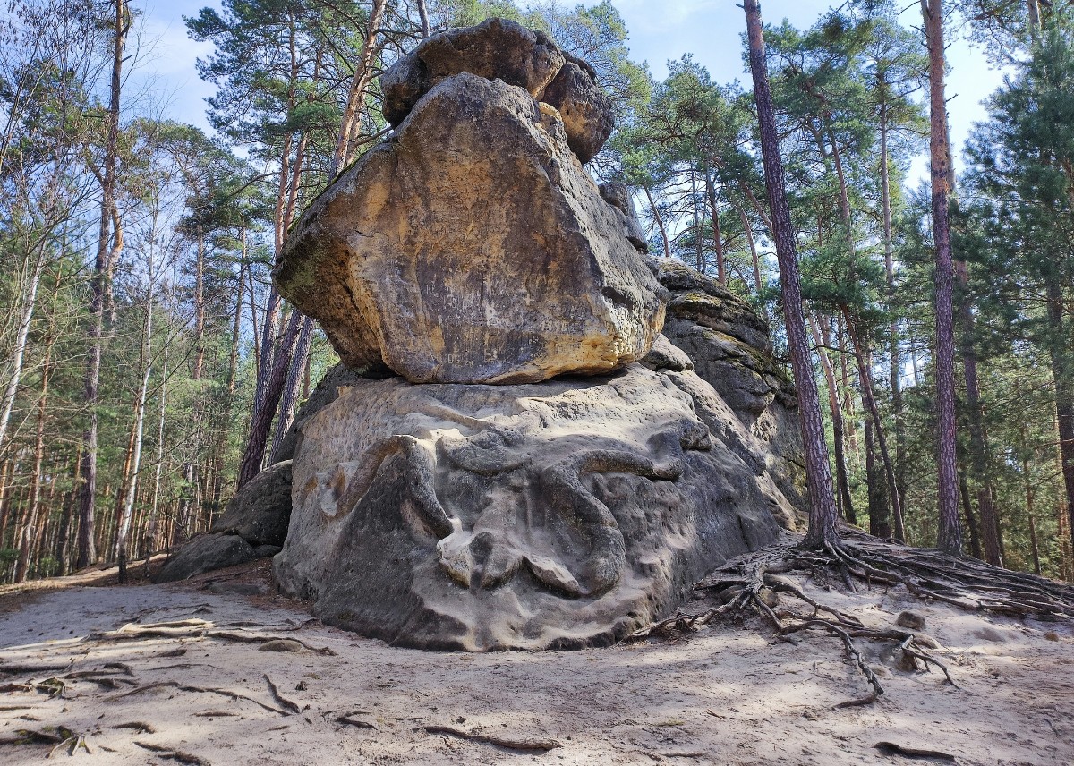 V Želízech jsme se vydaly na procházku lesem po žluté značce k pískovcovým skalám, které před rokem 1850 upravil tehdy mladý kuchař z liběchovského zámku, pozdější sochař Václav Levý. Došly jsme k harfenici, která bohužel vlivem času, ale hlavně asi vandalů, doznala značné újmy. Harfenici provázejí 4 velké hlavy a jeskyňka i s vytesanou lavicí. Tady jsme poseděly a posvačily a vydaly se dál k hadovi. Had měří 9 m a v polovině je přeťatý sekerou, která se nad ním vznáší. Hada prý Václav Levý vytvořil zřejmě proto, že se na skalách ve zdejších lesích vyhřívala klubka zmijí. Po lese poletovali první motýli, ptáci si prozpěvovali jarní písničky, nebe bylo modré a my jsme zvedaly hlavy vzhůru a klábosily.