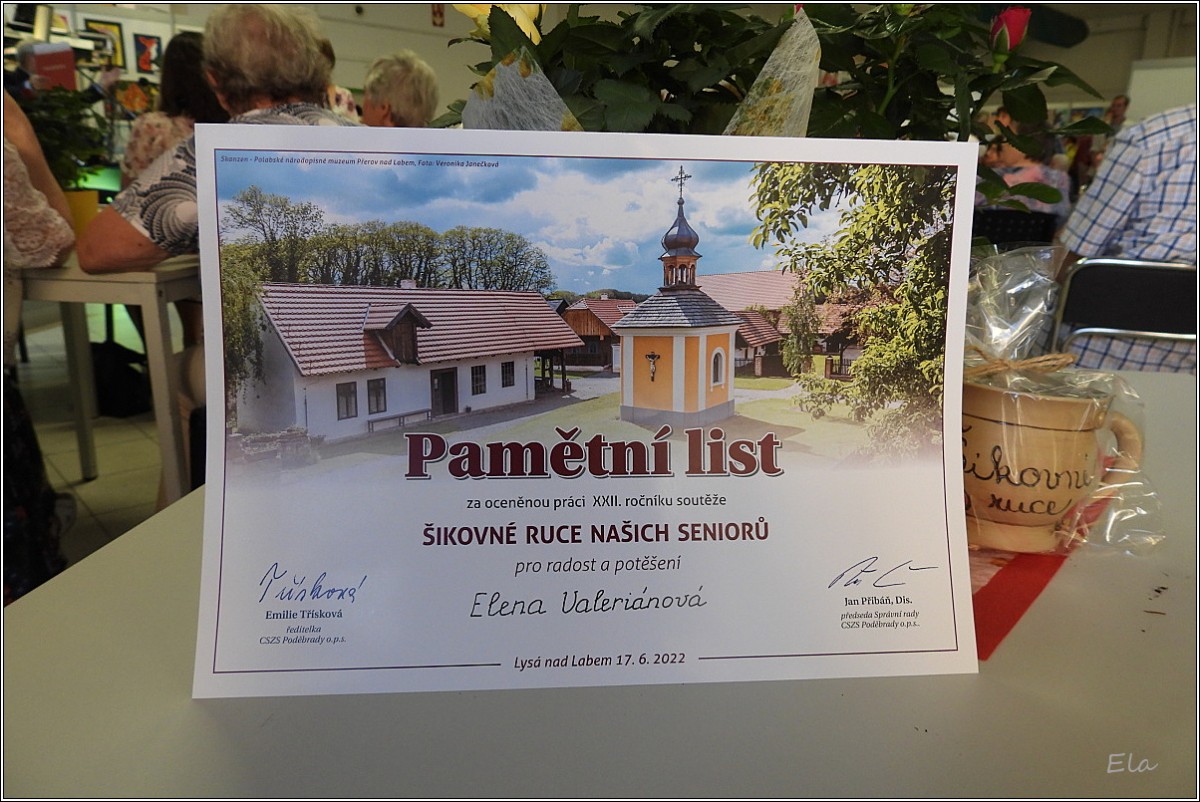 Ve středu ráno změna, s požehnáním OÚ je rozhodnuto, v pátek jedeme autem do Lysé nad Labem na vyhodnocení soutěže a na výstavu seniorů a taky tak trochu reprezentovat ty naše jesenické Mikulovice (často si nás pletou s Mikulovicemi u Znojma a ptají se na víno). Štěpánka se prostě nevzdává.