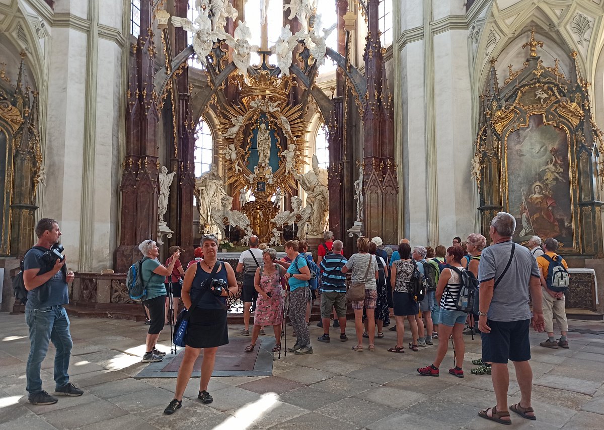 Tento den padl teplotní rekord v teplotě v měsíci červnu na našem území. Teploty dosahovaly až 35 stupňů. To nás ale neodradilo před naplánovaným programem. Po snídani nás autobus vysadil před velkým "odrbaným" klášterem od významného stavitele Santiniho v Kladrubech. Neměli jsme ani potuchy o tom, jaká krása se za oprýskanými zdmi skrývá. Když nám průvodce otevřel dveře klášterního kostela, doslova se nám zatajil dech. Nemusíme jezdit za památkami do Itálie a Francie - máme je doma. Po prohlídce tohoto skvostu jsme se vydali podél řeky Mže a přes dva kopce do města Stříbra s krásnou renesanční radnicí, kam jsme dorazili přesně v pravé poledne. Byl čas na lehký oběd. Následně nás autobus převezl do Vranova k přehradě Hracholusky. Tam jsme se mohlli projít po břehu při hledání přístavu, okoupat se a následně strávit 1,5 hod projížďkou na výletní lodi, a při vychlazeném pivu kochat se okolní krajinou. V nohách jsme měli ten den 8 km.