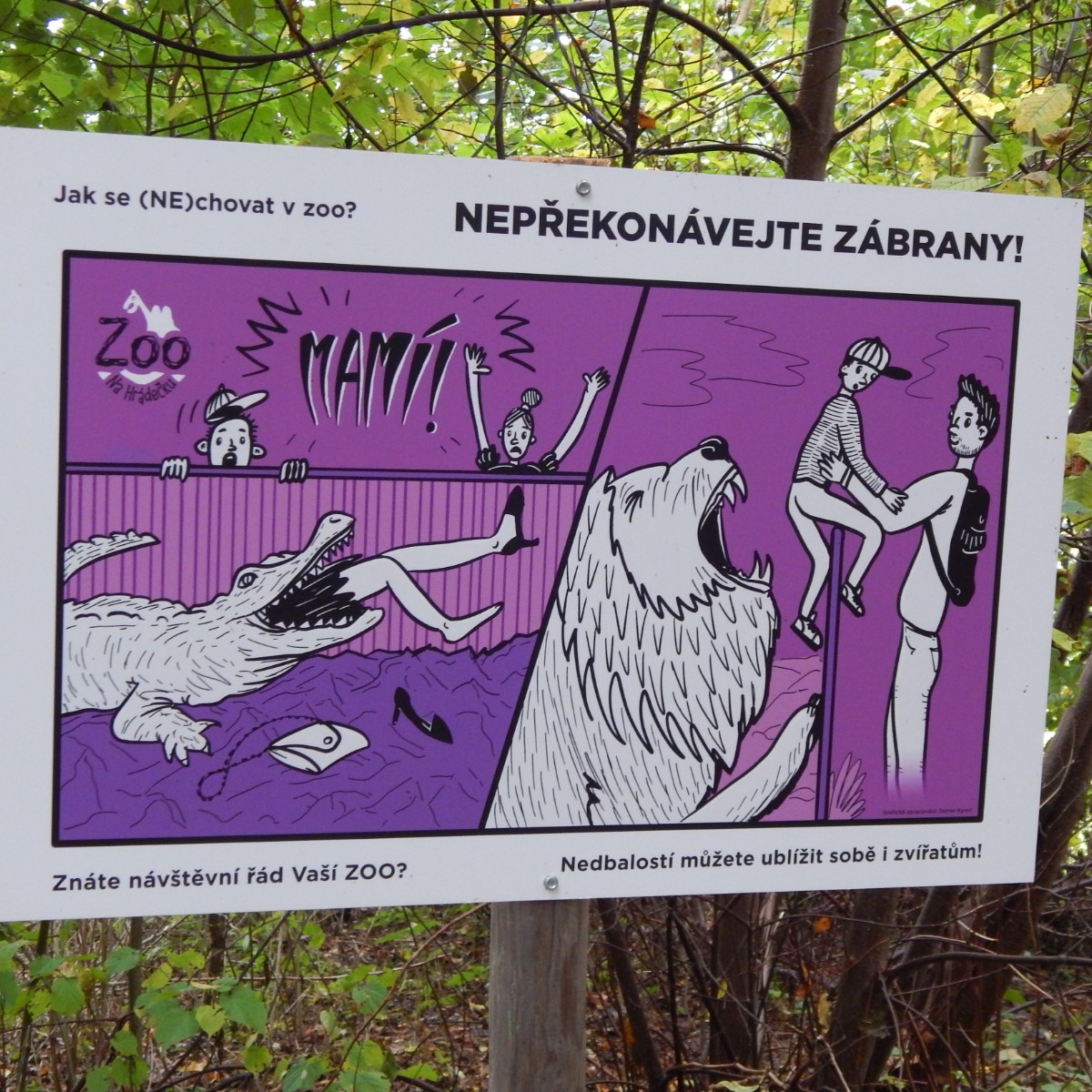 Protože někteří návštěvníci zoologických zahrad zapomínají, jak se zde mají chovat, ve zdejším areálu jim to přípomínají cedule s vysvětlením v grafické podobě určené nejen dospělým, ale i dětem. Že se jedná o bezpečnostní prvky, je zřejmé na první pohled.