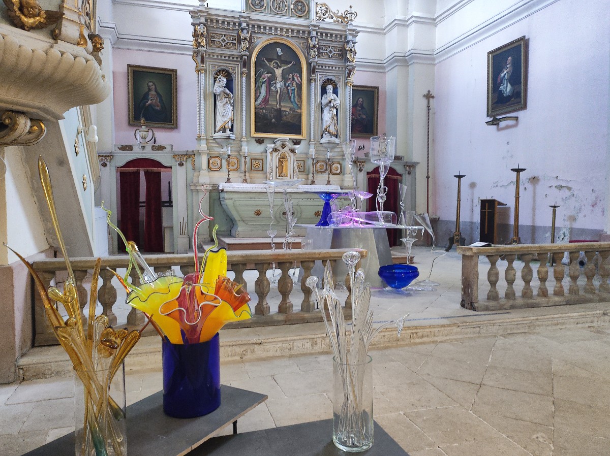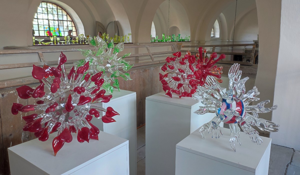Dnes se podíváme jen o pár kroků dál do kunratického klasicistního kostela Povýšení Sv. Kříže, navazujícího na sklárnu. Na jaře 2020 se začal po dohodě s obcí Kunratice u Cvikova a Římskokatolické farnosti ve Cvikově realizovat projekt Jiřího Pačinka na oživení kostela a jeho propojení se sklárnou. Kostel se zakrátko zaplnil skleněnými předměty a dostal přídomek Křišťálový chrám. Slavnostně byl otevřen 12. června 2020 při tradiční Noci kostelů. Zdobí ho křišťálový lustr Trnová koruna, korunovační klenoty i sada skleněných antivirů Jiřího Pačinka, vzniklých jako jeho reakce na koronavirou krizi. Ve vstupní hale visí lustr Blanky Matragi a nad varhanami lustr Barbory Jarošové. To není samozřejmě všechno. Celičký chrám je zaplněný sklem a nebudete vědět, kam se podívat a co obdivovat dřív. Expozice se průběžně mění a nikdy ji nenajdete úplně stejnou jako při předchozí návštěvě. Spojení uměleckého skla s prostředím kostela má neopakovatelné kouzlo.