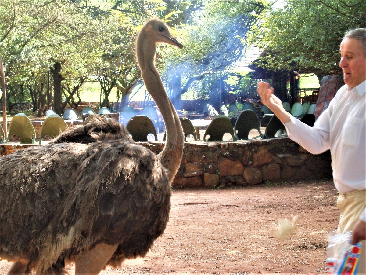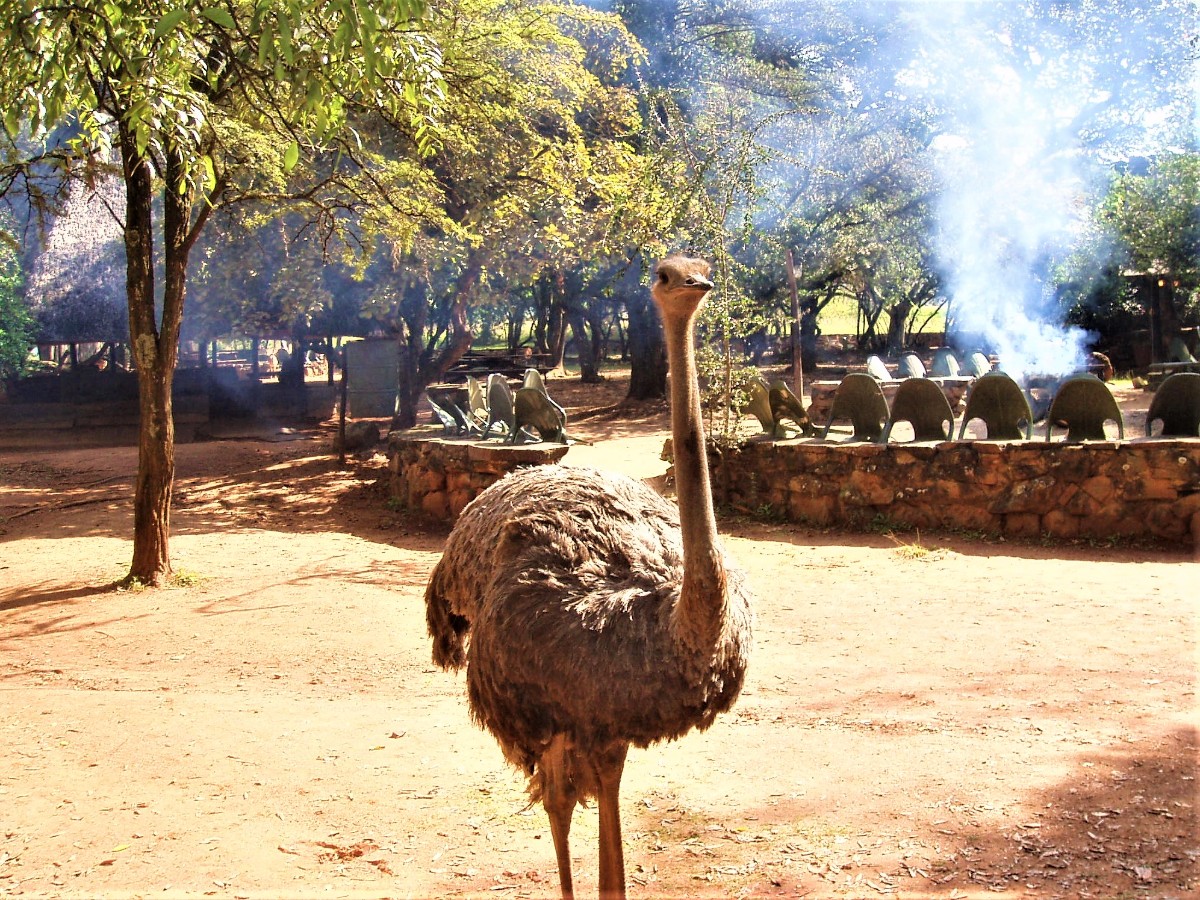 Naše zkušenosti s členy početné královské rodiny, která čítá přibližně 120 000 osob, nebyly zrovna příjemné. Především recepční v táboře uprostřed divočiny, kde jsme byli v Eswatini ubytováni, nám dávala očividně najevo, že se s neurozenými lidmi nehodlá příliš bavit. Na otázky odpovídala neochotně a byla arogantní. Raději jsme tedy vyrazili na procházku kolem tábora sami. Potkat divoká zvířata tam bylo velmi snadné – již mezi chýšemi, ve kterých byli ubytováni hosté, se volně procházela divoká prasata bradavičnatá, malé antilopy a pštrosi. Byli jsme ubezpečeni, že prasata nejsou nebezpečná. Když jsme ale vyšli z tábora, vyděsil nás pštros, který se za námi s dupotem rozeběhl. Vzpomněli jsme si na informaci obdrženou v Jihoafrické republice, kde jsme byli před kontaktem s divokými pštrosy varováni, protože pštros může člověku svými pařáty rozpárat břicho. Ukázalo se však, že tento svazijský pštros se pouze dožadoval krmení. Druhý den ho manžel potkal znovu přímo v táboře a chtěl mu dát kus chleba, ale nedočkavý pštros ho klovnul do ruky s chlebem tak silně, že manžela ruka bolela ještě několik dní. První noc v táboře jsme rovněž měli incident s opilými hosty ze Svazijska. Dlouho do noci hlasitě hulákali a když je manžel požádal o klid, byl označen za rasistu. V Africe se toto občas stane, černoši nelibě nesou napomínání od bělocha a jakoukoli výtku považují za rasismus. Ráno jsme si stěžovali na recepci a dostali jsme novou chýši na okraji tábora s výhledem do krajiny. Večer jsme tam pozorovali zebry. Po setmění se z tábora nesmělo vycházet, protože v noci se po cestách pohybovali hroši. Hroch je v Africe nejnebezpečnější zvíře, každý rok zabije více lidí než lvi. Nikdy se mu nesmí zkřížit přístupová cesta k vodě.