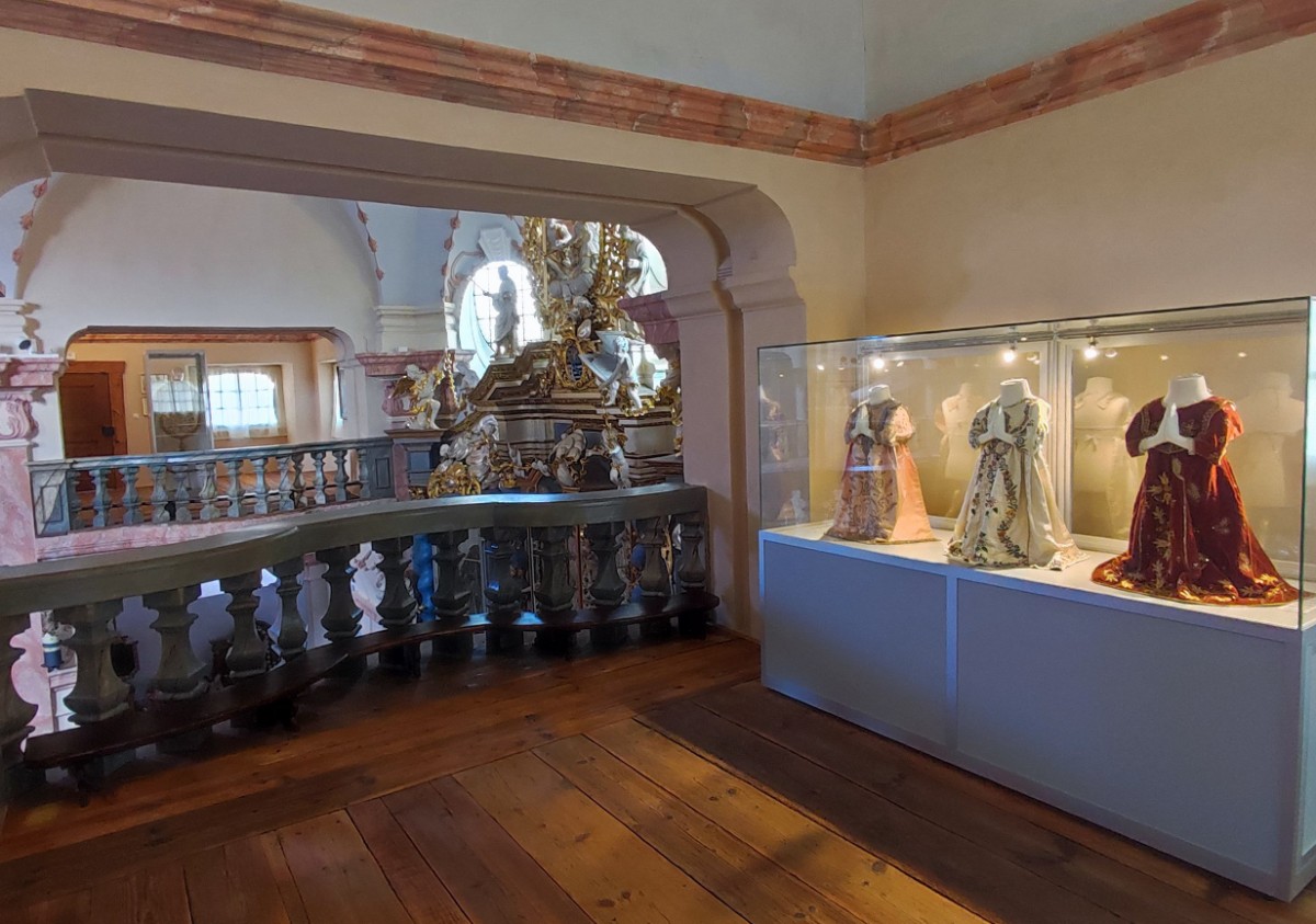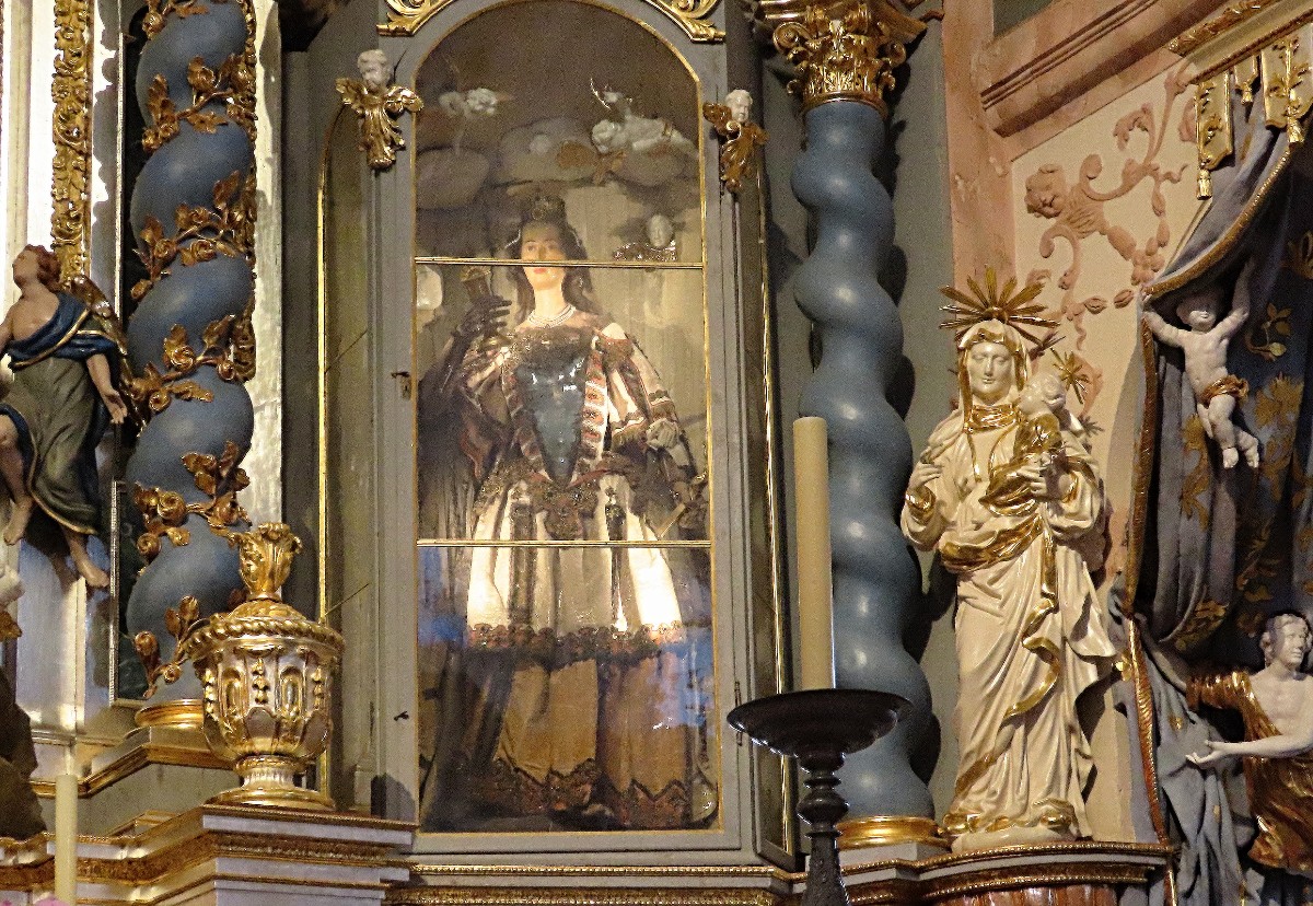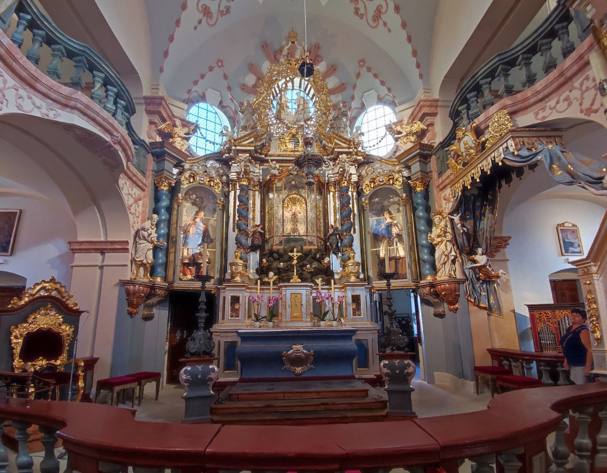 My jsme se do Horní Police vypravili v neděli odpoledne a dobře jsme udělali. Areál je jinak sice otevřený, ale nepodíváte se do kostela. Ten je návštěvníkům přístupný právě jen o nedělích od 13 do 18 hodin. Ve chvíli, kdy jsme na místo dorazili, tam kromě nás nikdo nebyl. Ujala se nás ochotná průvodkyně, která nás provedla kostelem a seznámila nás s jeho historií i různými zajímavostmi. Ukázala nám např. i dvě svíce z 1. poloviny 16. století, které nebyly nikdy zapáleny. Traduje se, že při jejich výrobě byl do materiálu přimíchán střelný prach a z toho důvodu nikdy nikdo nenašel odvahu vyzkoušet jejich rozsvícení. Zavedla nás i na ochoz, odkud jsme se dívali do prostoru překrásně opraveného kostela shora a kde je i umístěna ve vitrínách výstava o historii areálu a některé liturgické předměty.