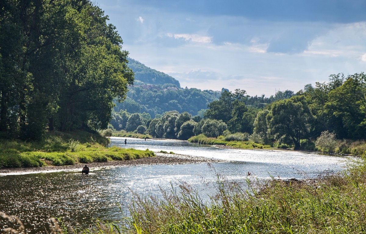 I když bylo sobotní odpoledne, cyklistů na stezce příliš nebylo. Sem tam se objevil jedinec na in-linech, občas nás míjela rodina na kolech. U rodin jsme si všimli zajímavého jevu - předškolní děti šlapaly na kolech mnohem radostněji, než děti starší.  Ale kvůli sledování nálady malých cyklistů jsme zde nebyli. Uvědomila jsem si, že poprvé v životě vidím řeku Berounku naživo a pěkně zblízka. Až dosud jsem si znala pouze z okénka vlaku, kterým jsem kolem ní párkrát za svůj život projela. A vždycky jsem si při letmém pohledu na ni pomyslela, že by stálo za to ji navštívit  osobně. Připadala mi přes okénko vlaku tak romantická! I ono sobotní odpoledne se krásně třpytila v letním slunci a vinula se údolím. Odkrytý kamenitý pás u břehů však signalizoval, jak mnoho v letošním horkém létě vyschla. I přesto tady probíhala jakási soutěž rybářů.  Vytušili  jsme to podle jejich pravidelného rozmístění na obou březích řeky a hlavně z incidentu, který vznikl rybáři a skupinou dětí, které měly snahu se v řece osvěžit.