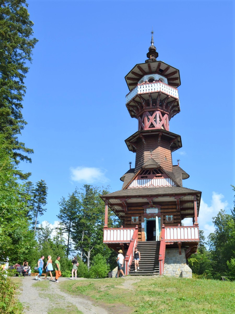 Další den jsme se vydaly autem do Rožnova pod Radhoštěm. Navštívily jsme Valašské muzeum v přírodě, které sestává z Dřevěného městečka, Valašské dědiny a Mlýnské doliny. Nad areálem na Karlově kopci se tyčí Jurkovičova rozhledna. Byla postavena v roce 2012 podle projektu Dušana Jurkoviče. Je vysoká 31 m a vede k ní cesta dlouhá asi 1 km s převýšením 100 m. Posílené výbornými haluškami jsme ji zdárně pokořily. Zajímavostí je, že je to první Jurkovičův samostatný projekt, který zpracoval ve svých 29 letech v roce 1896.