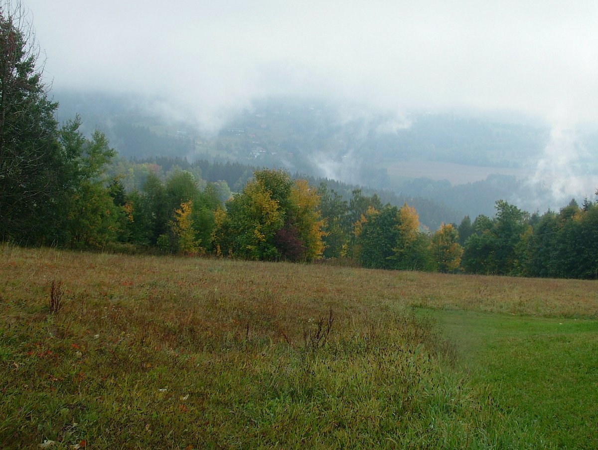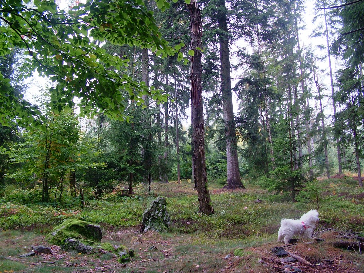 Chodily jsme měkoučkým mechem, klouzci v něm úplně svítili, čichala jsem tam kolem modřínů. Panička mi řekla, ať tam nelítám, že až zase na louce. Sedly jsme si na lavičku a pozorovaly hory směrem na Zlaté návrší a Medvědín. Šly jsme do lesíka i tam se krásně chodilo, vede tam úzká cestička. Prošly jsme a na opačné straně jsme našly další krásné místečko, sebraly klouzky a zase jsme si sedly. Panička řekla, že koukáme na Jizerské hory a Český ráj. Byl to moc hezký pohled, všechno je teď pěkně barevné. Modré hory v dálce, zelené lesíky a v tom všem se míchá žlutá barva s červenou.